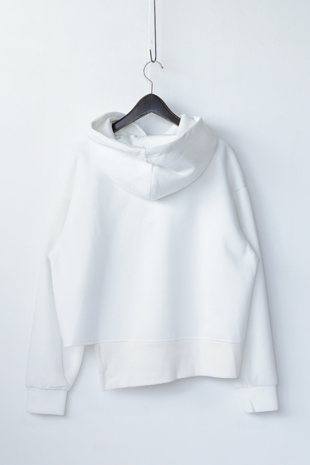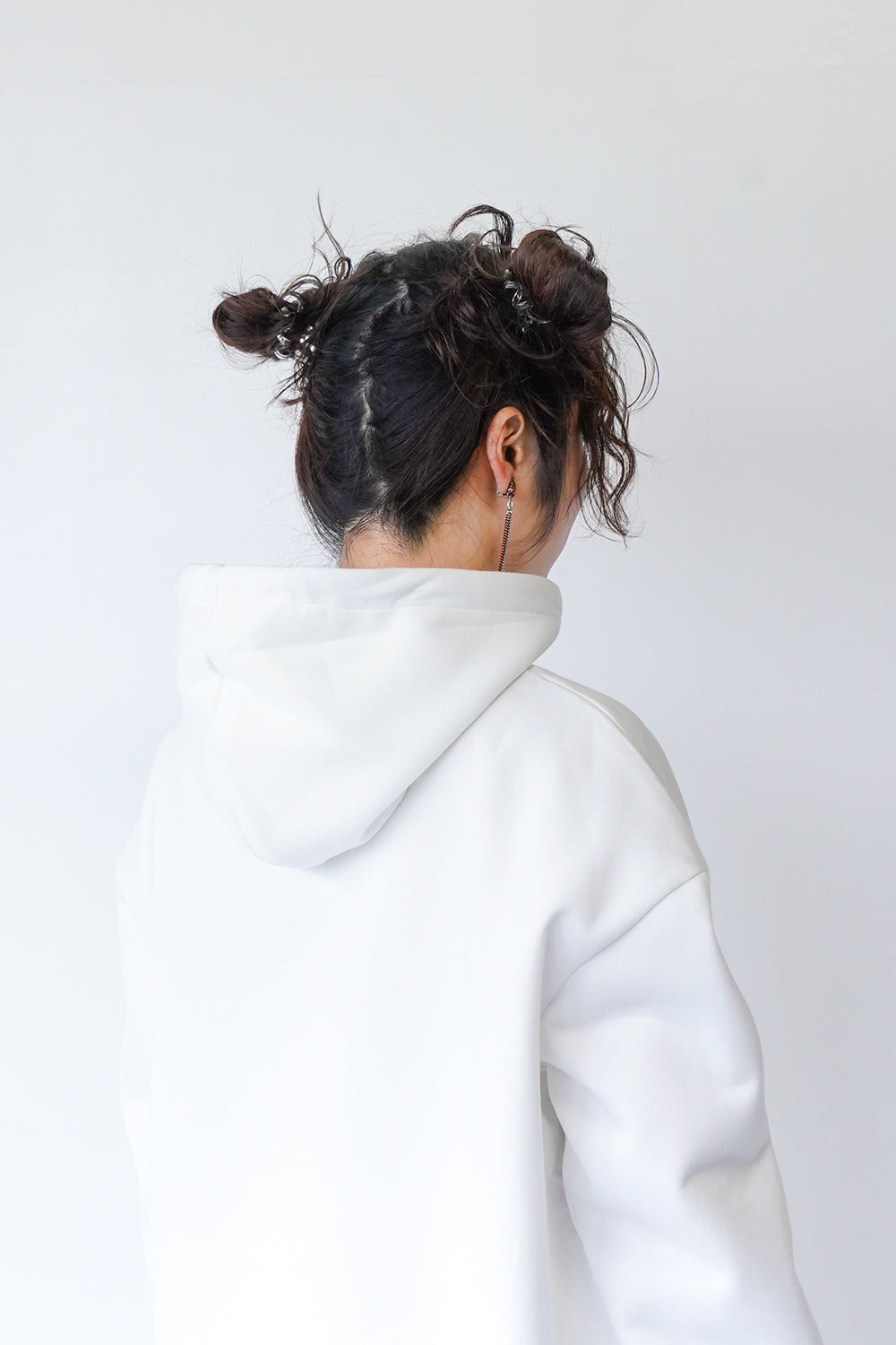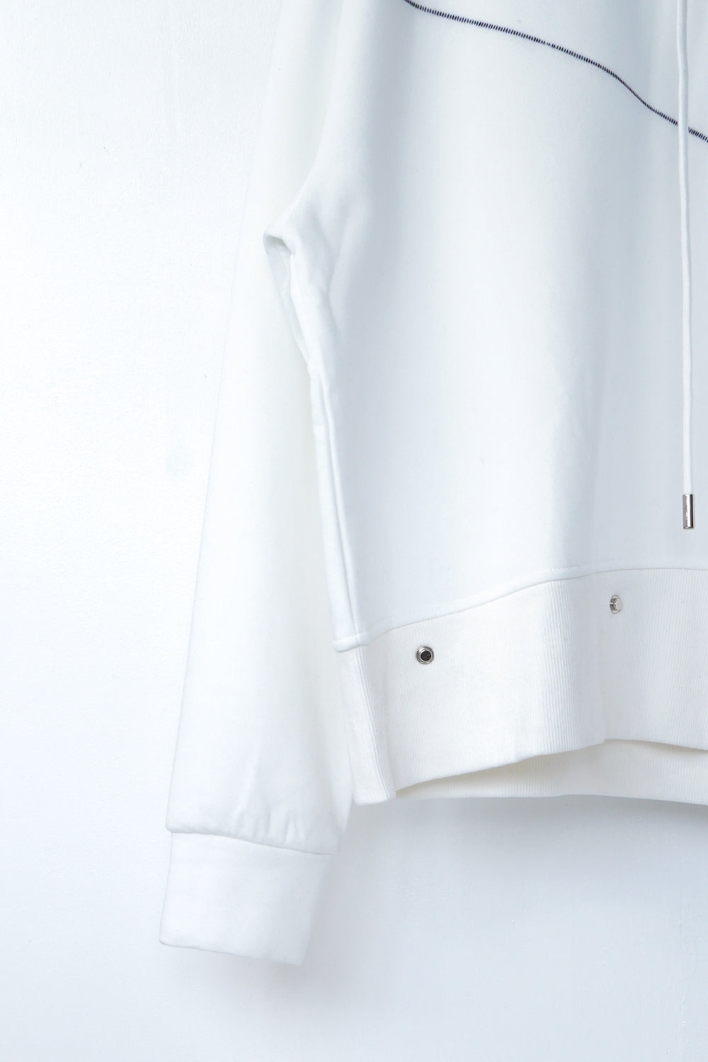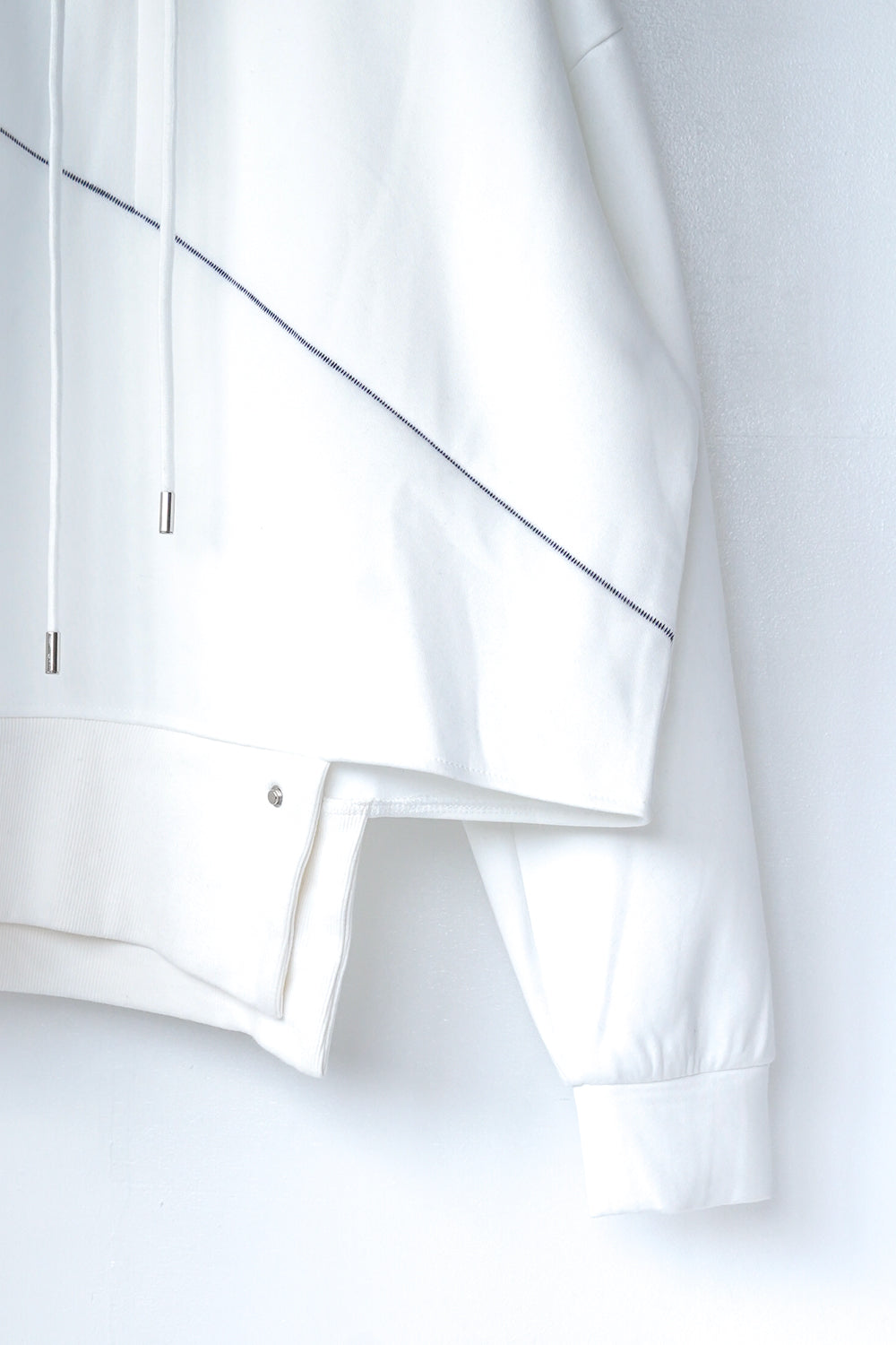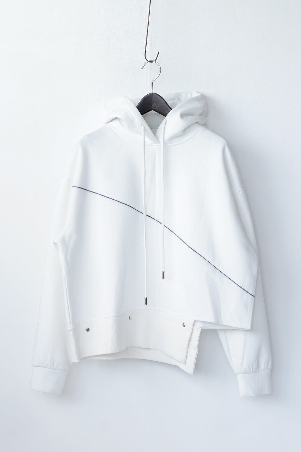 ステッチデザインがモードな印象の裏起毛パーカ。サイズ感はゆったりとしていて裏起毛仕様でとても暖かくておすすめ。裾の大きなリブとスタッズボタンがアクセントに。アンバランスな丈感も遊び心が詰まった1枚。