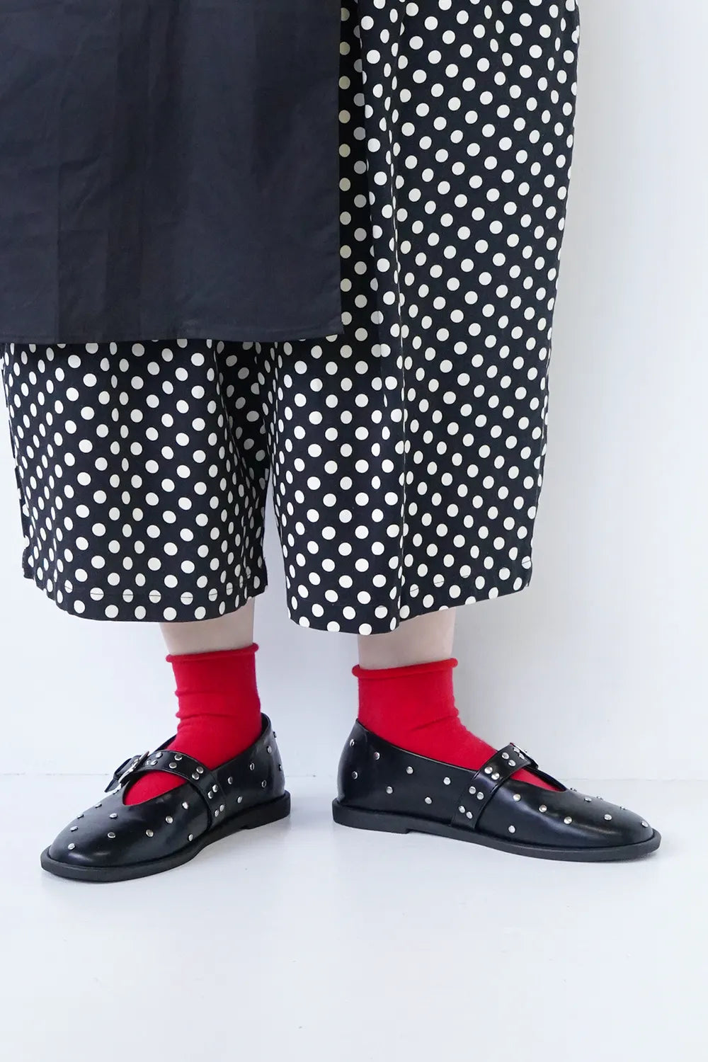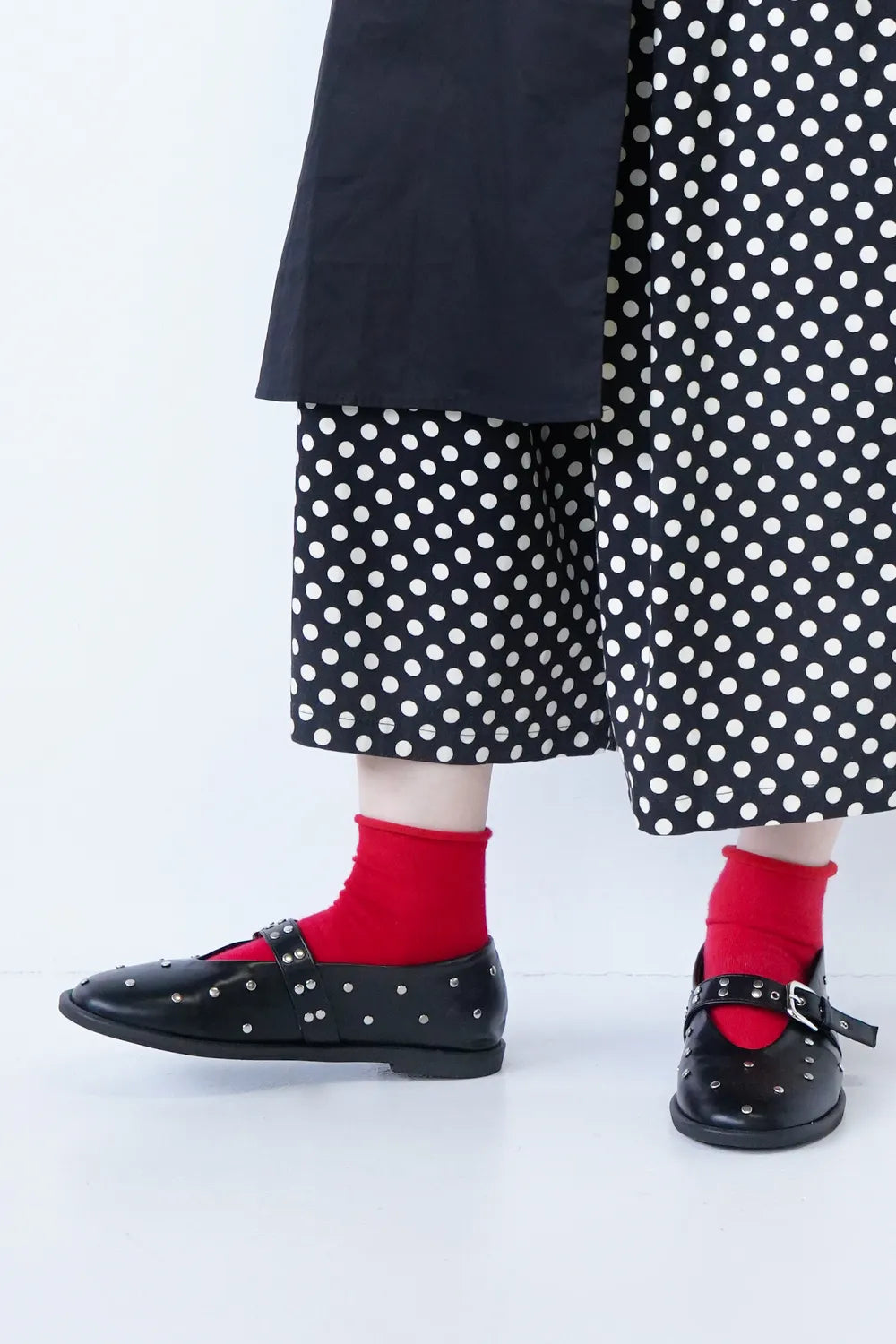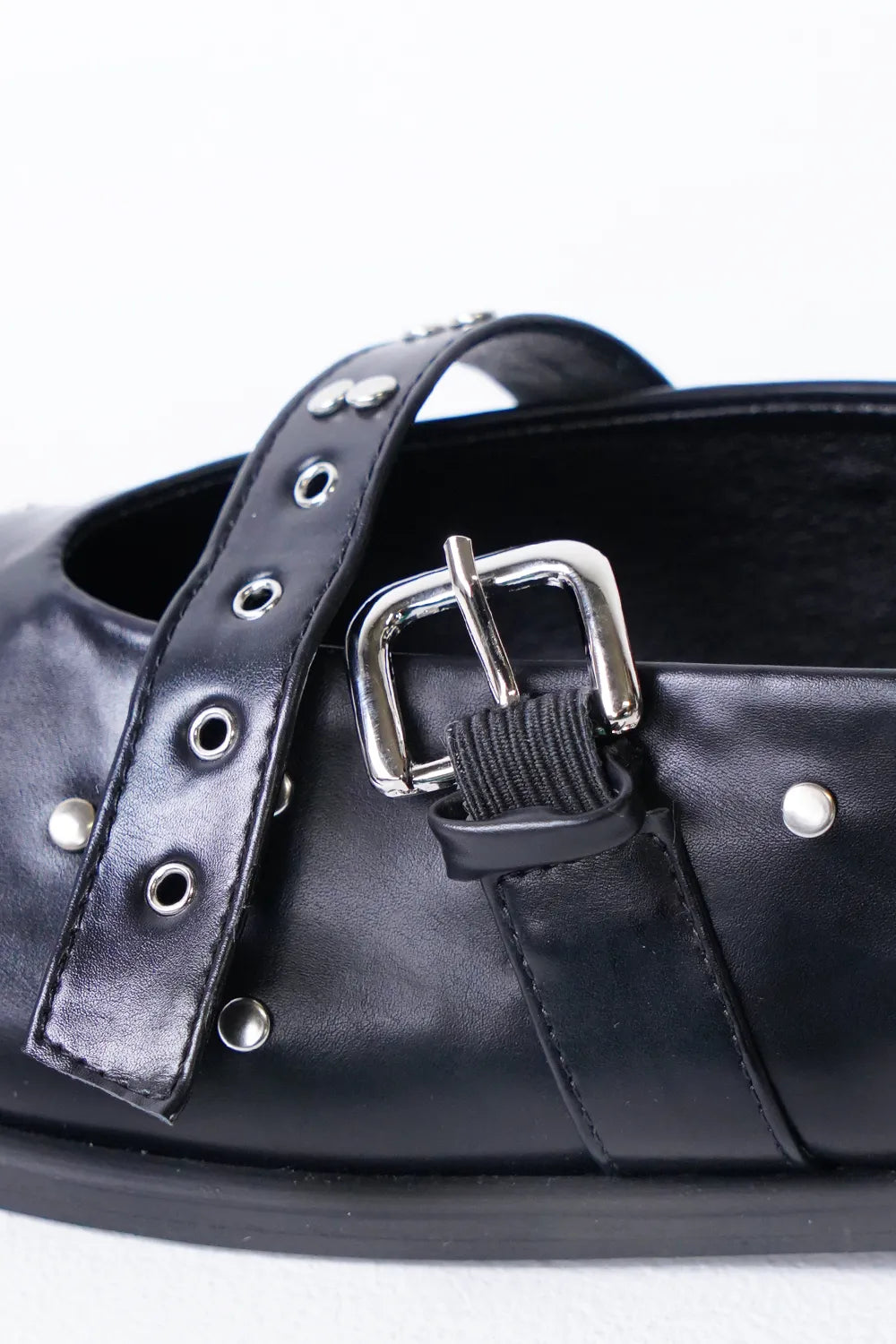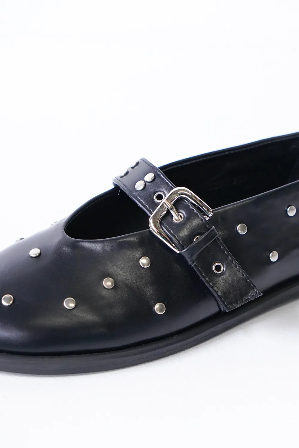 エッジの効いたスタッズデザインが個性的なフラットシューズ。丸みを帯びたラウンドトゥデザインとフラットなソールで安定感のある1足。軽くて柔らかい素材感で履き心地◎ベルトは4段階で調整でき裏側はゴム仕様。