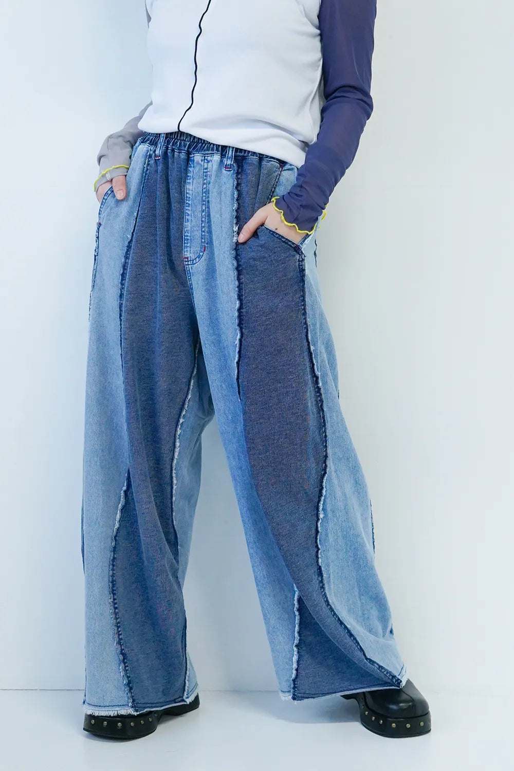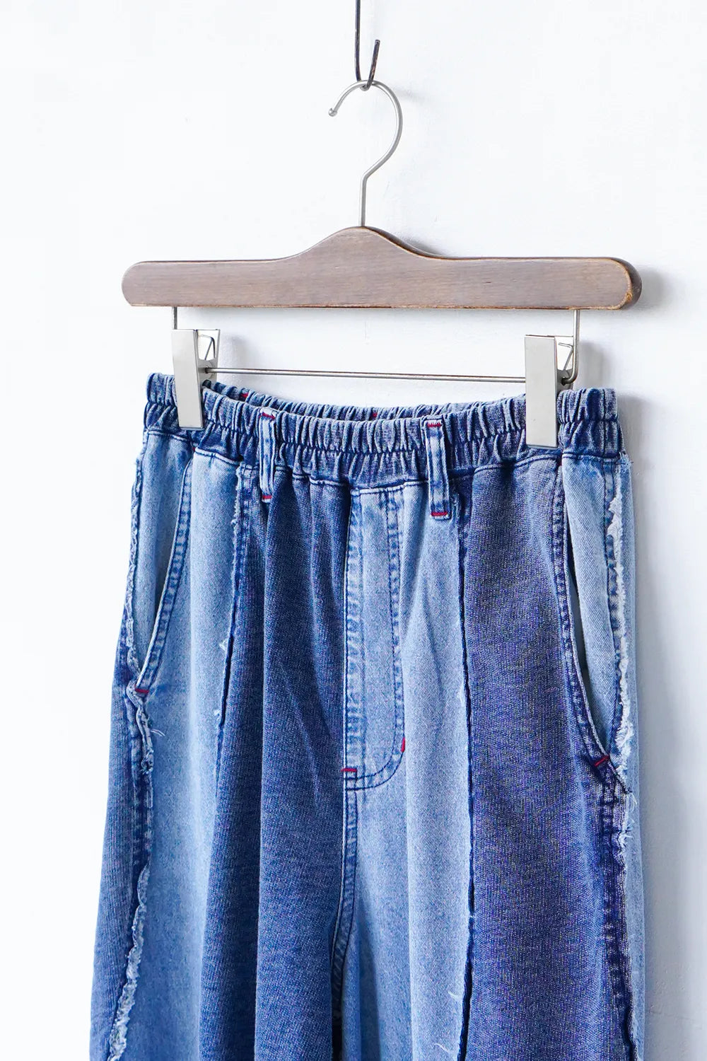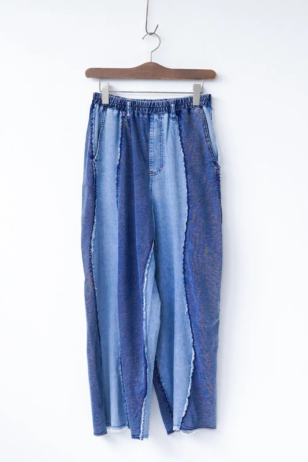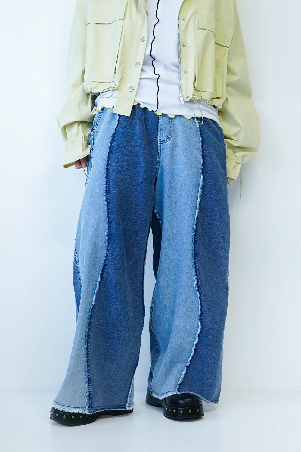 個性的な切替デザインがポイントのデニムパンツ。ケミカル加工が施された生地を使用。波打つウェーブラインが特徴的。薄手のデニムなので夏まで長く着用いただけます。ウエストはゴム仕様で紐で調整も可能。