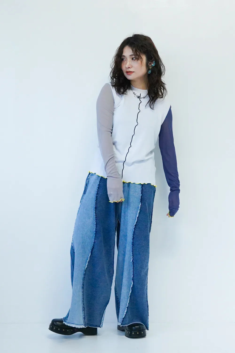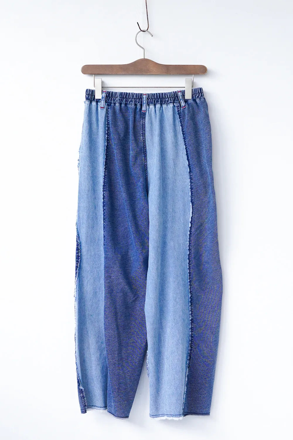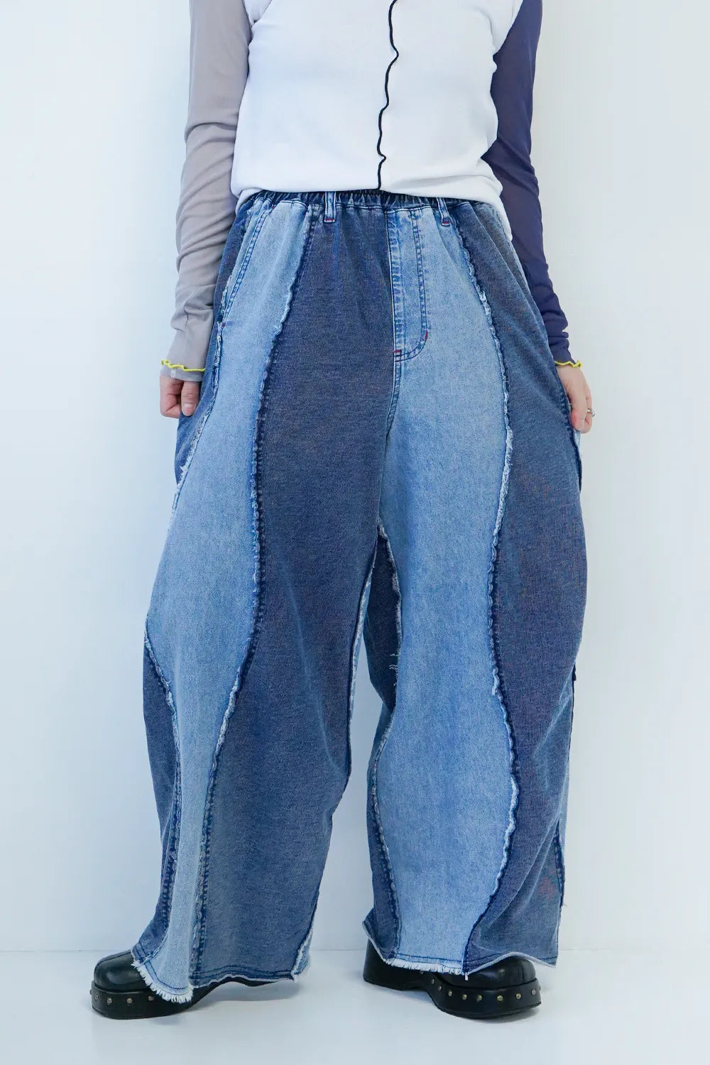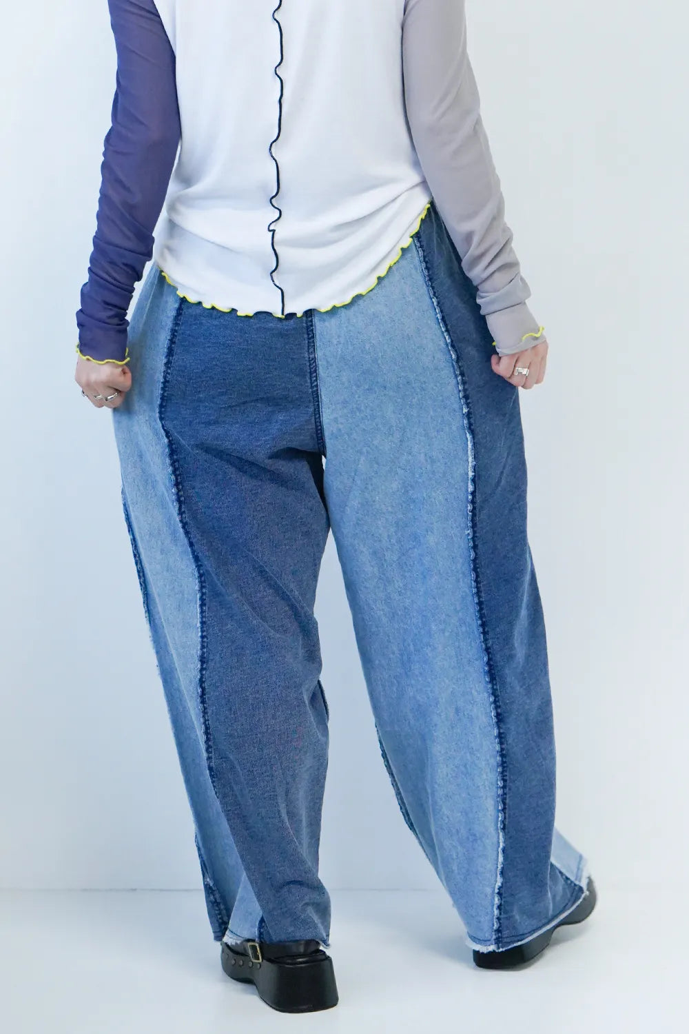 個性的な切替デザインがポイントのデニムパンツ。ケミカル加工が施された生地を使用。波打つウェーブラインが特徴的。薄手のデニムなので夏まで長く着用いただけます。ウエストはゴム仕様で紐で調整も可能。