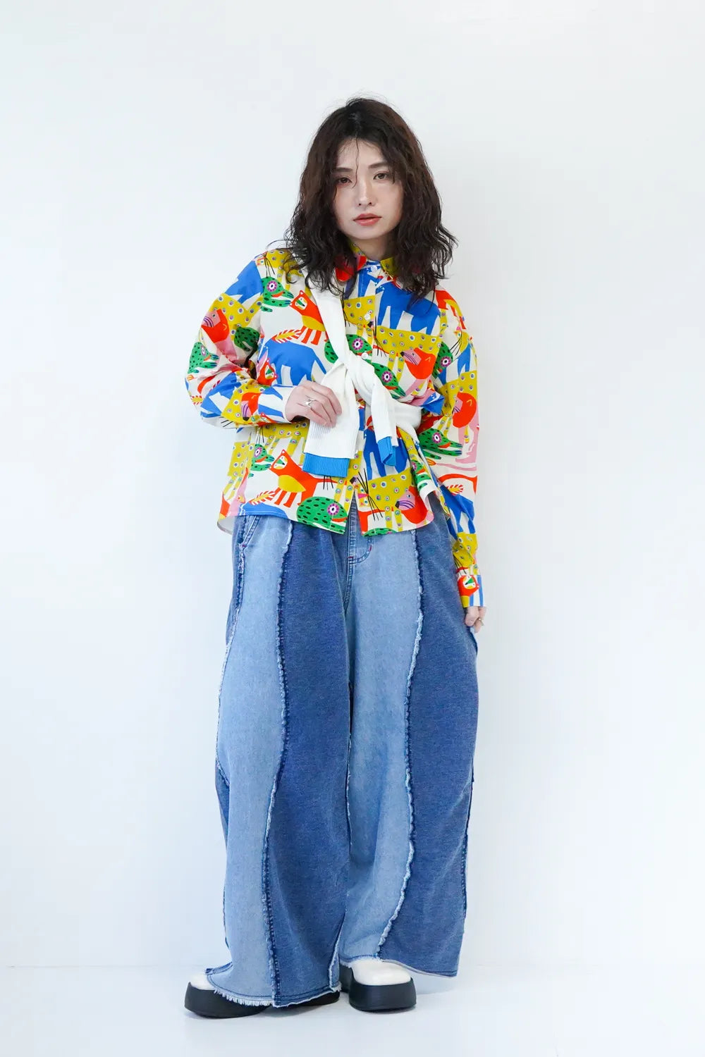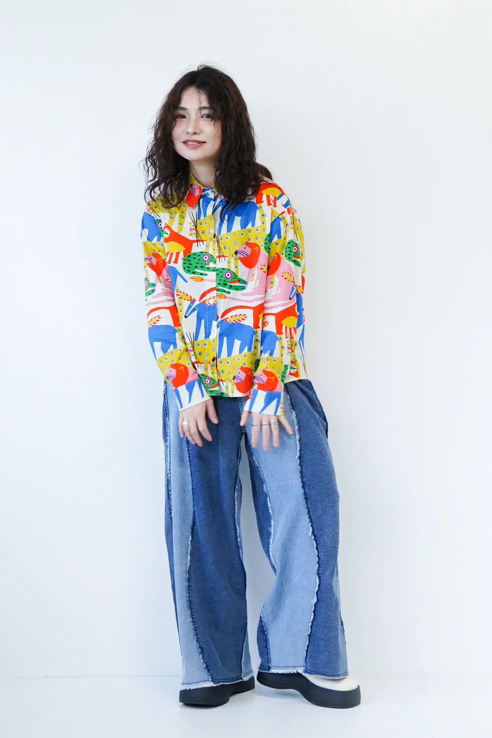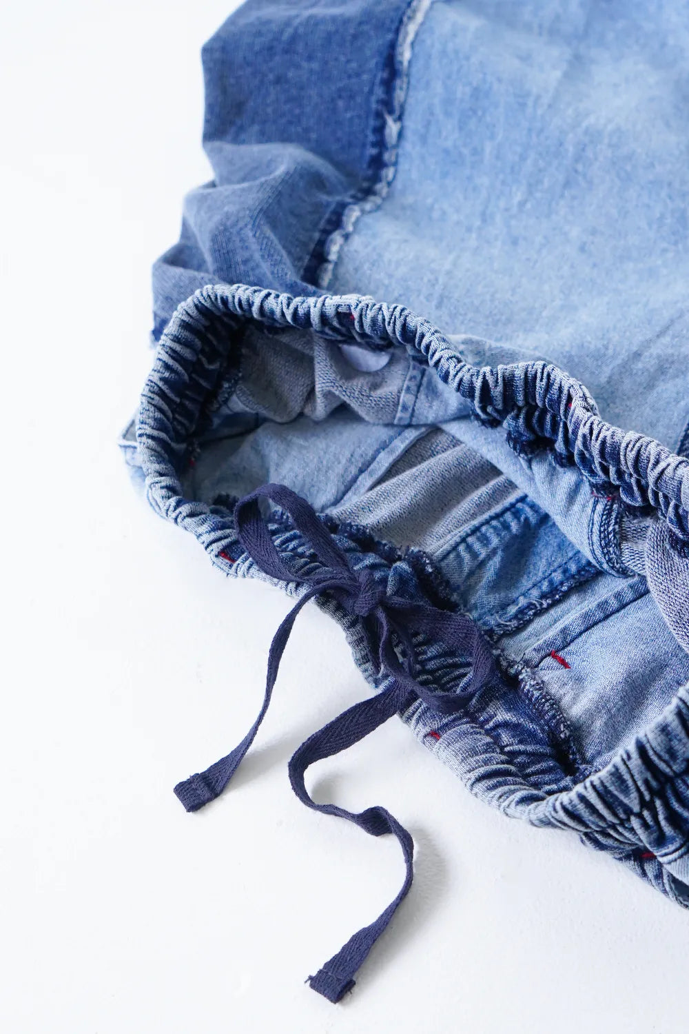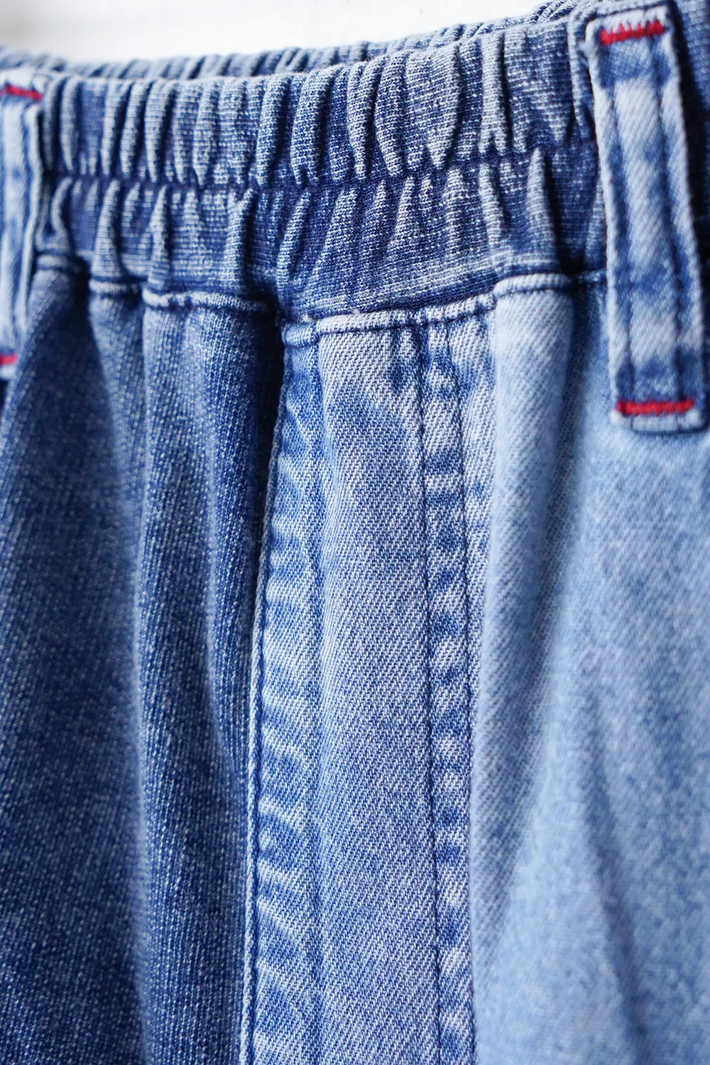 個性的な切替デザインがポイントのデニムパンツ。ケミカル加工が施された生地を使用。波打つウェーブラインが特徴的。薄手のデニムなので夏まで長く着用いただけます。ウエストはゴム仕様で紐で調整も可能。