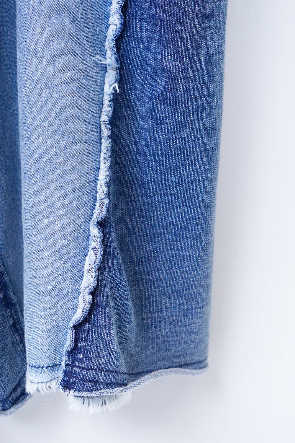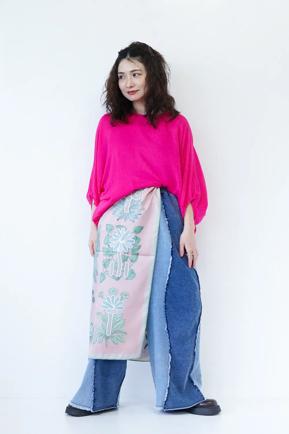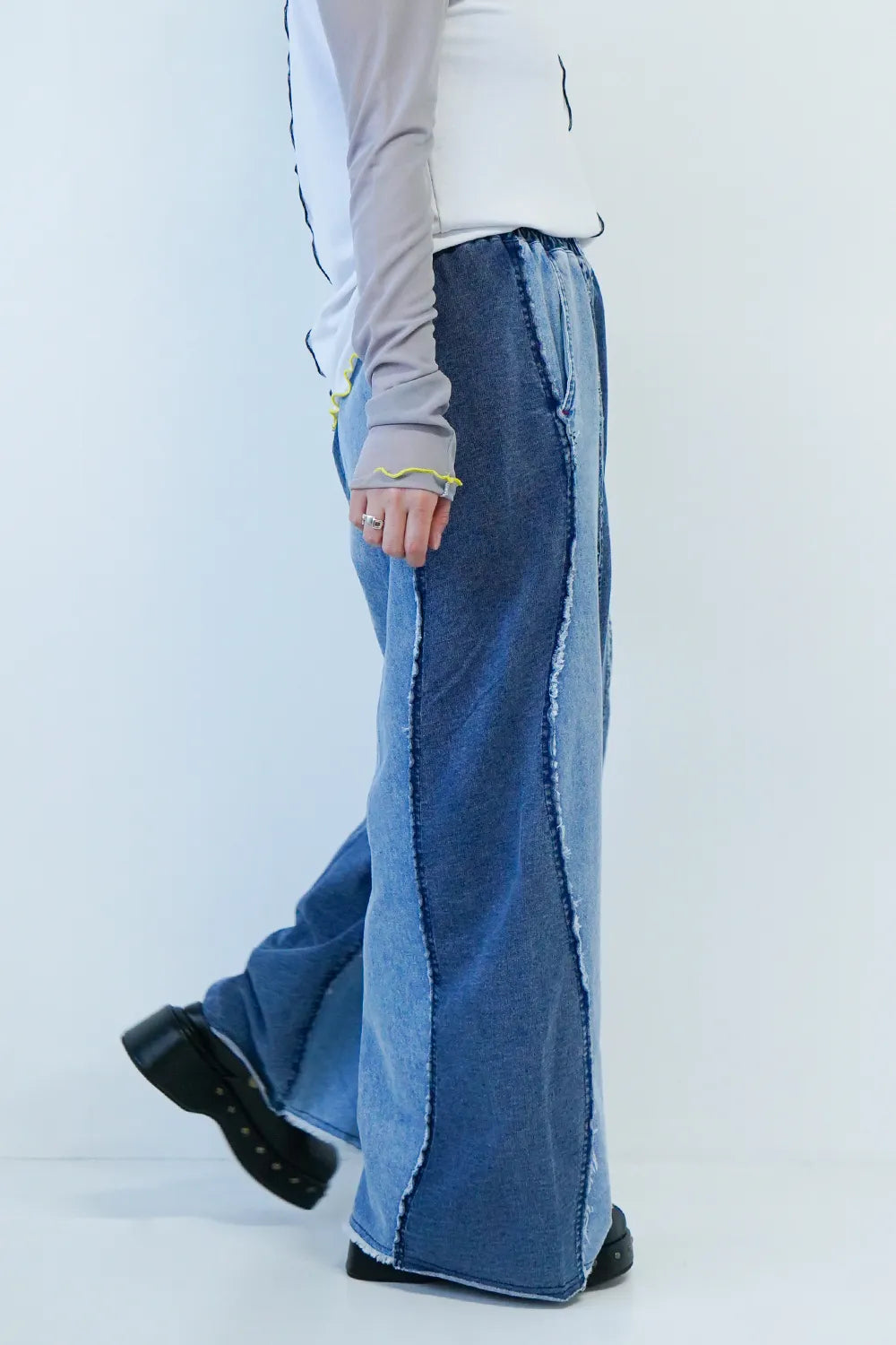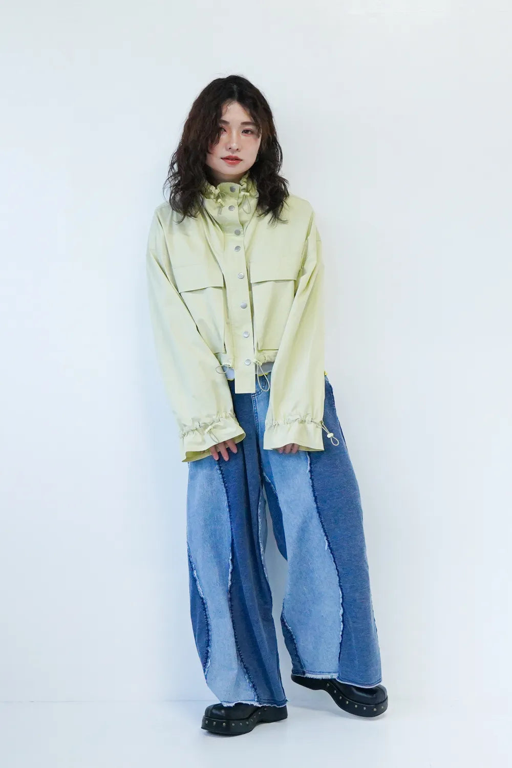 個性的な切替デザインがポイントのデニムパンツ。ケミカル加工が施された生地を使用。波打つウェーブラインが特徴的。薄手のデニムなので夏まで長く着用いただけます。ウエストはゴム仕様で紐で調整も可能。