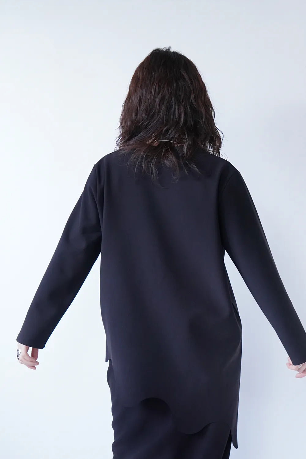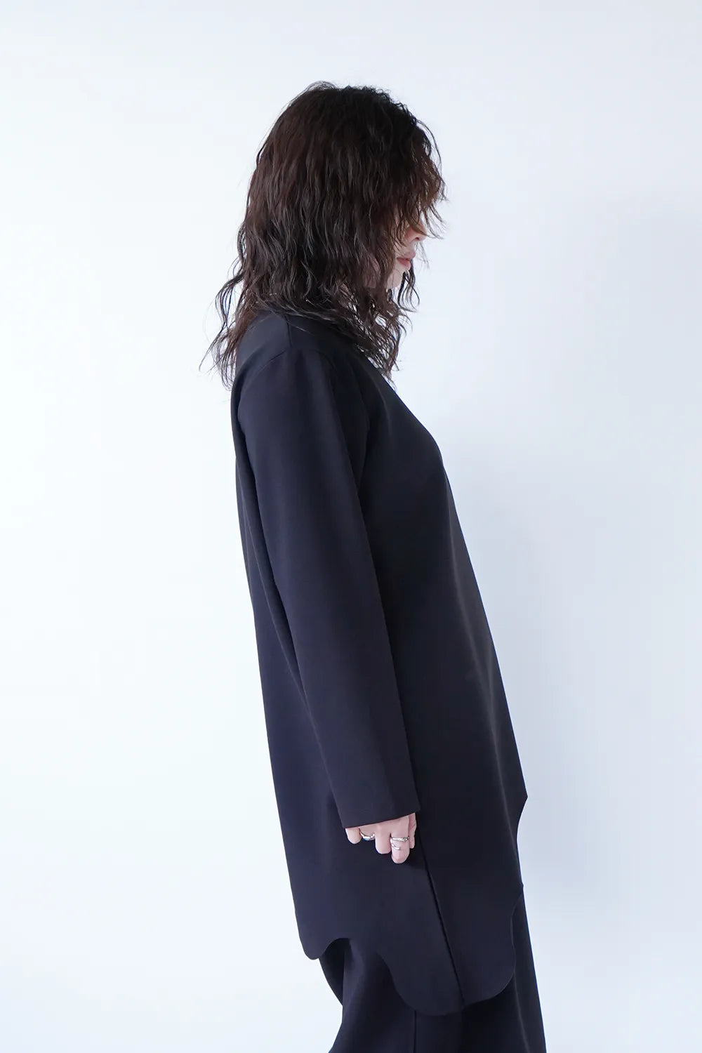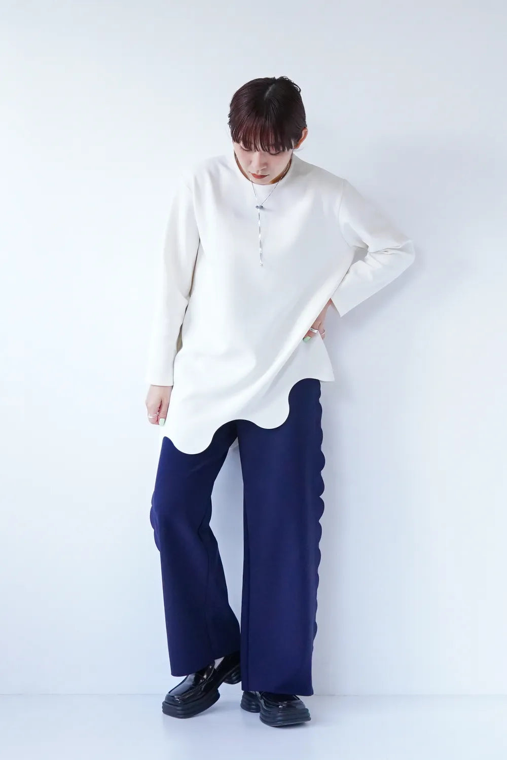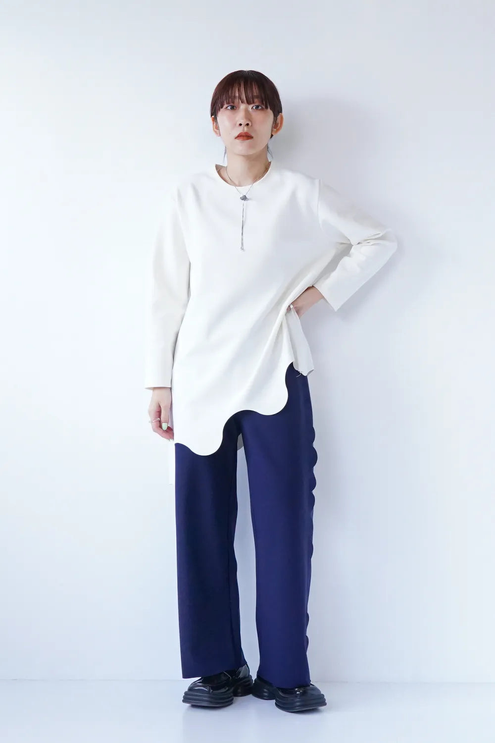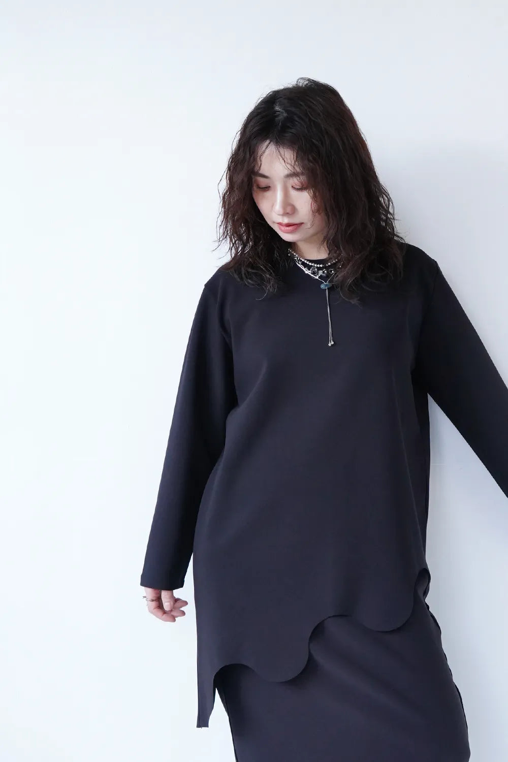 斜めに入ったウェーブラインがユニークなチュニックプルオーバー。薄手のポンチ素材でストレッチ性のある質感。お尻がすっぽり隠れる丈感も嬉しいポイント。裾のカットは切りっぱなし仕様になっています。