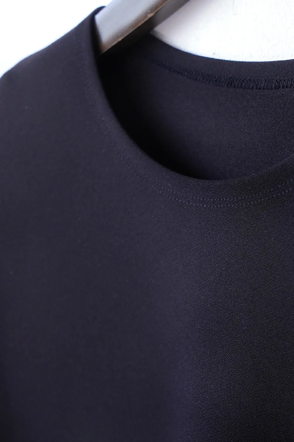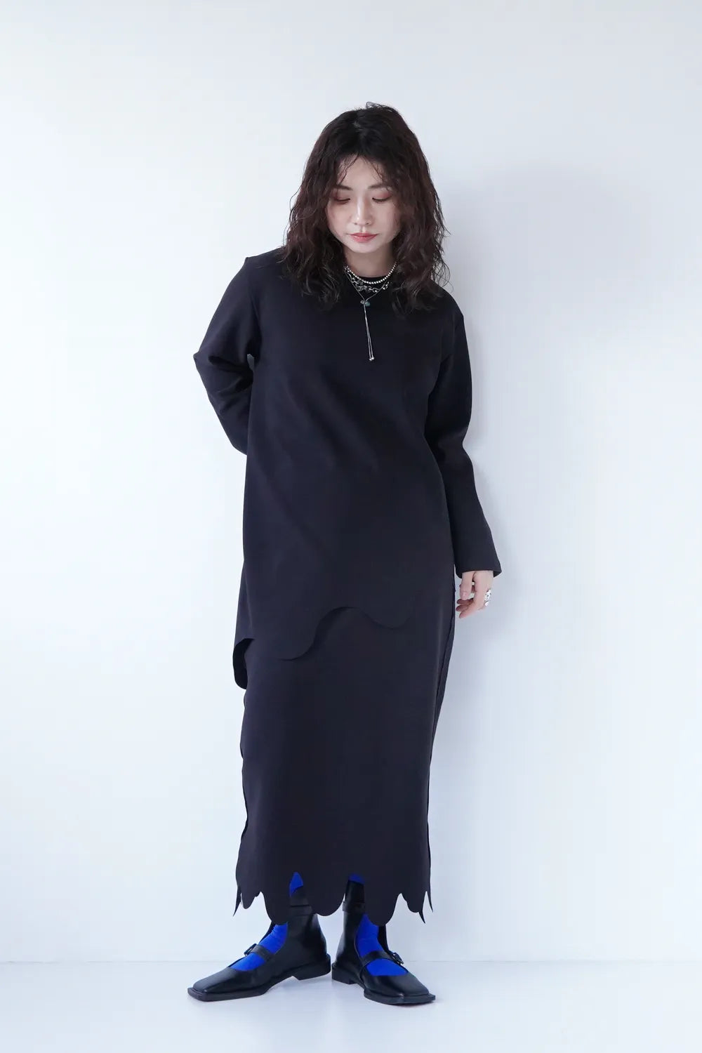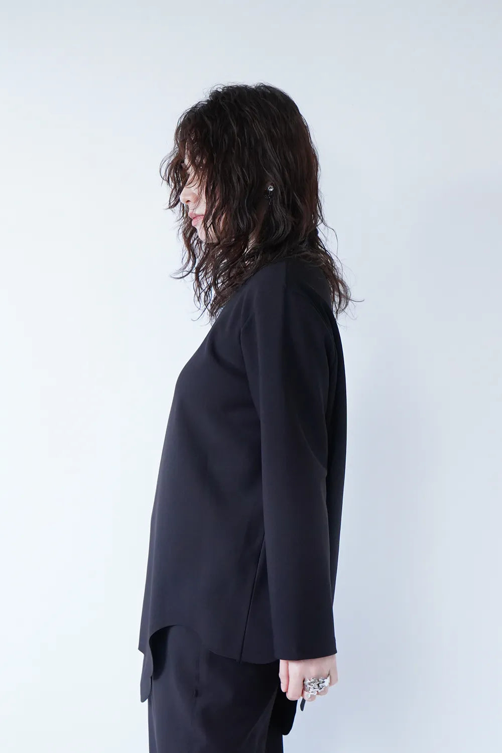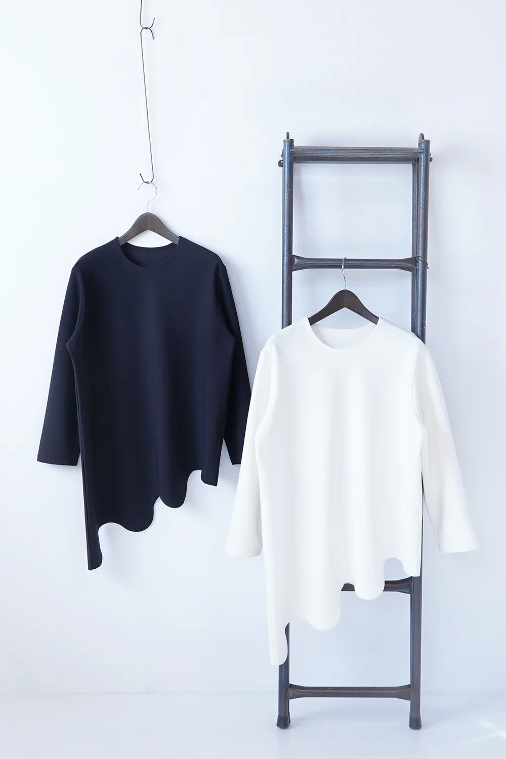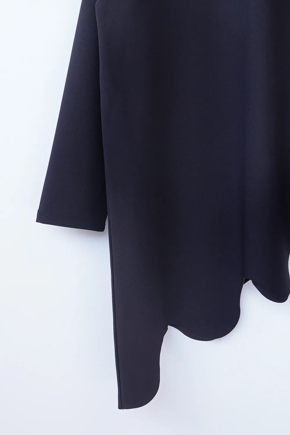 斜めに入ったウェーブラインがユニークなチュニックプルオーバー。薄手のポンチ素材でストレッチ性のある質感。お尻がすっぽり隠れる丈感も嬉しいポイント。裾のカットは切りっぱなし仕様になっています。