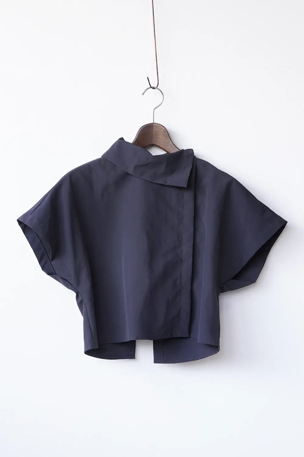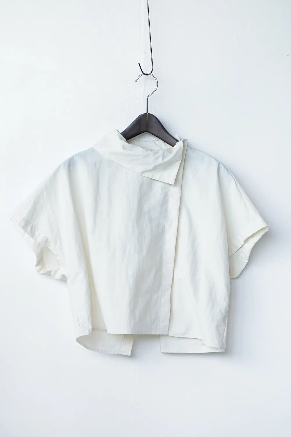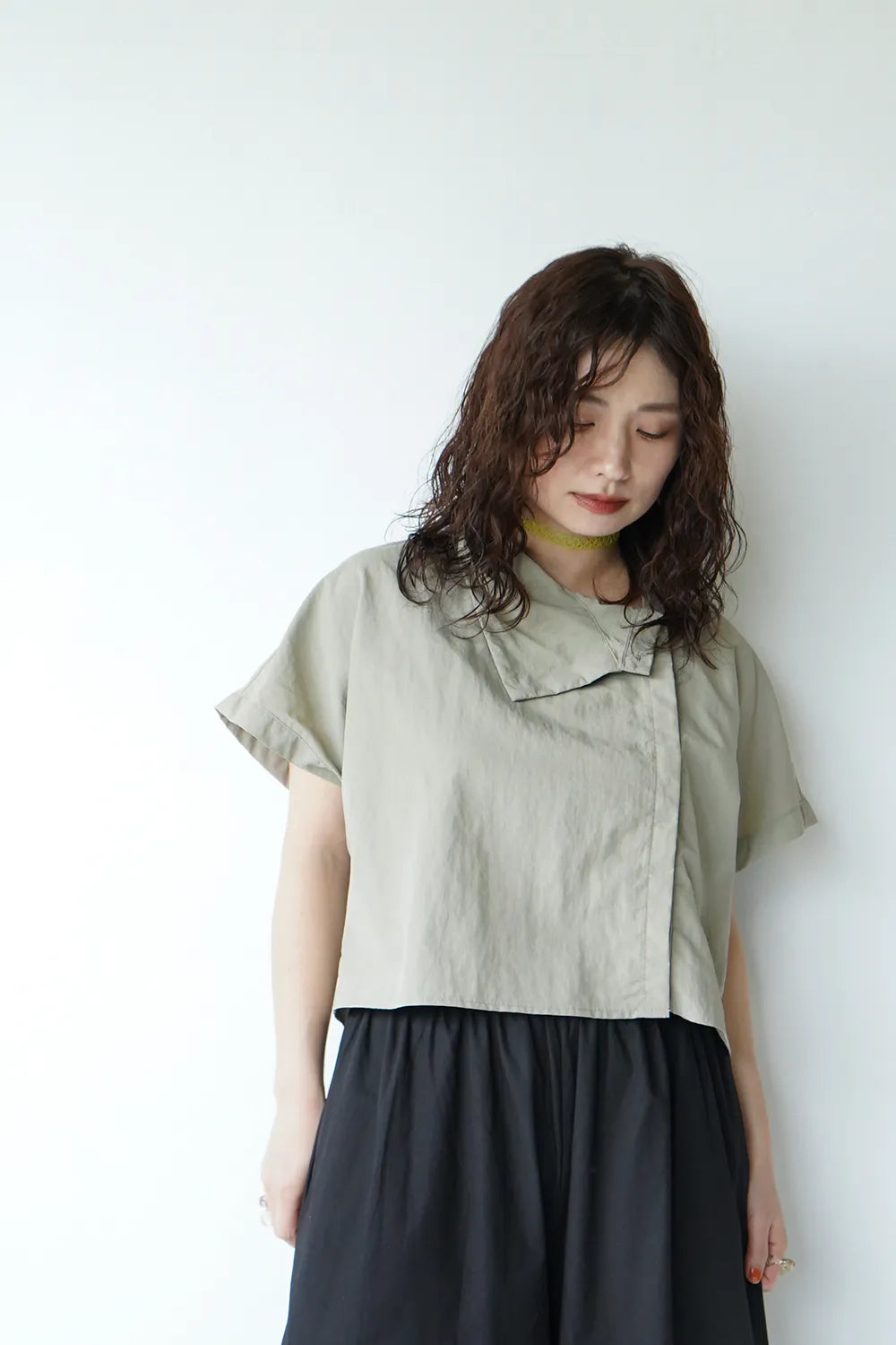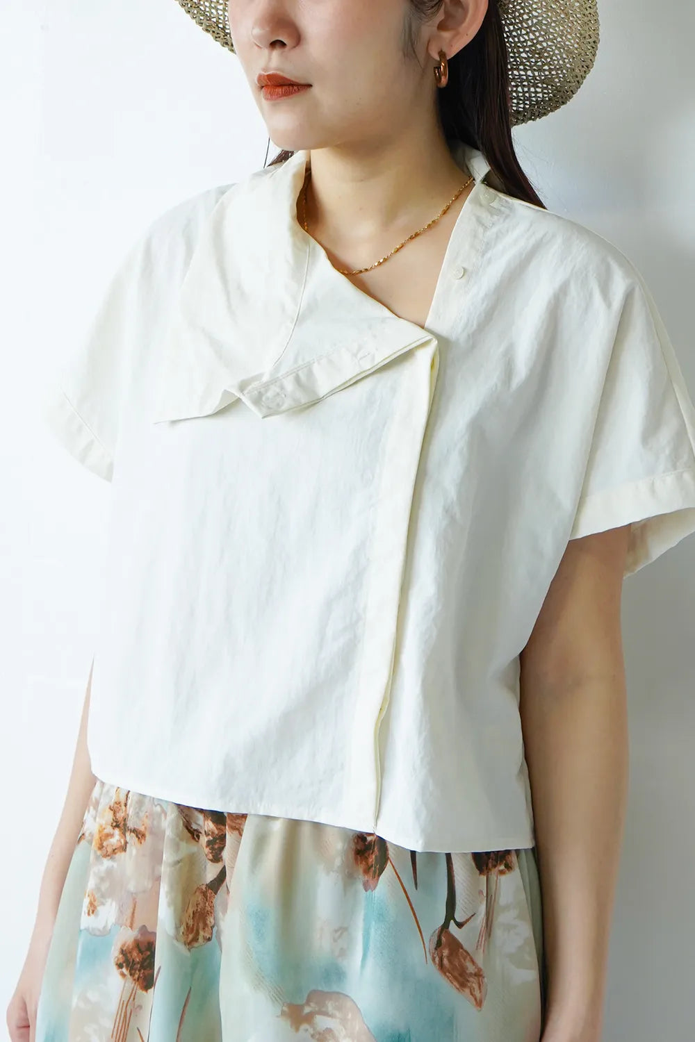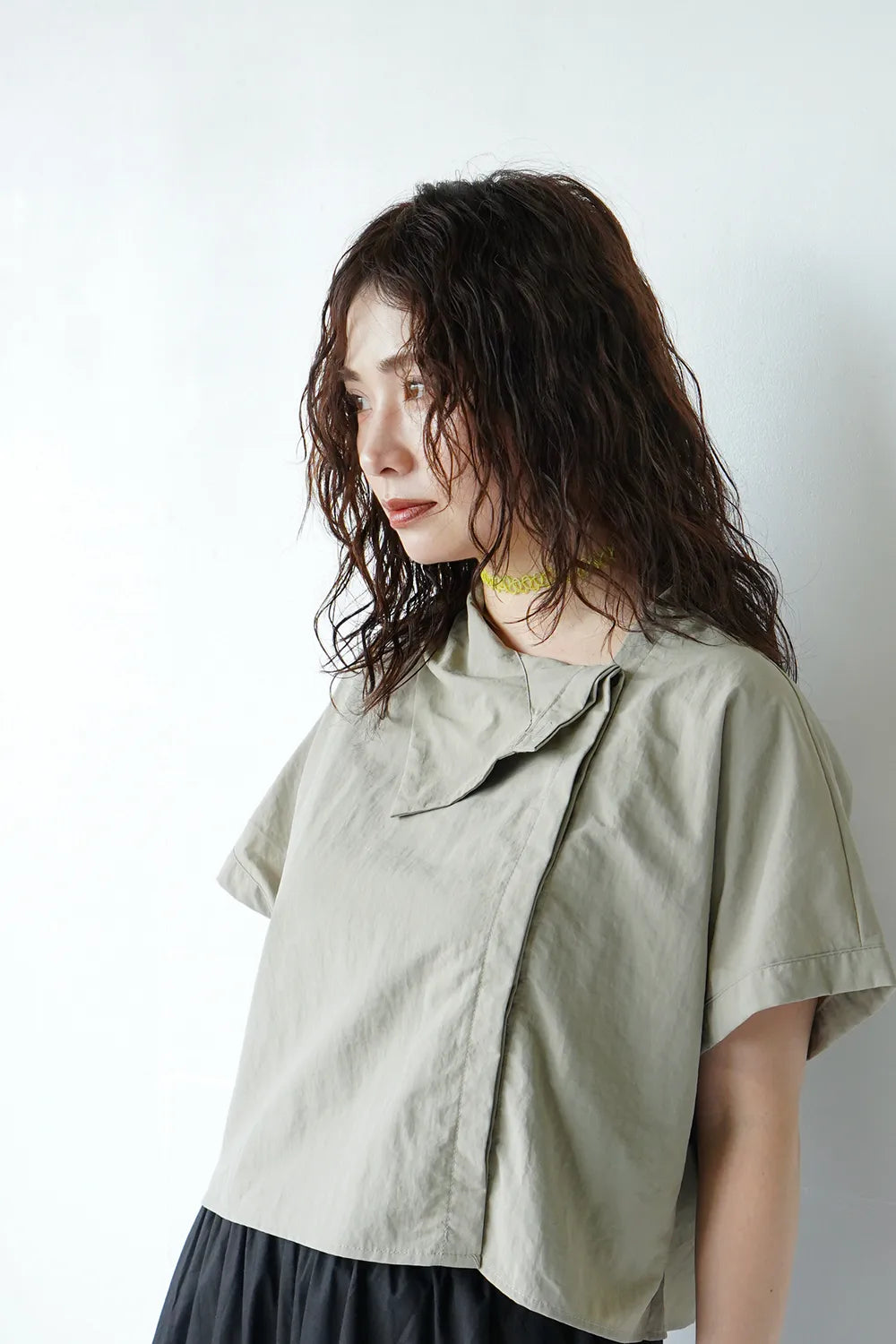 アシメデザインが個性的なショートブラウス。ハリ感のあるナイロンを使用。袖の切り替えがない身幅がたっぷりとしているので通気性◎気になる二の腕はしっかり隠れる大きな衿元で顔回りはシャープな印象に。バックシルエットにもこだわりを感じられる1枚です。