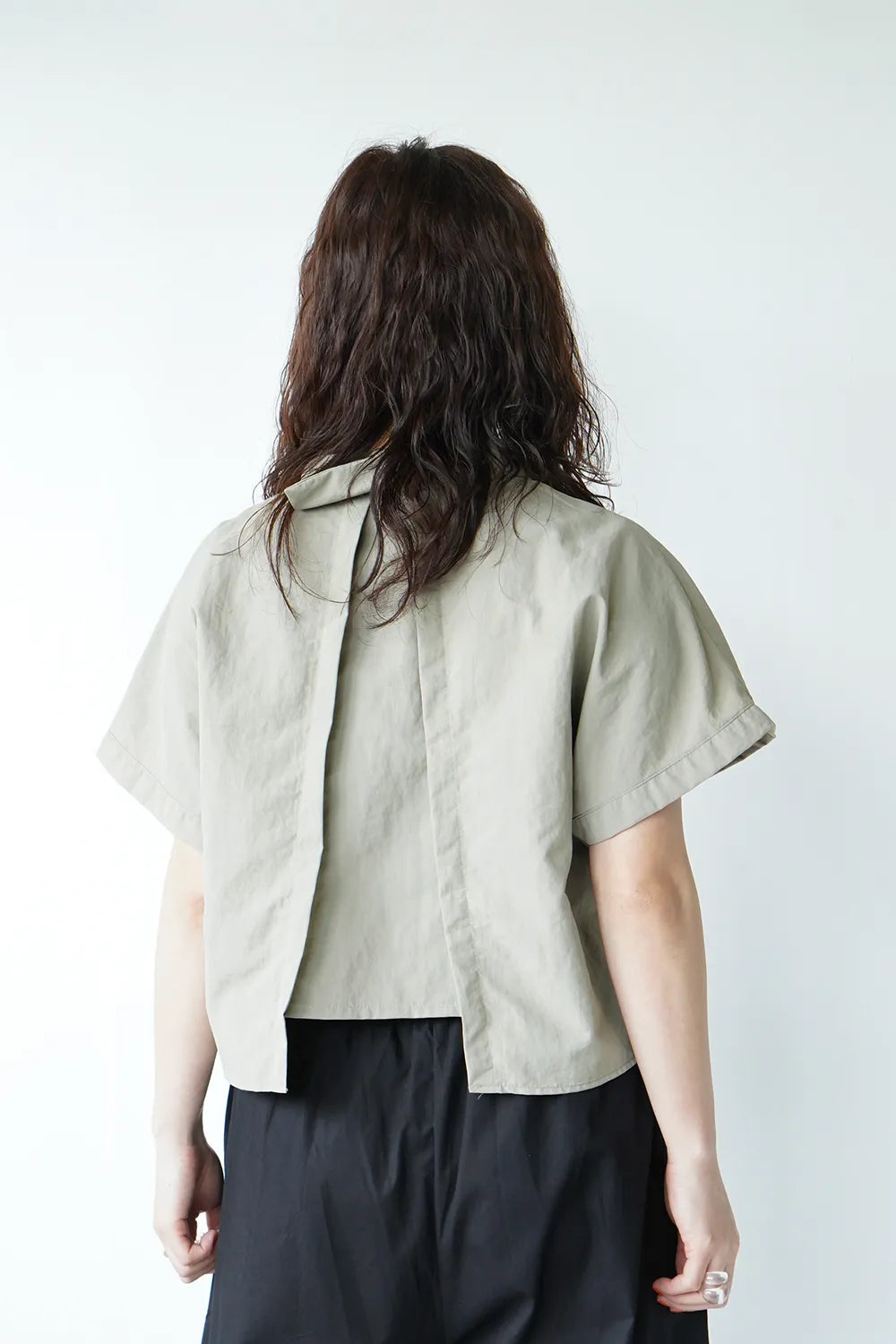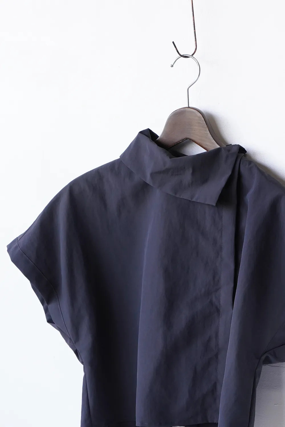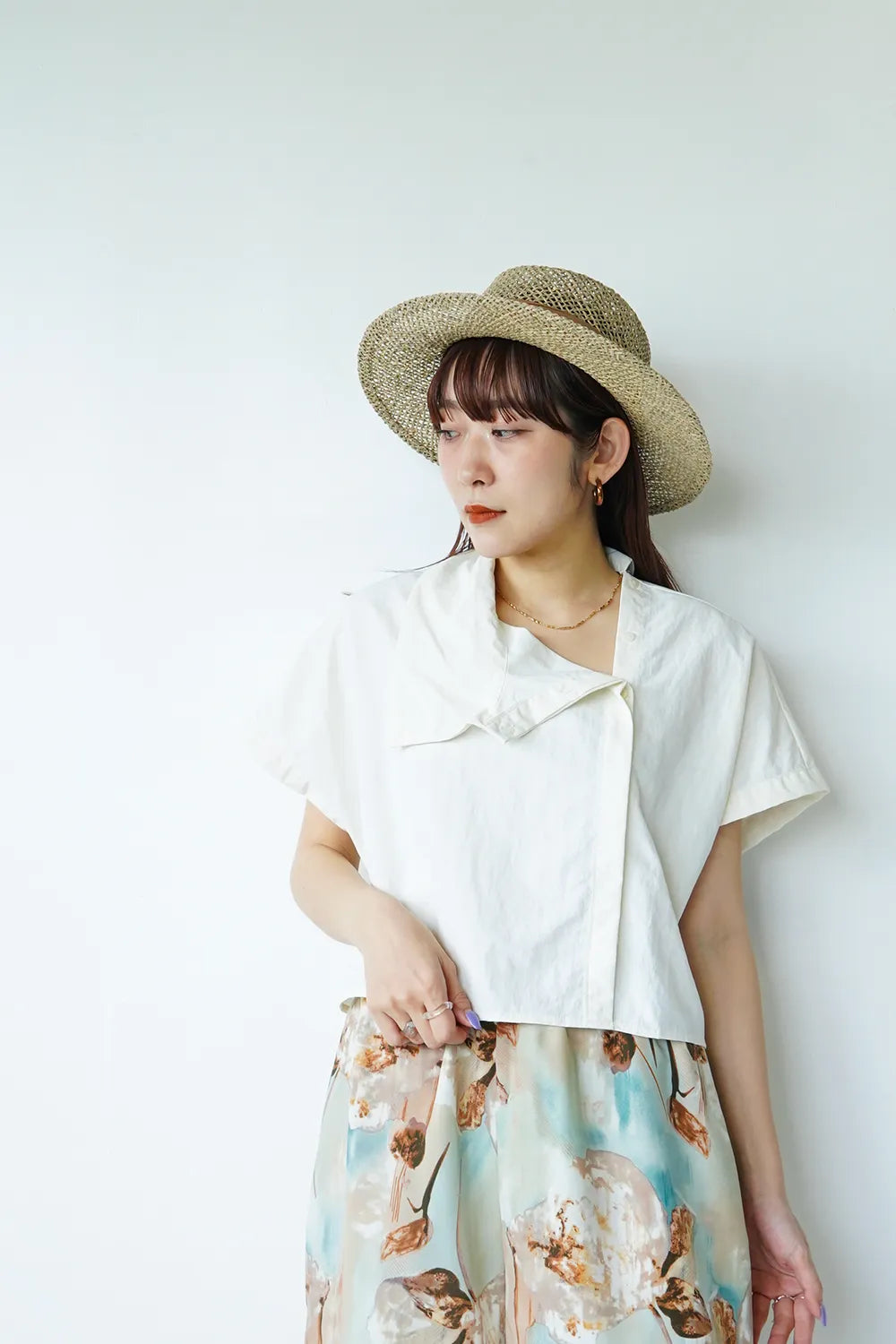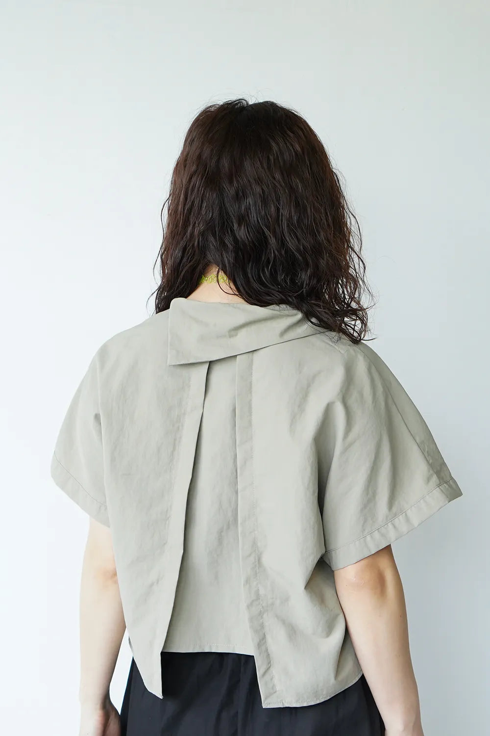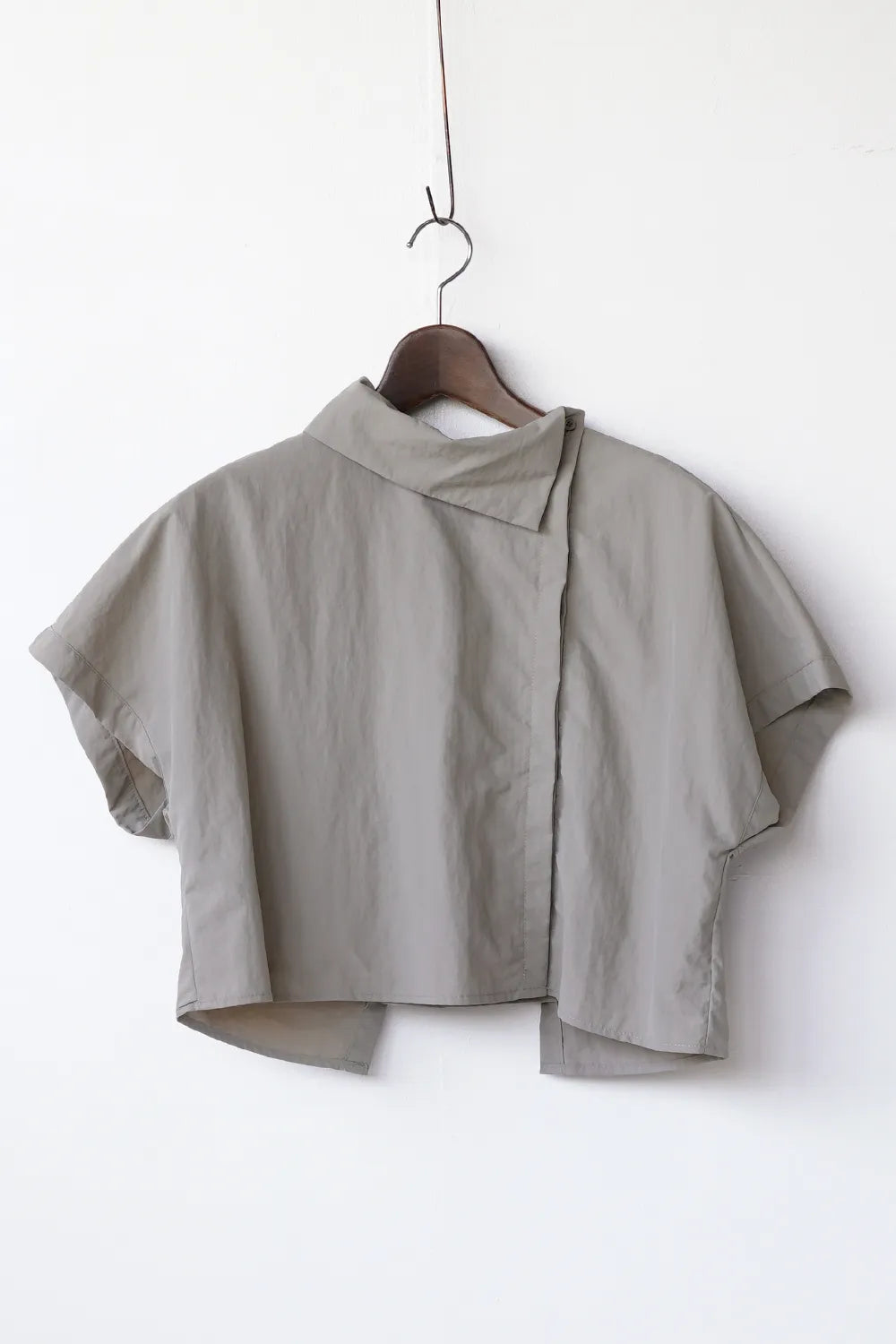 アシメデザインが個性的なショートブラウス。ハリ感のあるナイロンを使用。袖の切り替えがない身幅がたっぷりとしているので通気性◎気になる二の腕はしっかり隠れる大きな衿元で顔回りはシャープな印象に。バックシルエットにもこだわりを感じられる1枚です。
