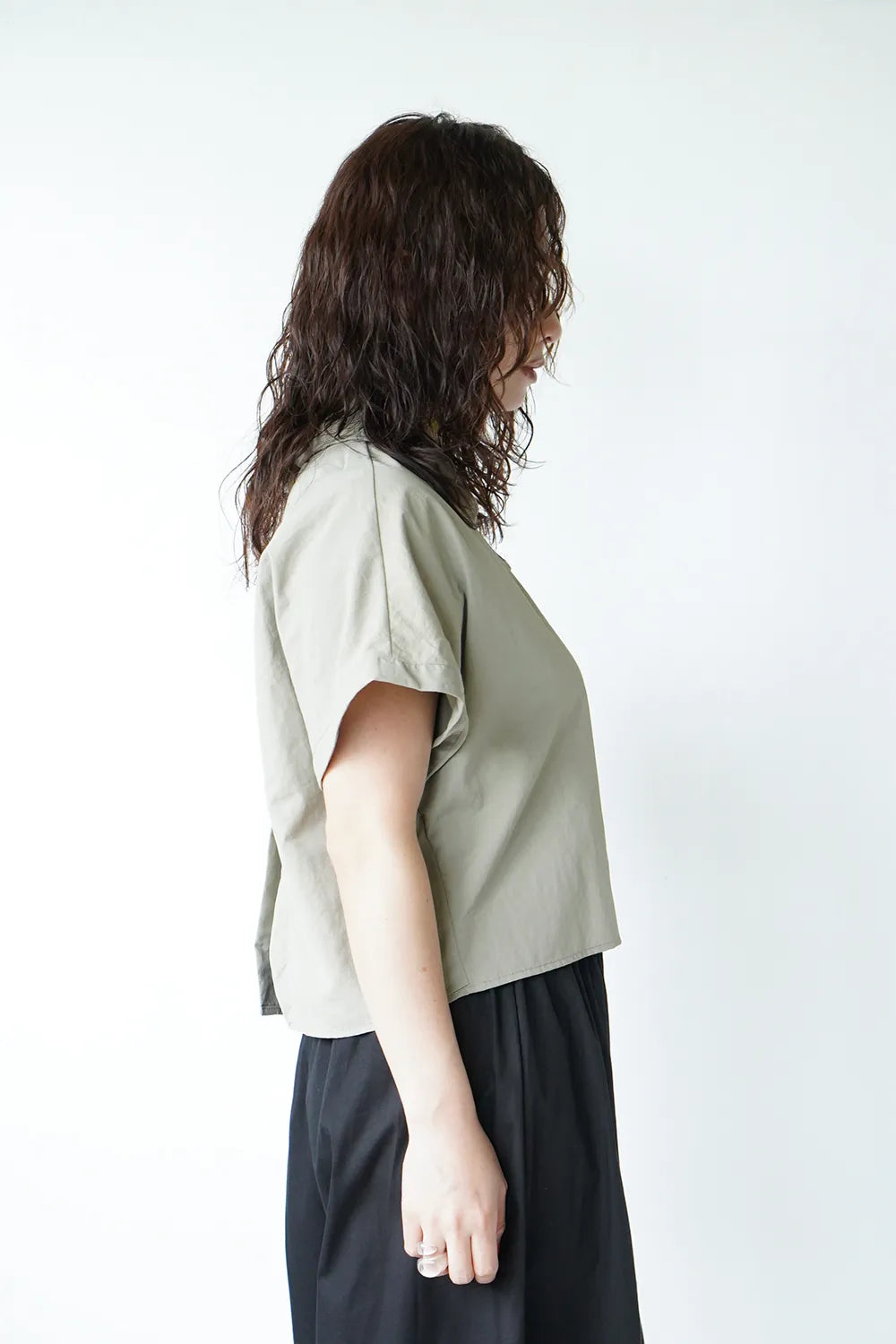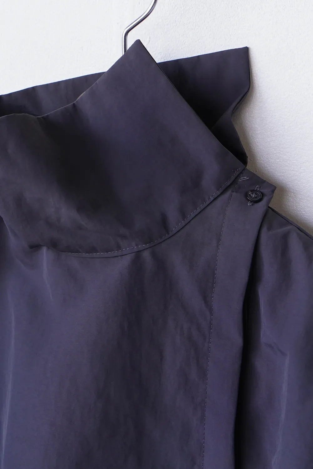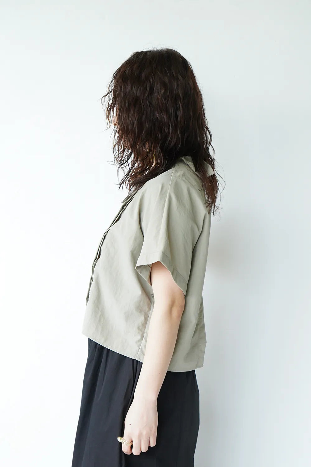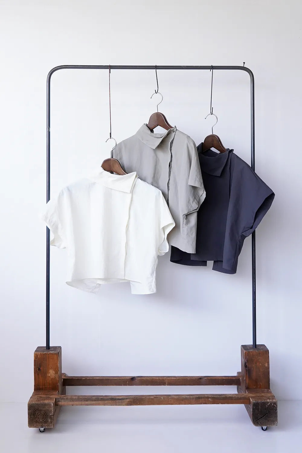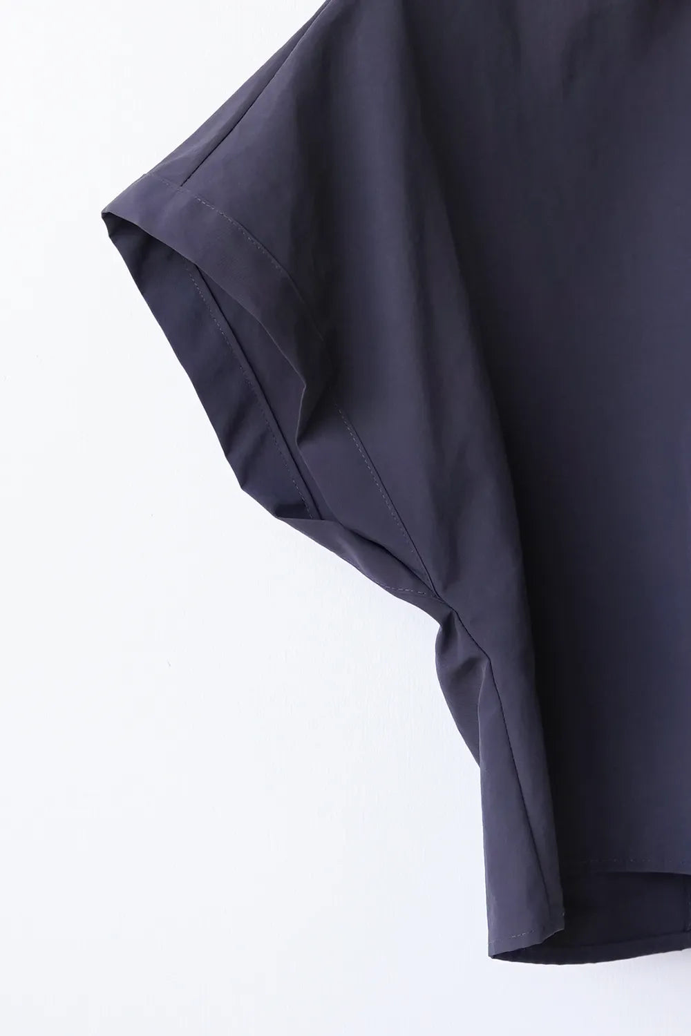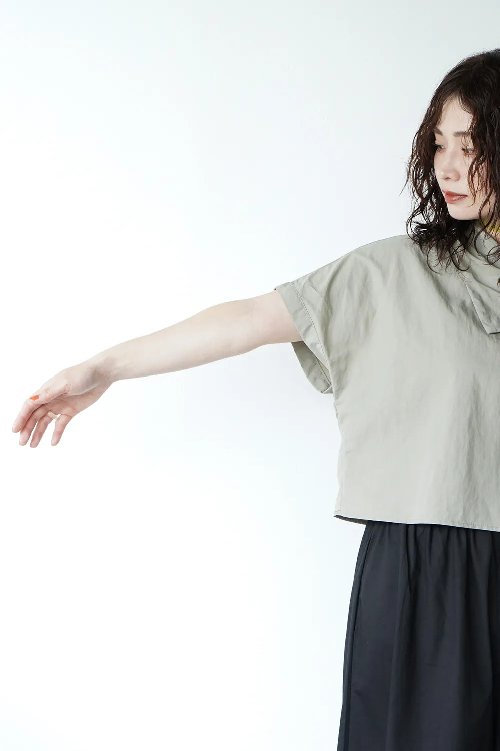 アシメデザインが個性的なショートブラウス。ハリ感のあるナイロンを使用。袖の切り替えがない身幅がたっぷりとしているので通気性◎気になる二の腕はしっかり隠れる大きな衿元で顔回りはシャープな印象に。バックシルエットにもこだわりを感じられる1枚です。