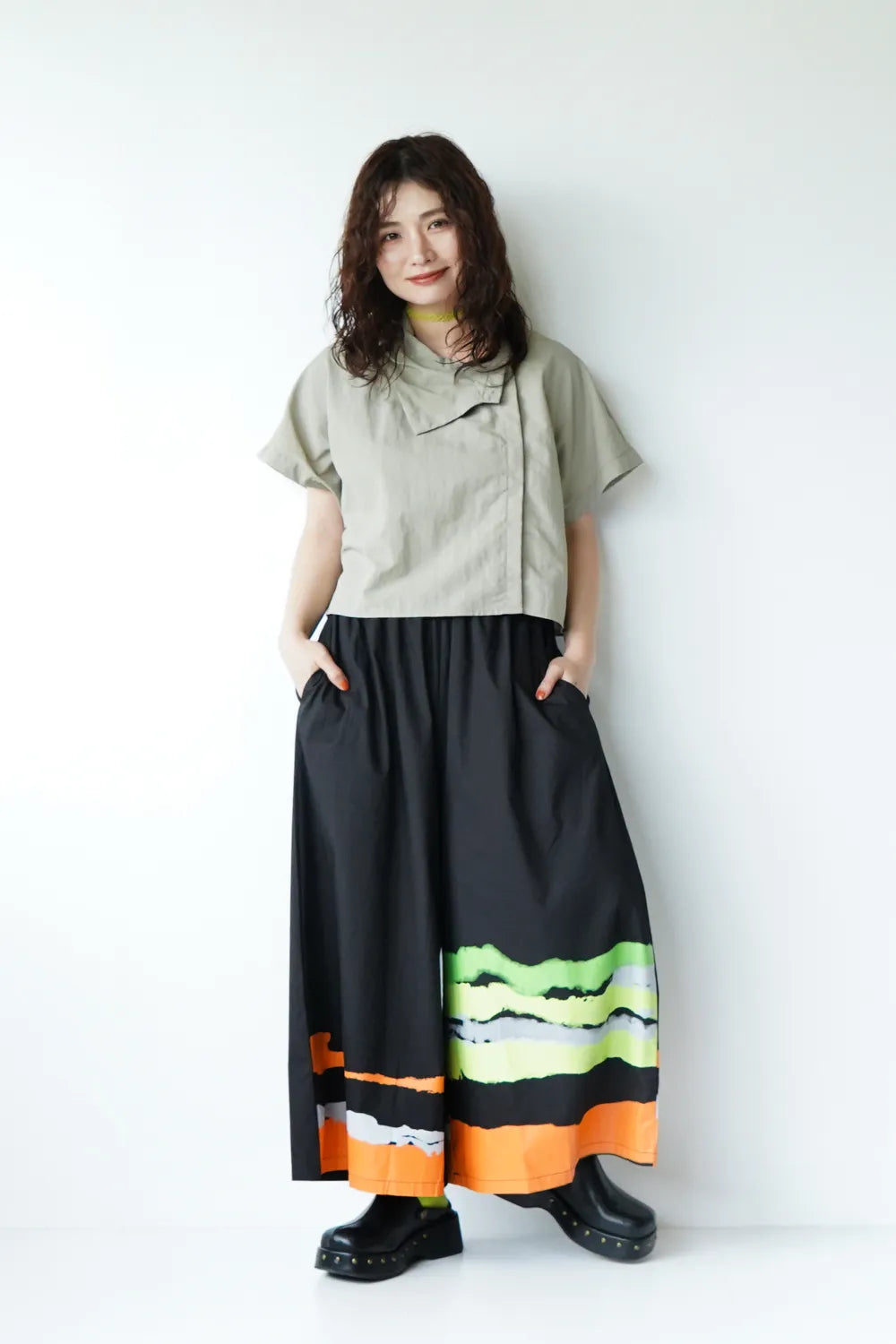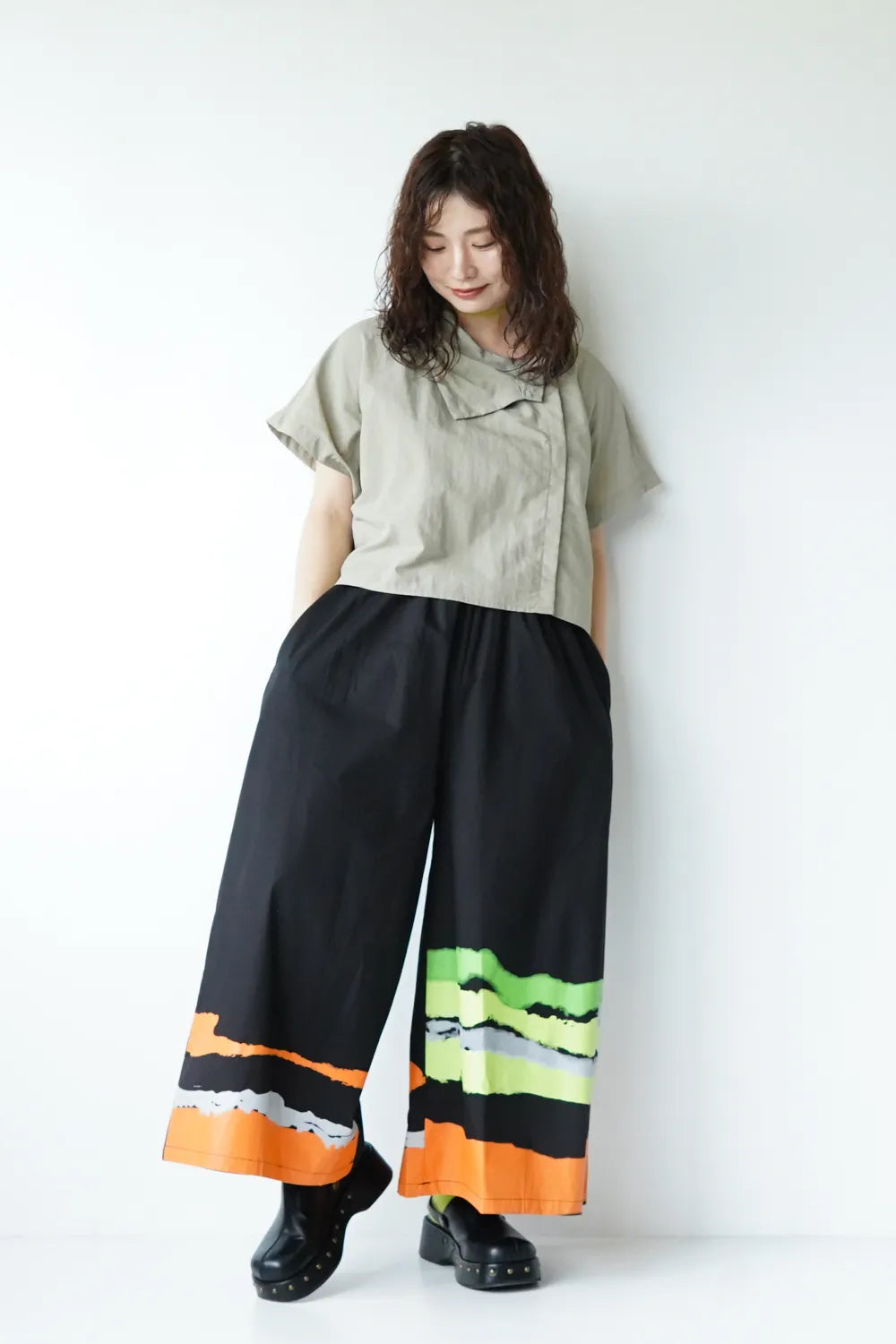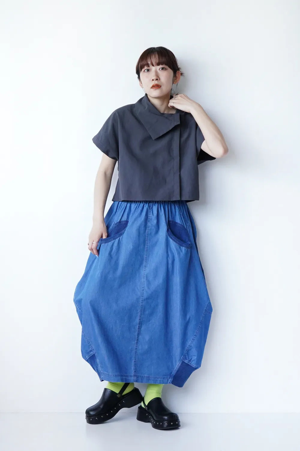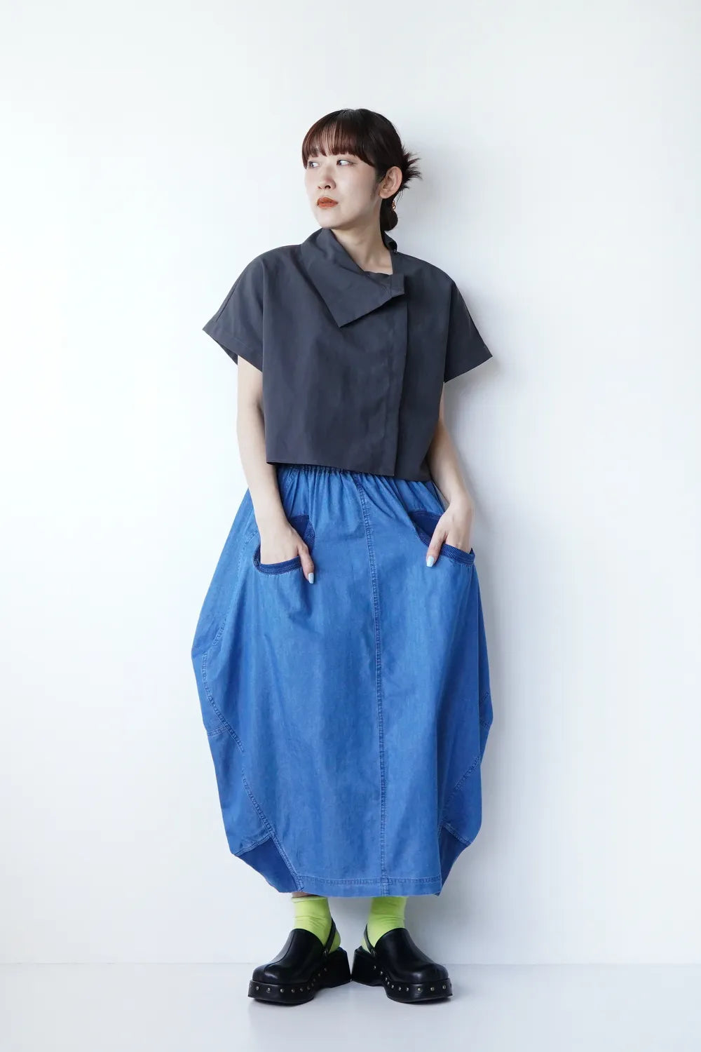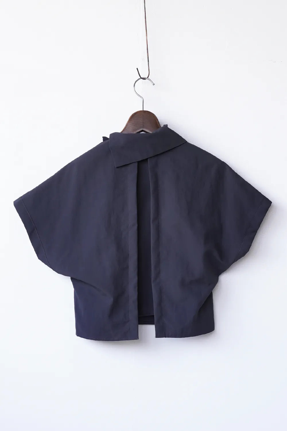 アシメデザインが個性的なショートブラウス。ハリ感のあるナイロンを使用。袖の切り替えがない身幅がたっぷりとしているので通気性◎気になる二の腕はしっかり隠れる大きな衿元で顔回りはシャープな印象に。バックシルエットにもこだわりを感じられる1枚です。