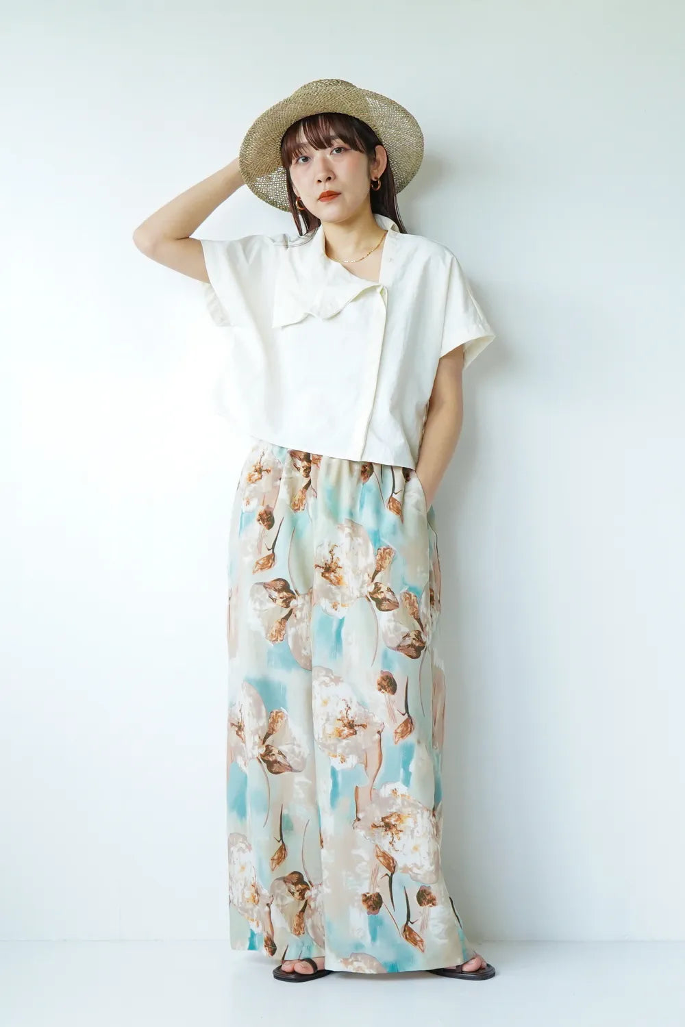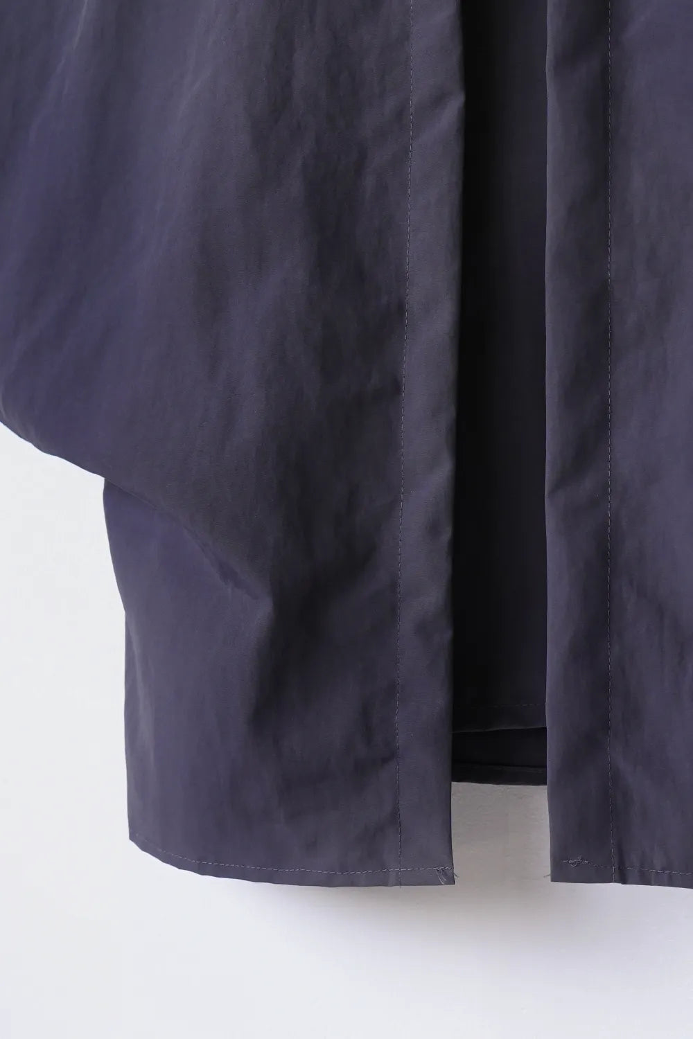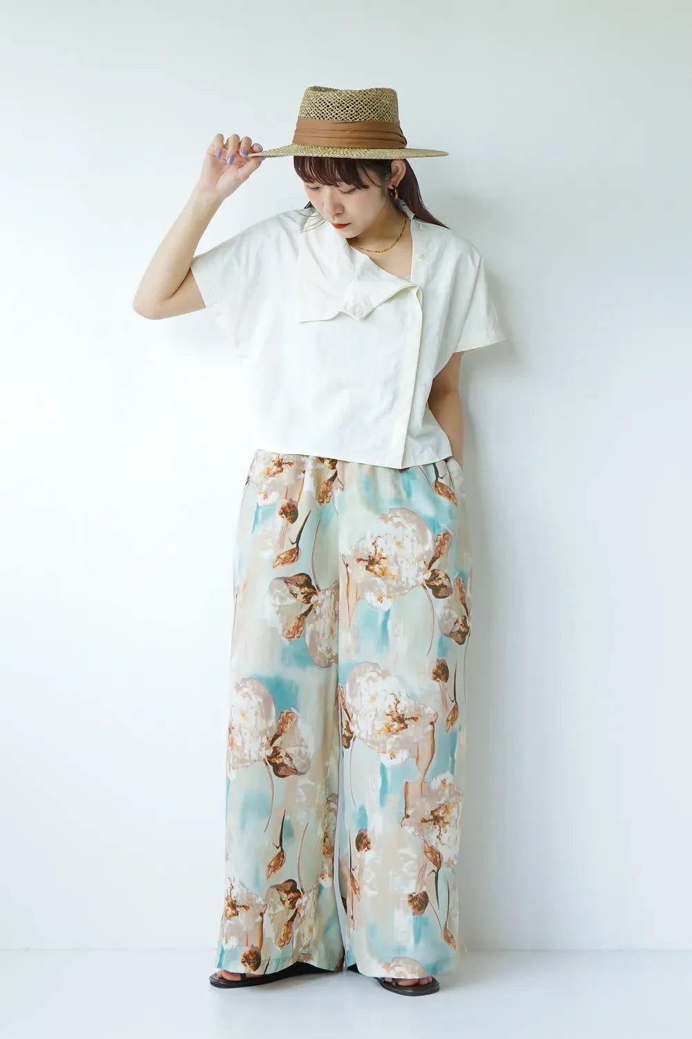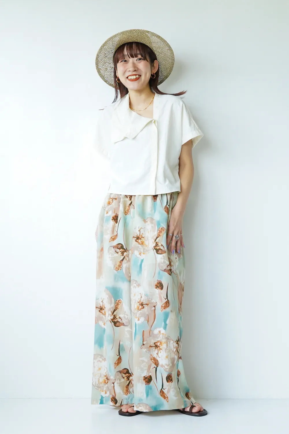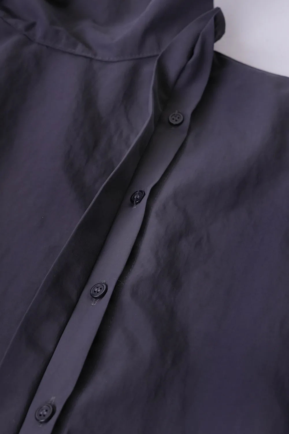 アシメデザインが個性的なショートブラウス。ハリ感のあるナイロンを使用。袖の切り替えがない身幅がたっぷりとしているので通気性◎気になる二の腕はしっかり隠れる大きな衿元で顔回りはシャープな印象に。バックシルエットにもこだわりを感じられる1枚です。