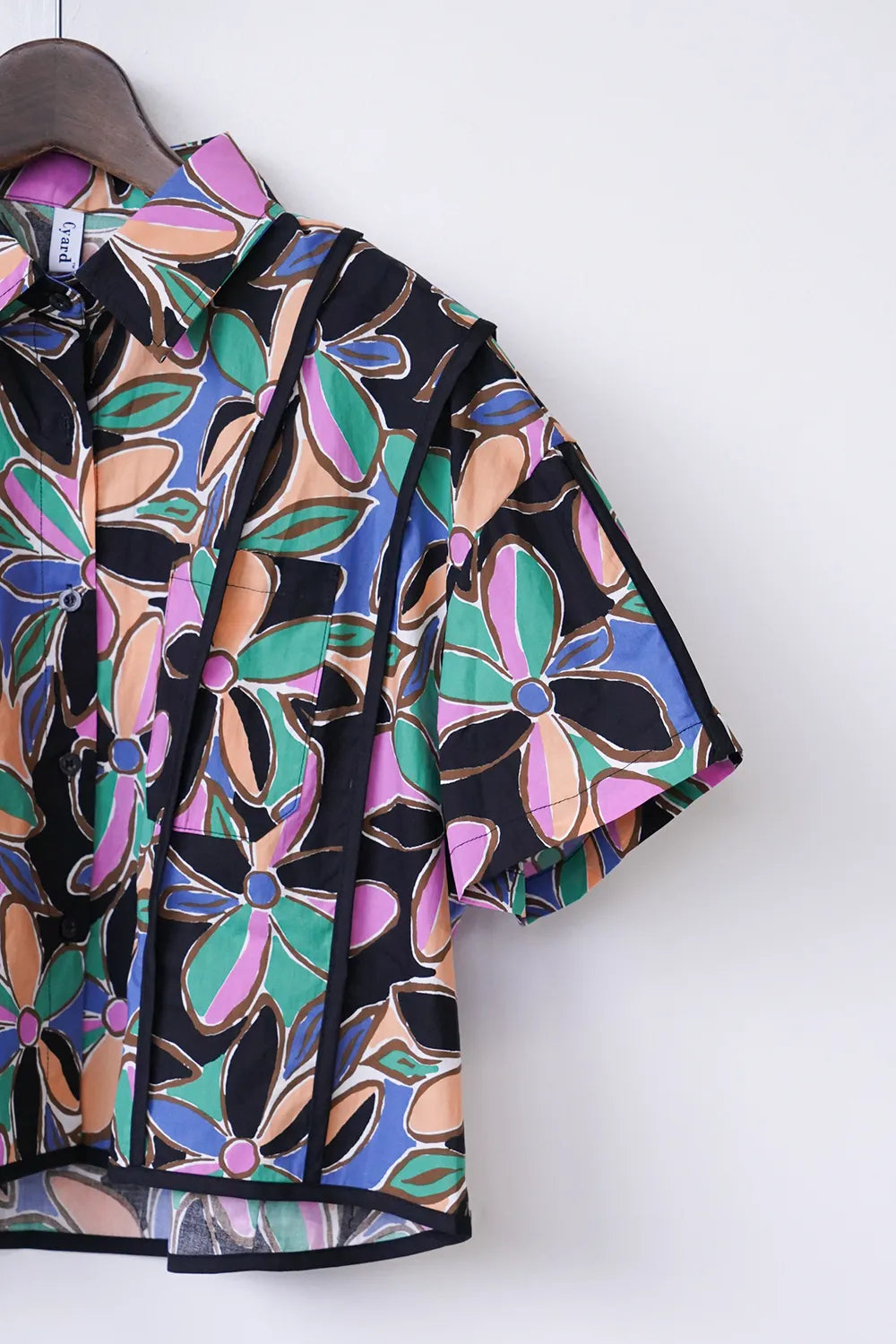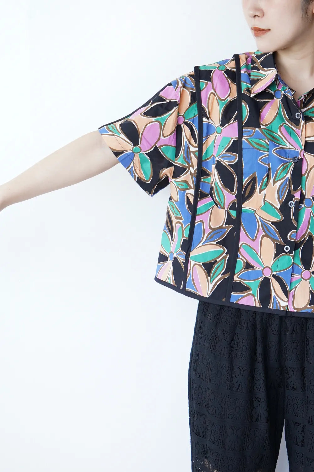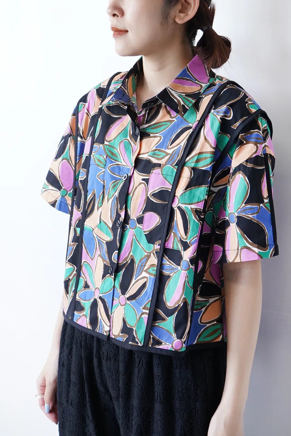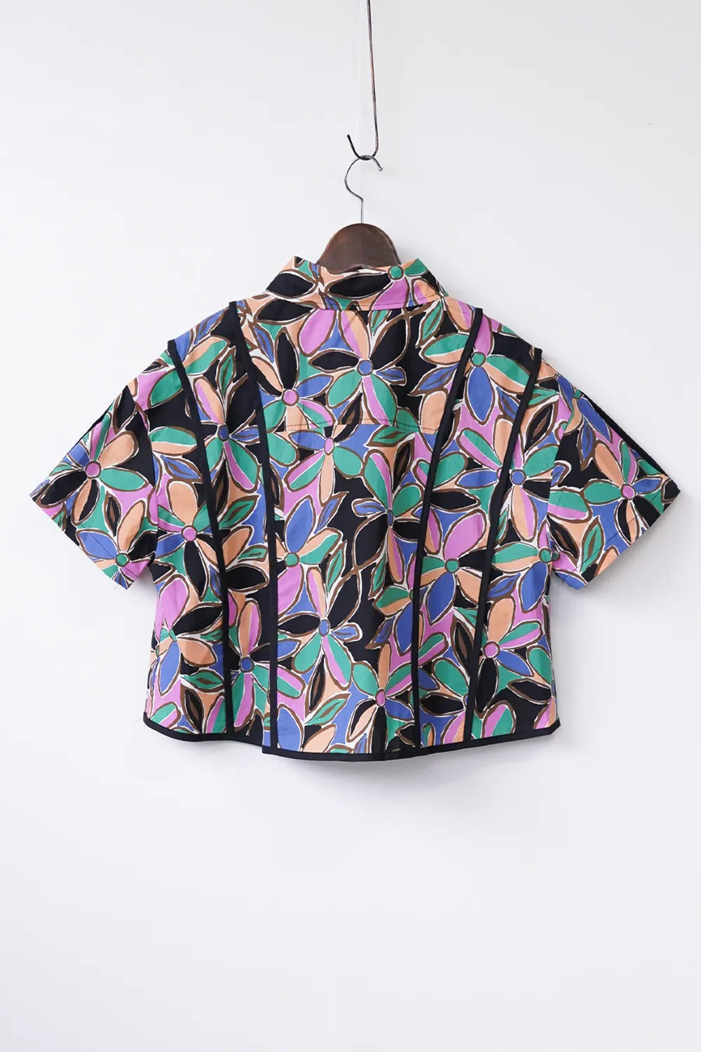 レトロなフラワープリントが印象的なショートシャツ。 たっぷりな身幅に短め丈のバランスが◎コットン100%の春夏に最適な素材感でさらっと薄手の生地を使用。 パイピングデザインもさりげないポイント。 コーデの主役になるアイテムです。