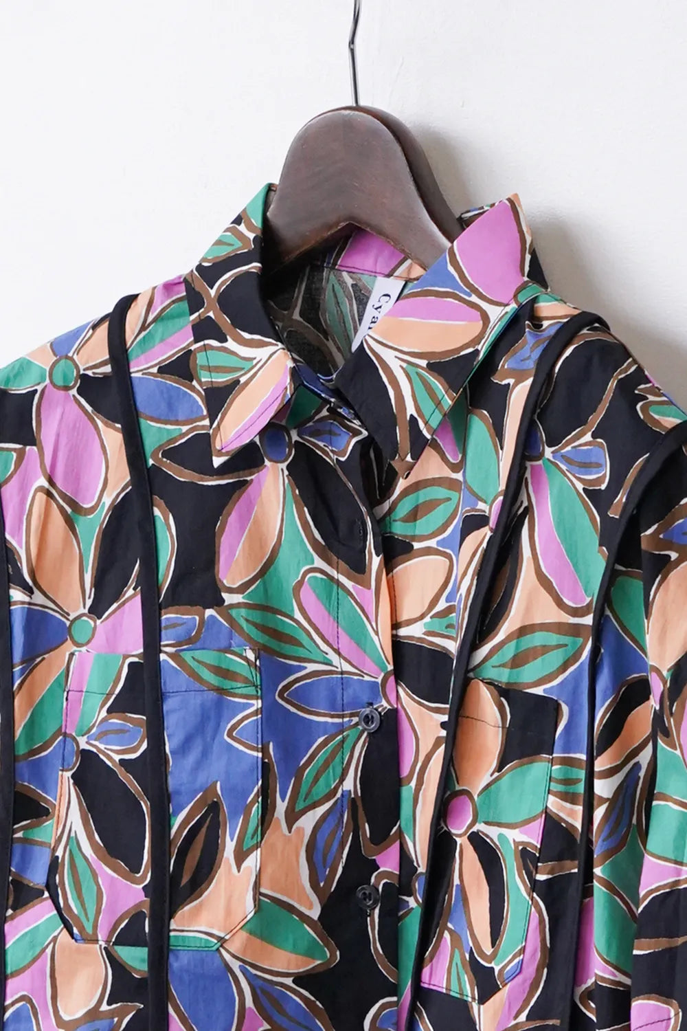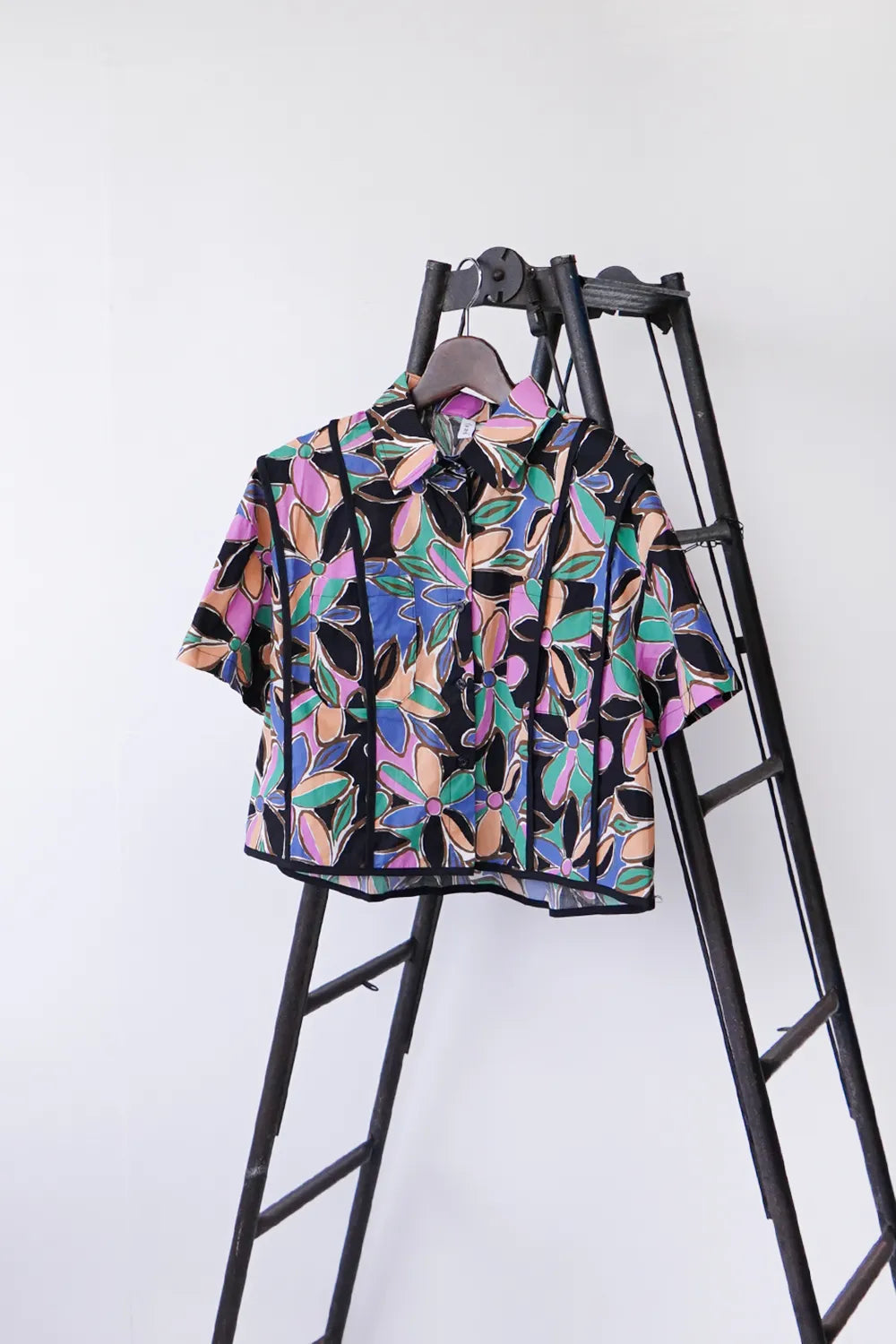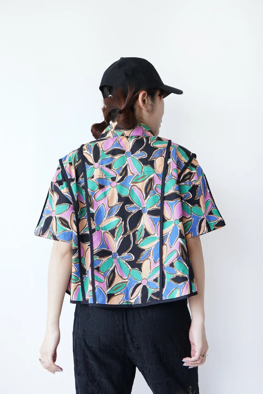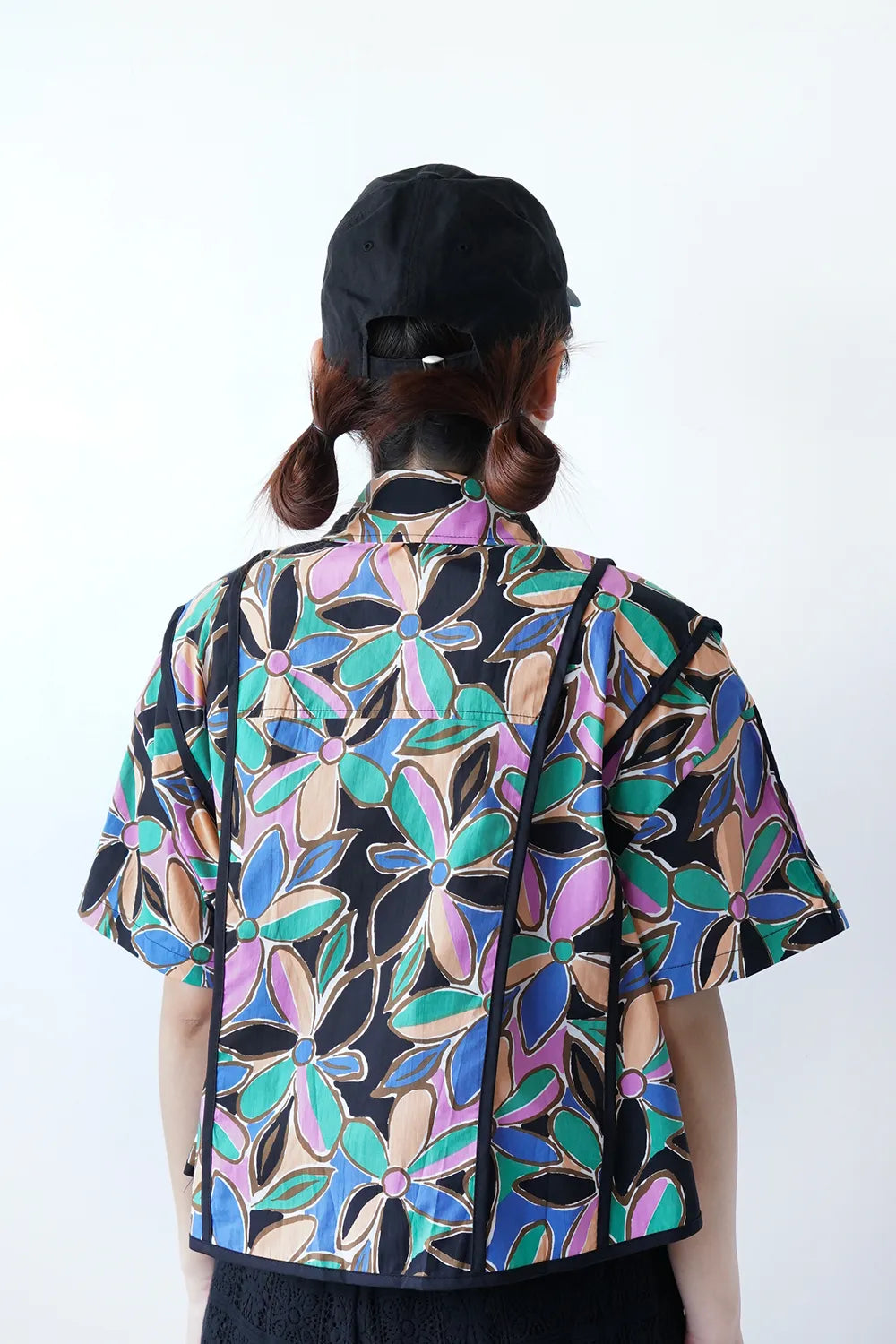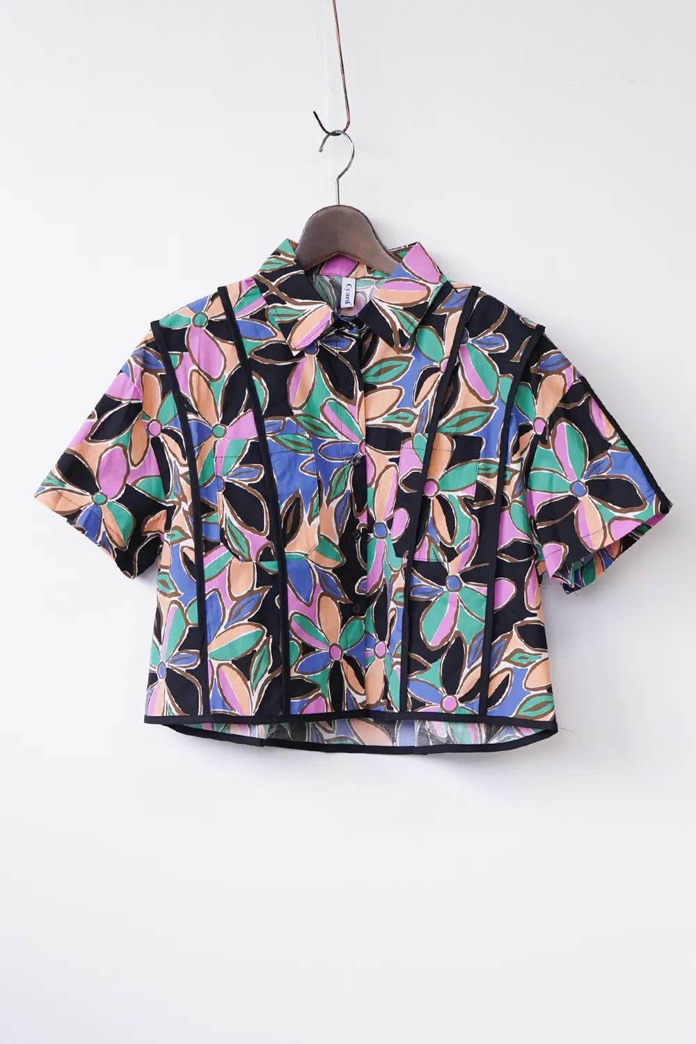 レトロなフラワープリントが印象的なショートシャツ。 たっぷりな身幅に短め丈のバランスが◎コットン100%の春夏に最適な素材感でさらっと薄手の生地を使用。 パイピングデザインもさりげないポイント。 コーデの主役になるアイテムです。