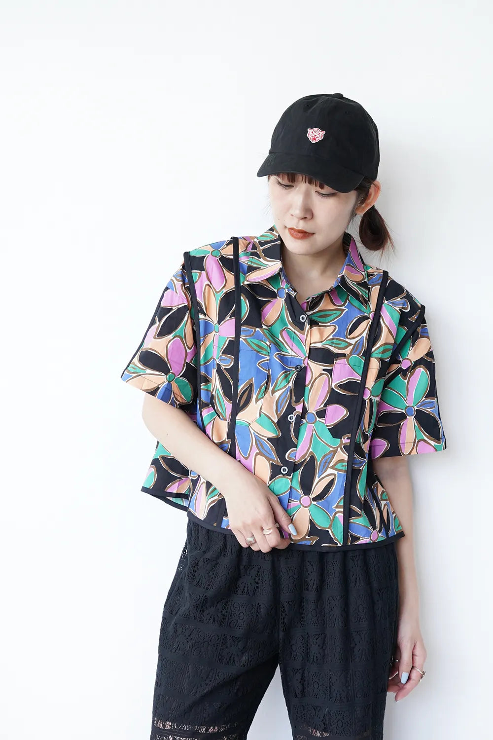 カラフルフラワープリントコットンショートシャツ