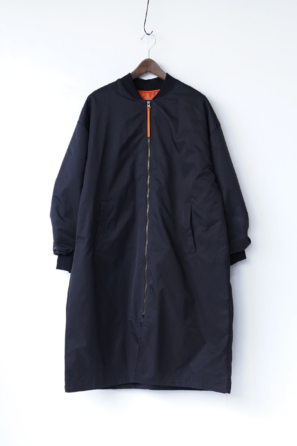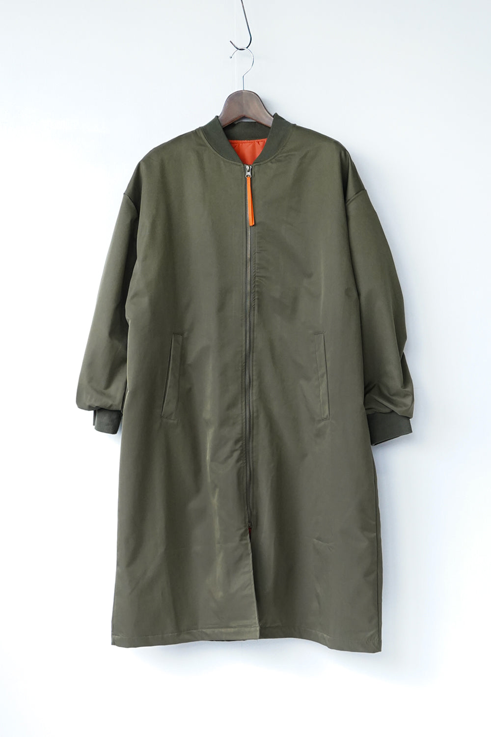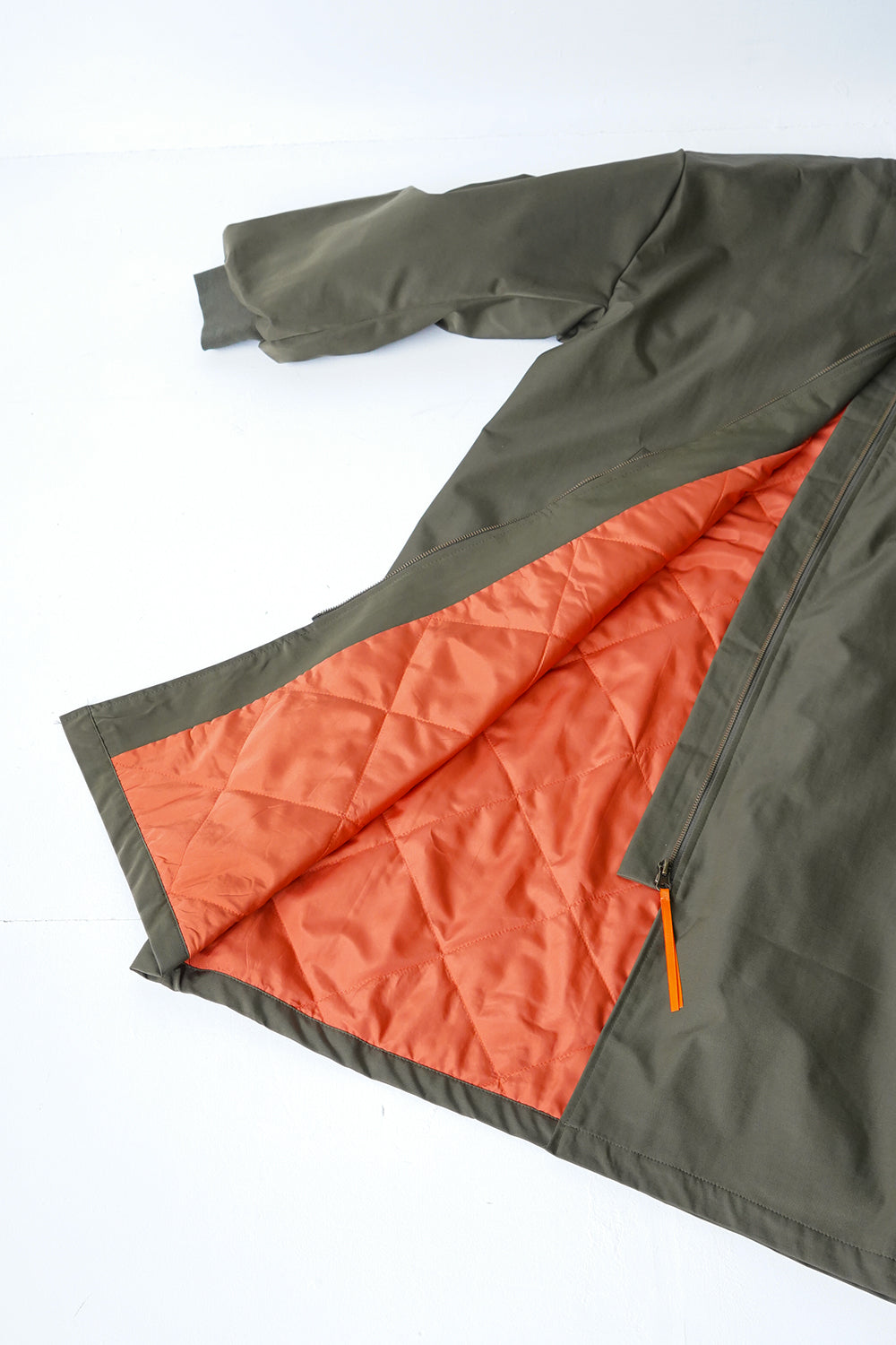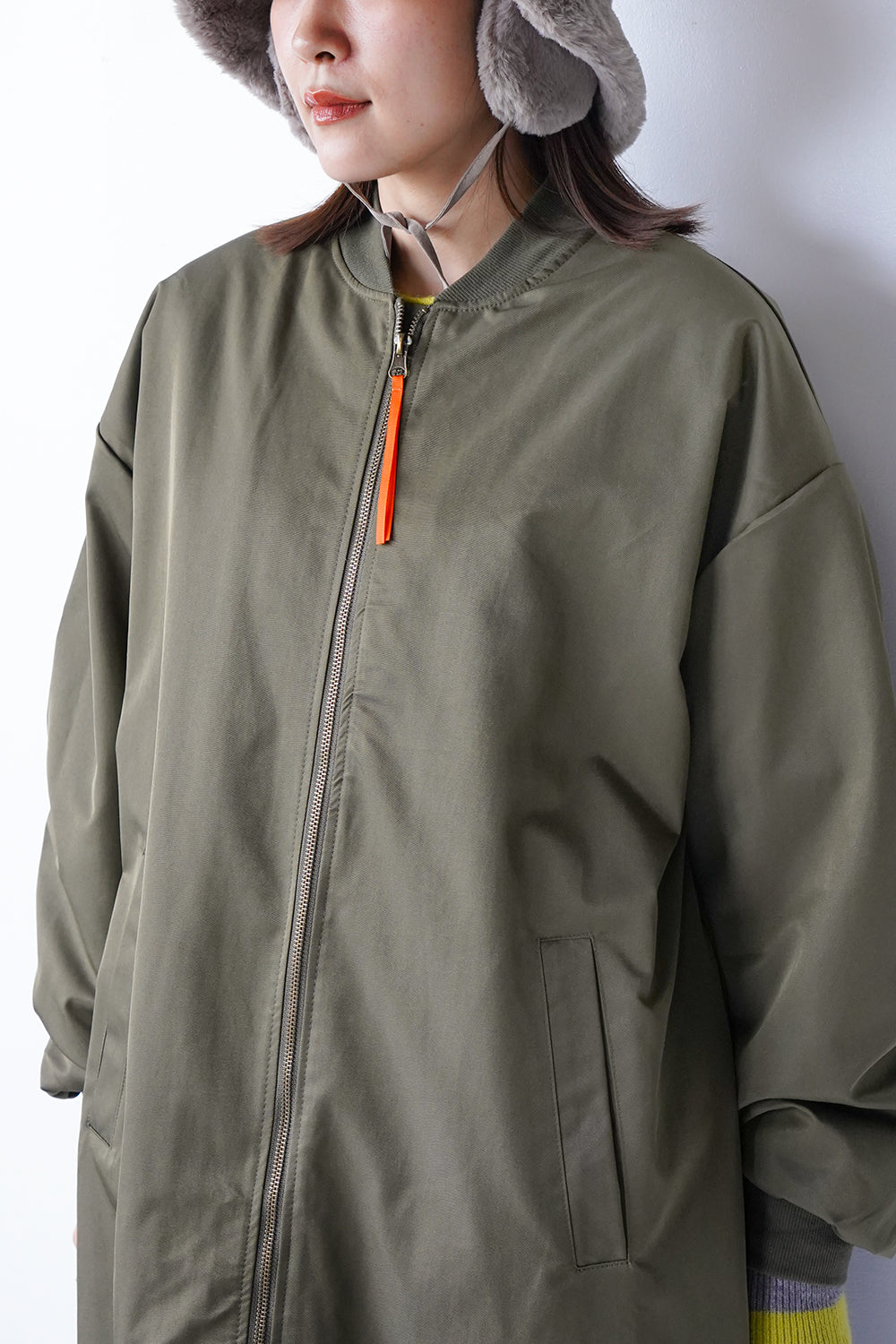 ロング丈が珍しい丈感の中綿ブルゾン。ギャザーがたっぷり寄ったカーブスリーブも特徴的なシルエット。裏地とジップのオレンジカラーがアクセントになりスポーティー要素が加わった1枚。身長問わず使いやすい丈感と軽くて保温性のある万能アイテム。