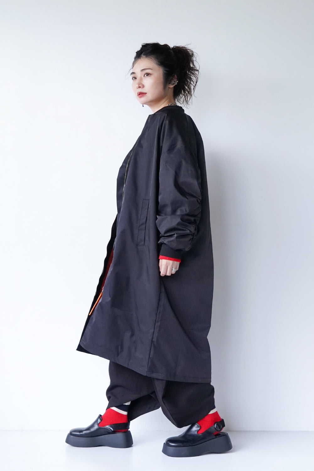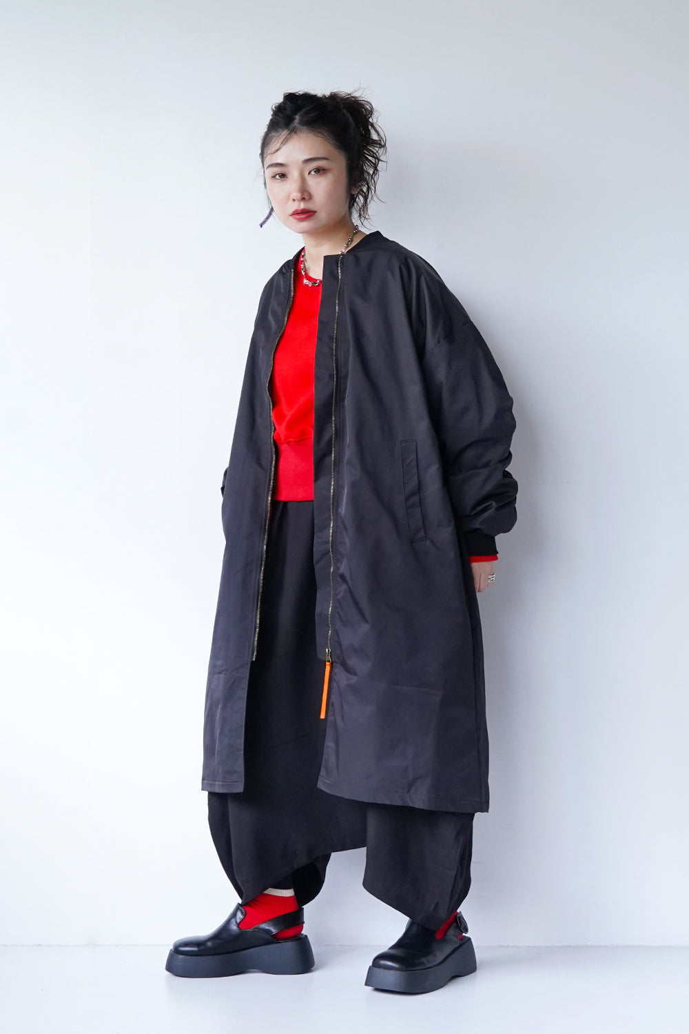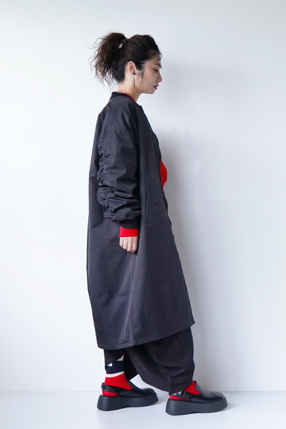 ロング丈が珍しい丈感の中綿ブルゾン。ギャザーがたっぷり寄ったカーブスリーブも特徴的なシルエット。裏地とジップのオレンジカラーがアクセントになりスポーティー要素が加わった1枚。身長問わず使いやすい丈感と軽くて保温性のある万能アイテム。