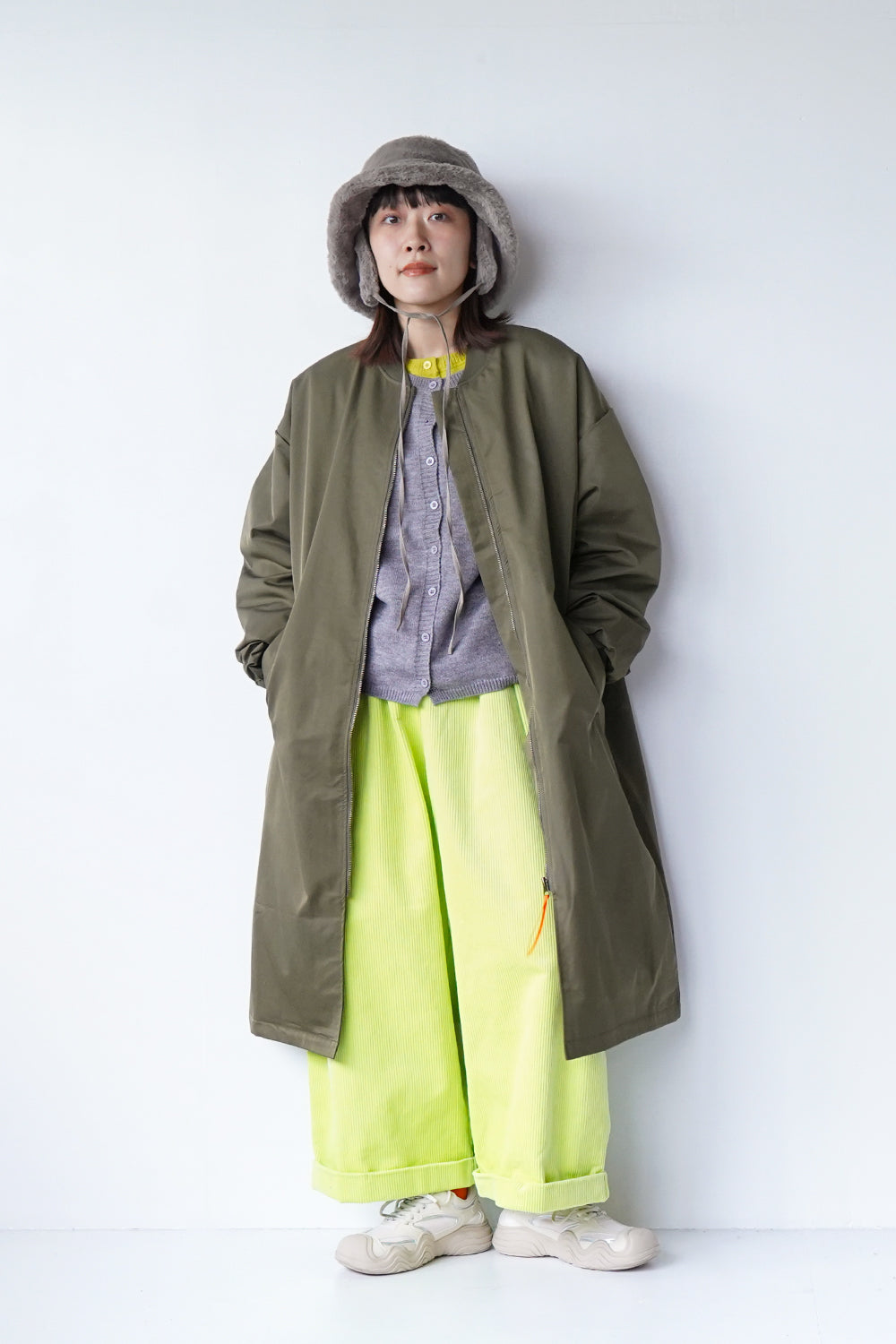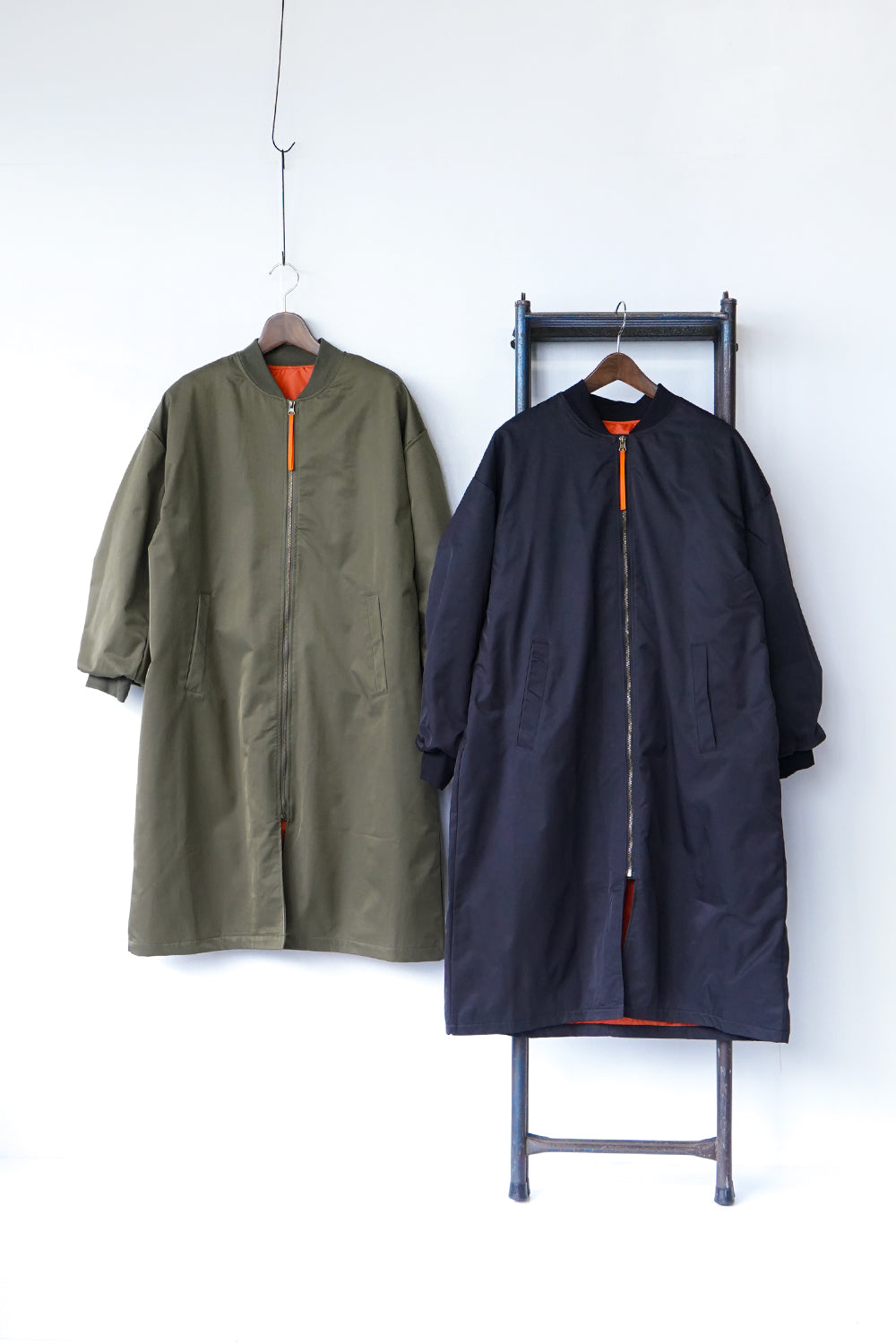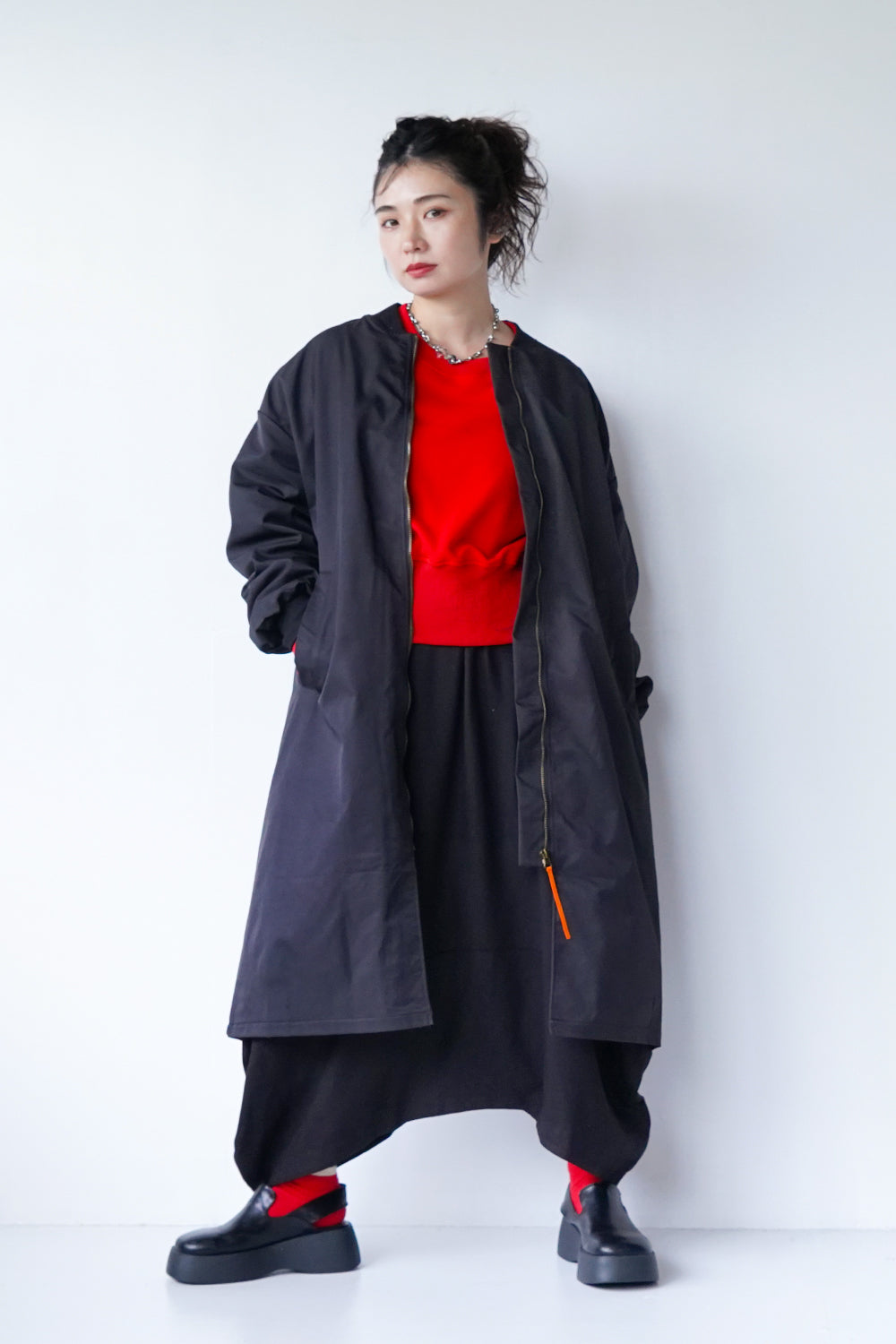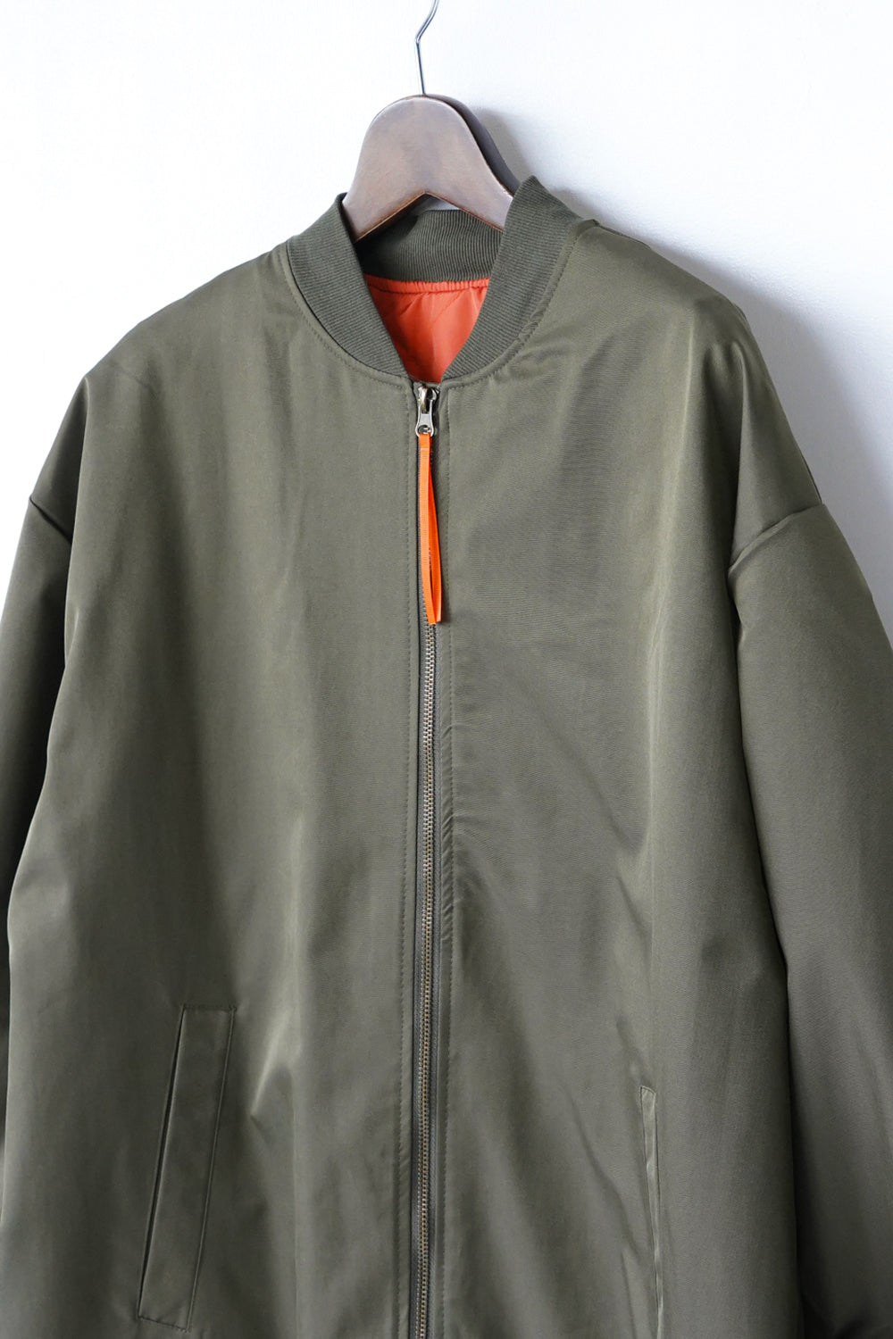 ロング丈が珍しい丈感の中綿ブルゾン。ギャザーがたっぷり寄ったカーブスリーブも特徴的なシルエット。裏地とジップのオレンジカラーがアクセントになりスポーティー要素が加わった1枚。身長問わず使いやすい丈感と軽くて保温性のある万能アイテム。