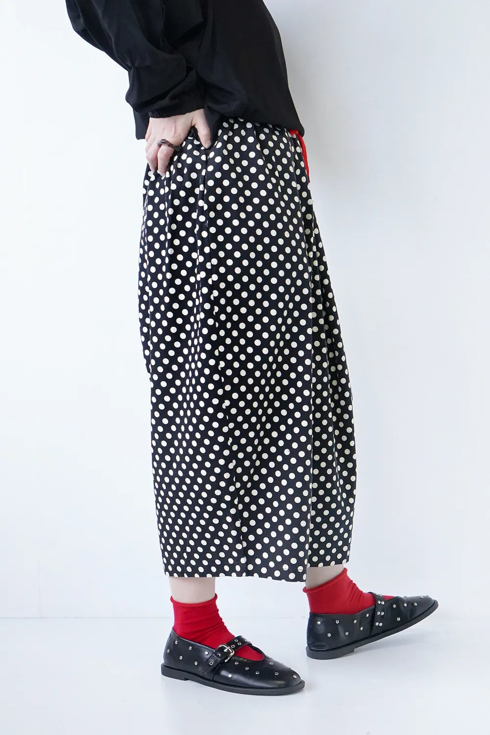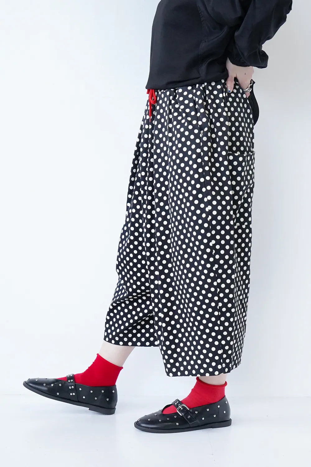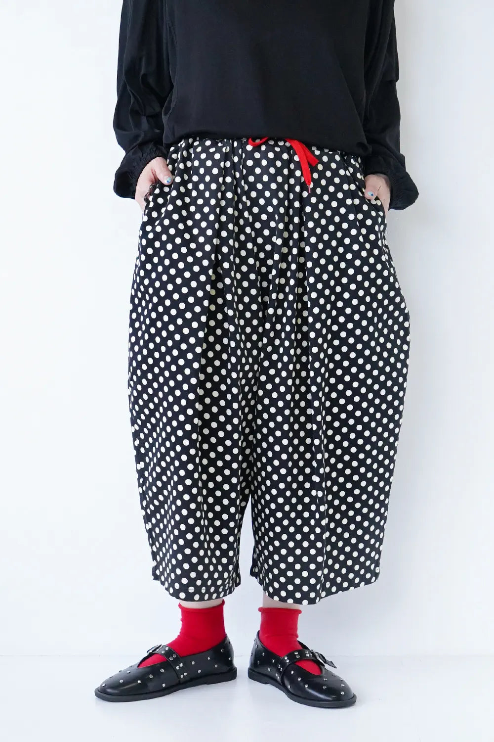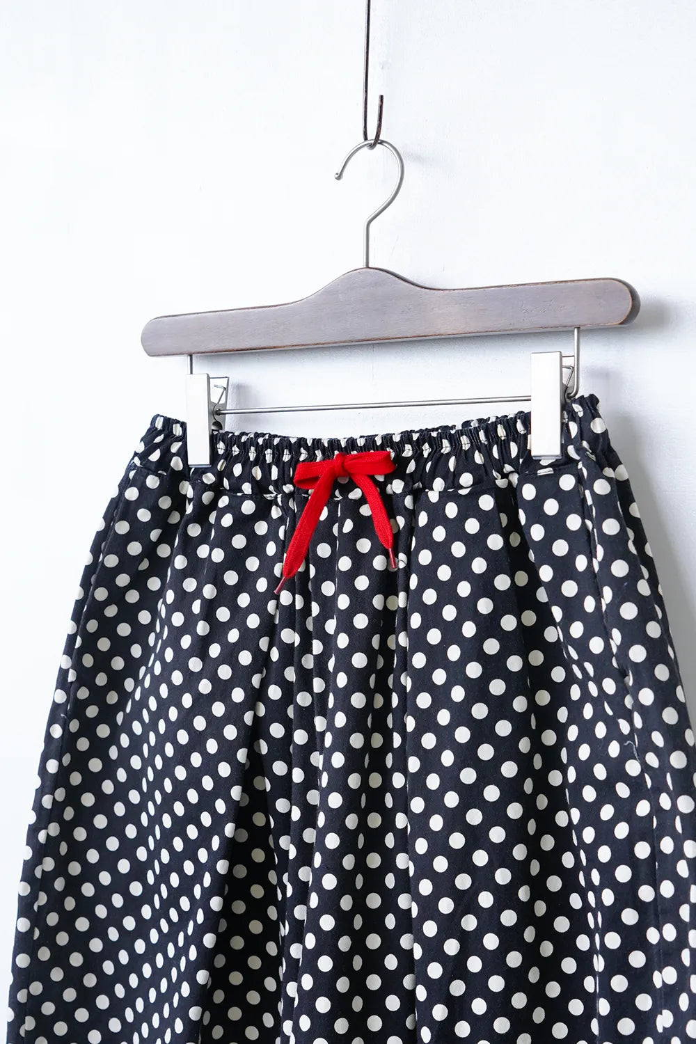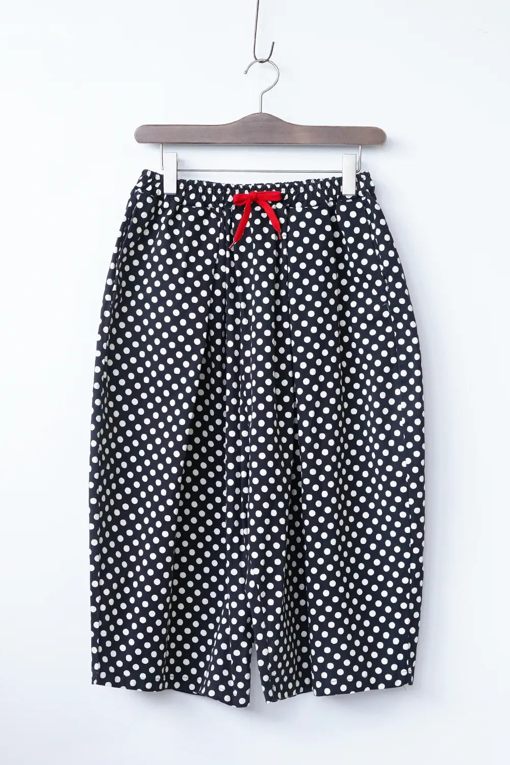 丸みのシルエットが特徴的なワイドパンツ。細かいドットプリントが施されドット好きさんには是非おすすめしたい1枚。さらっとした薄手生地で春夏に最適な素材感。足首が見える丈感なので靴下を合わせたスタイリングが楽しめます。ウエストのカラー紐と後ろのワッペンがアクセント◎