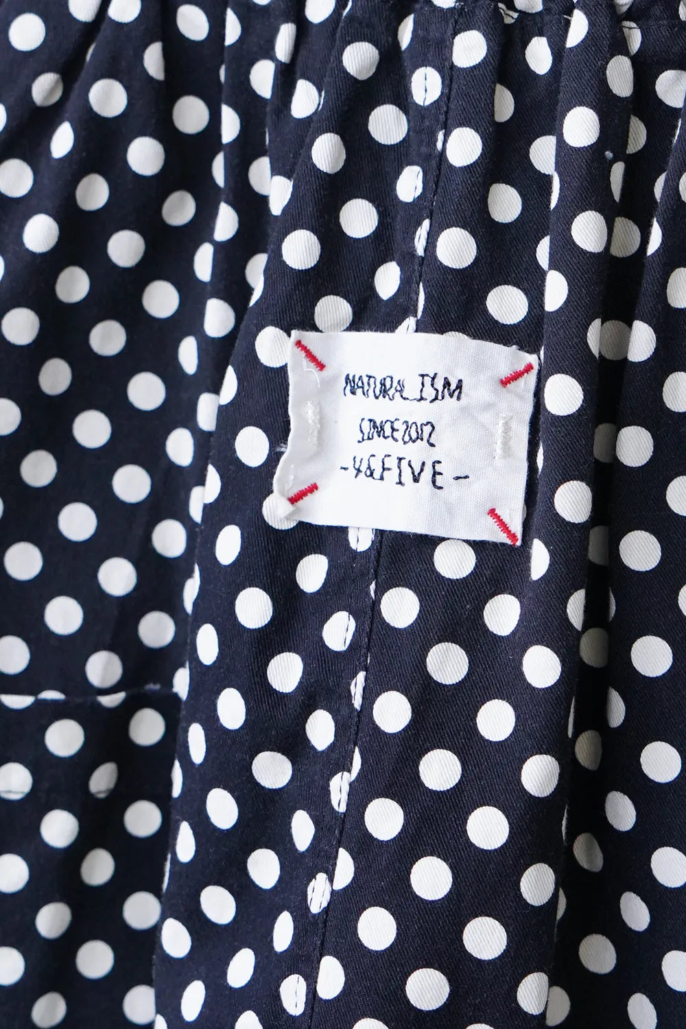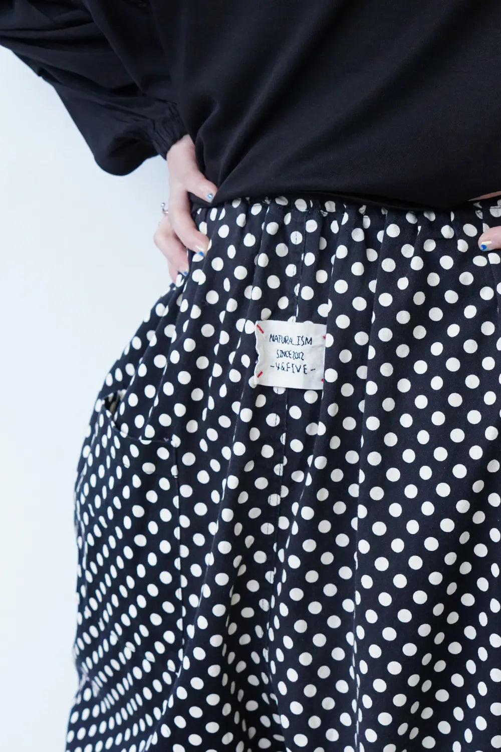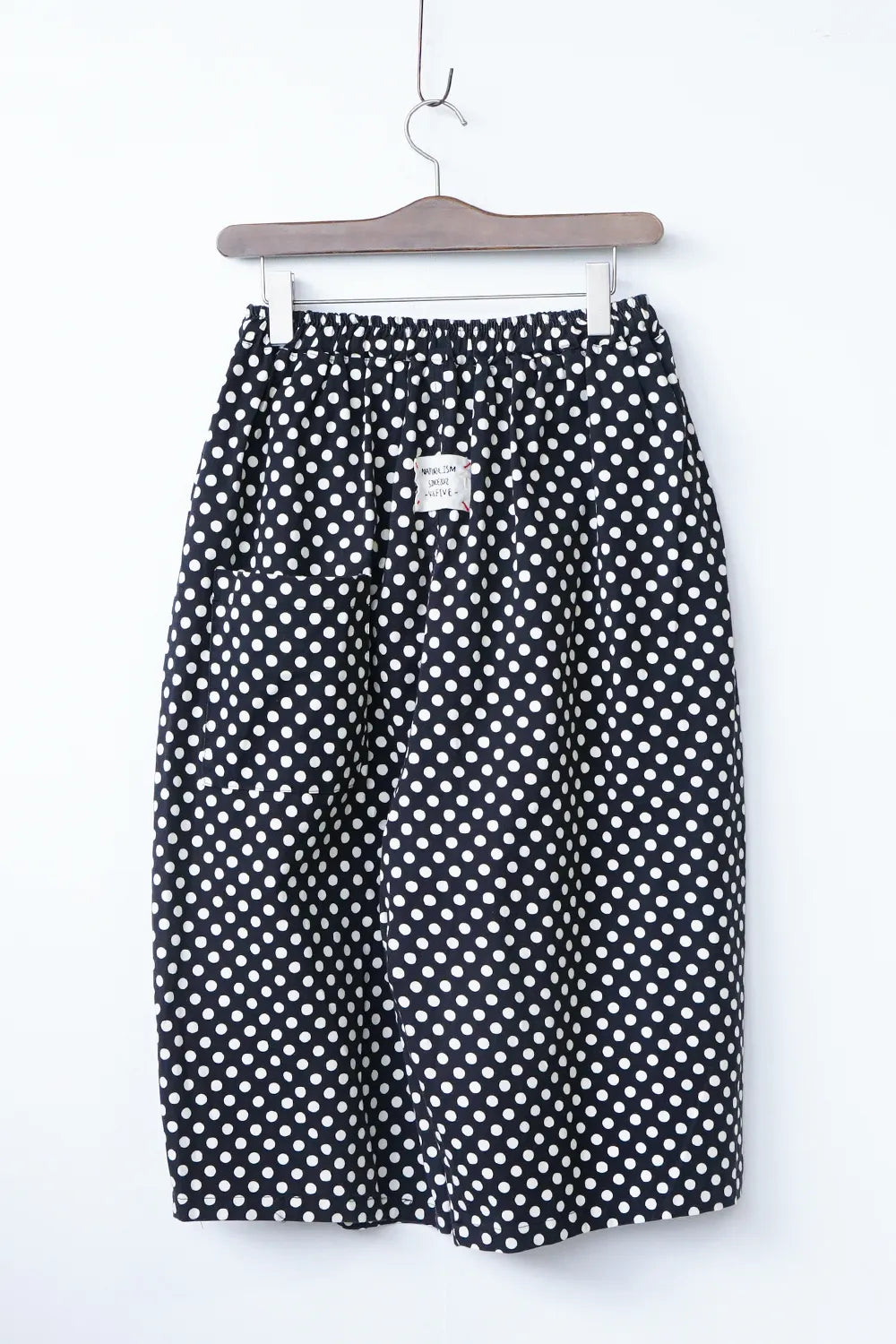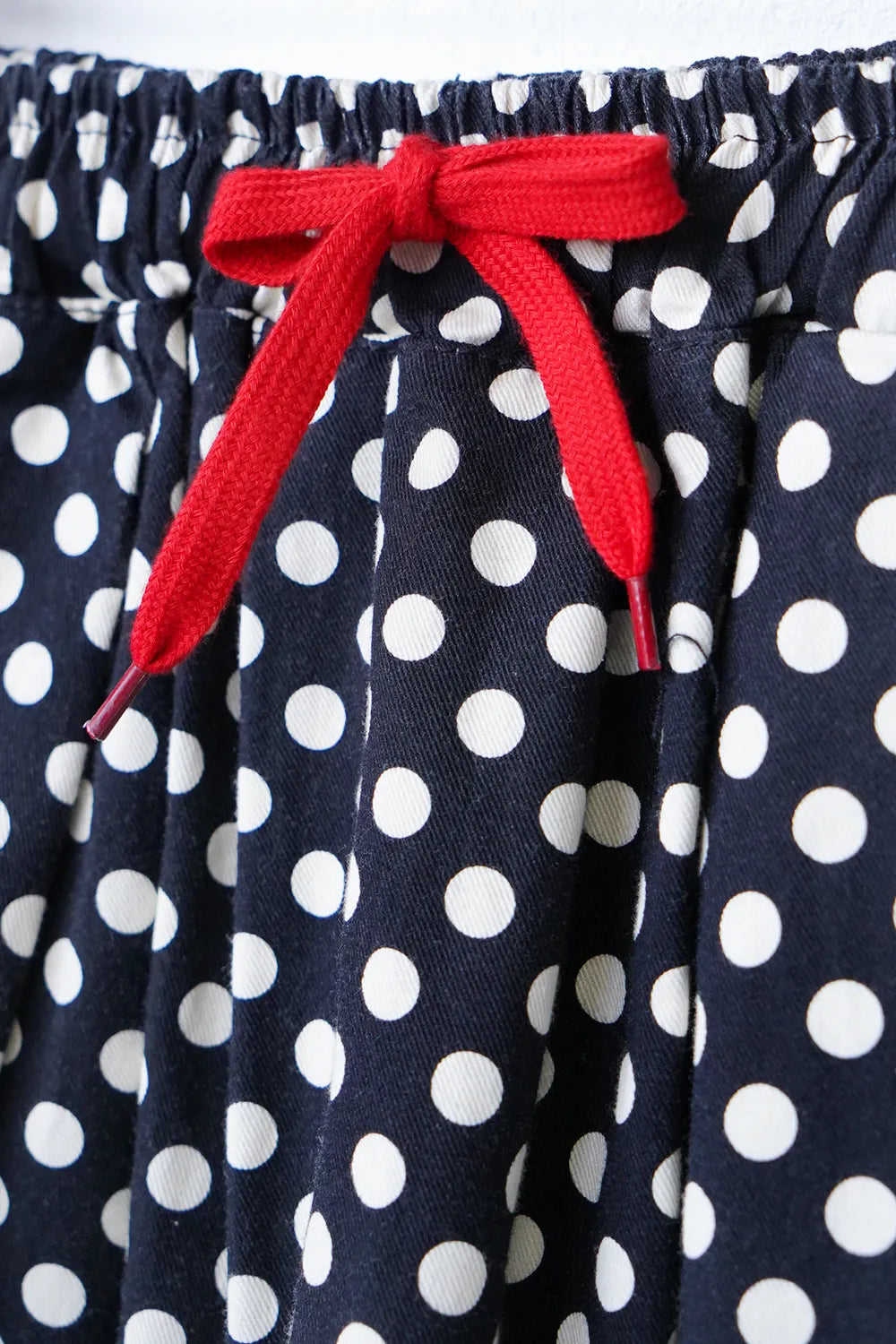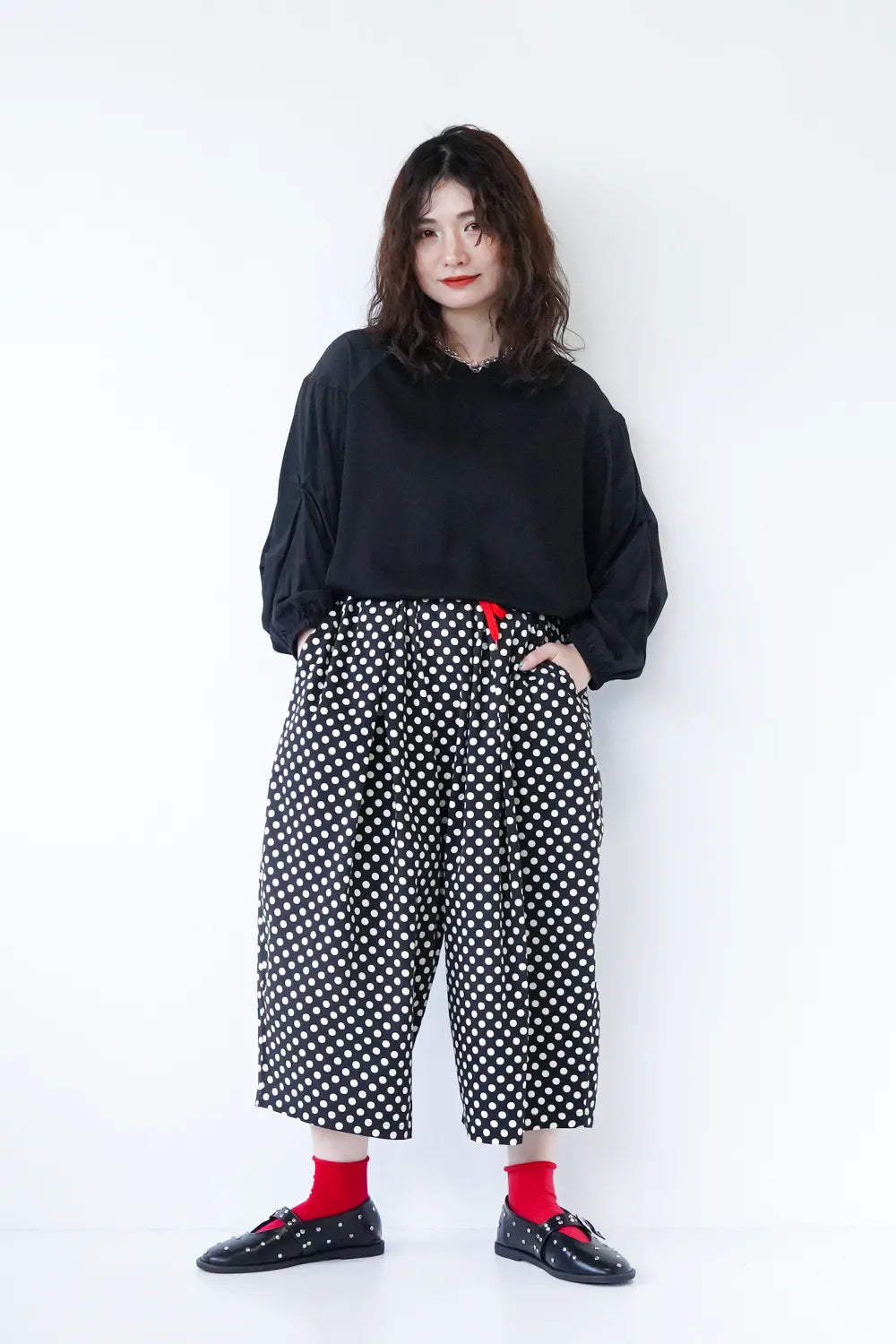 丸みのシルエットが特徴的なワイドパンツ。細かいドットプリントが施されドット好きさんには是非おすすめしたい1枚。さらっとした薄手生地で春夏に最適な素材感。足首が見える丈感なので靴下を合わせたスタイリングが楽しめます。ウエストのカラー紐と後ろのワッペンがアクセント◎