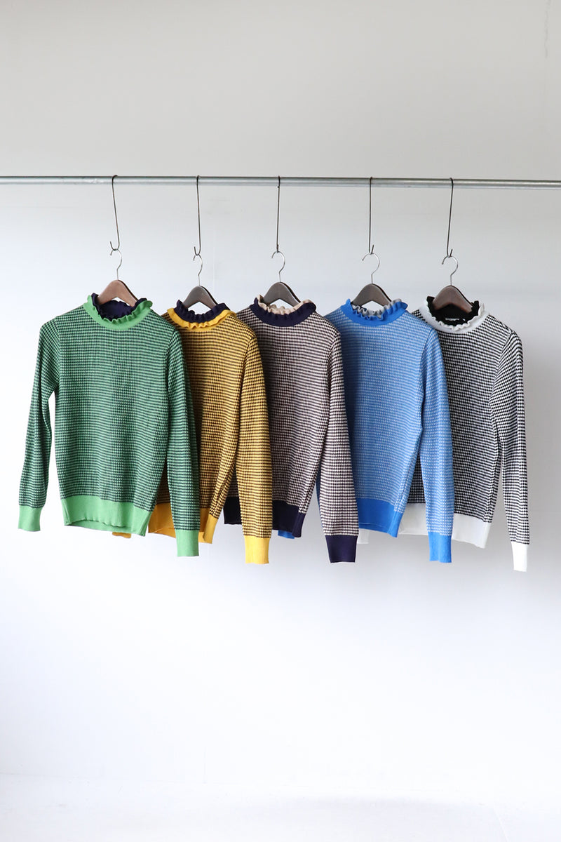 配色フリルネック 格子編みニットソー