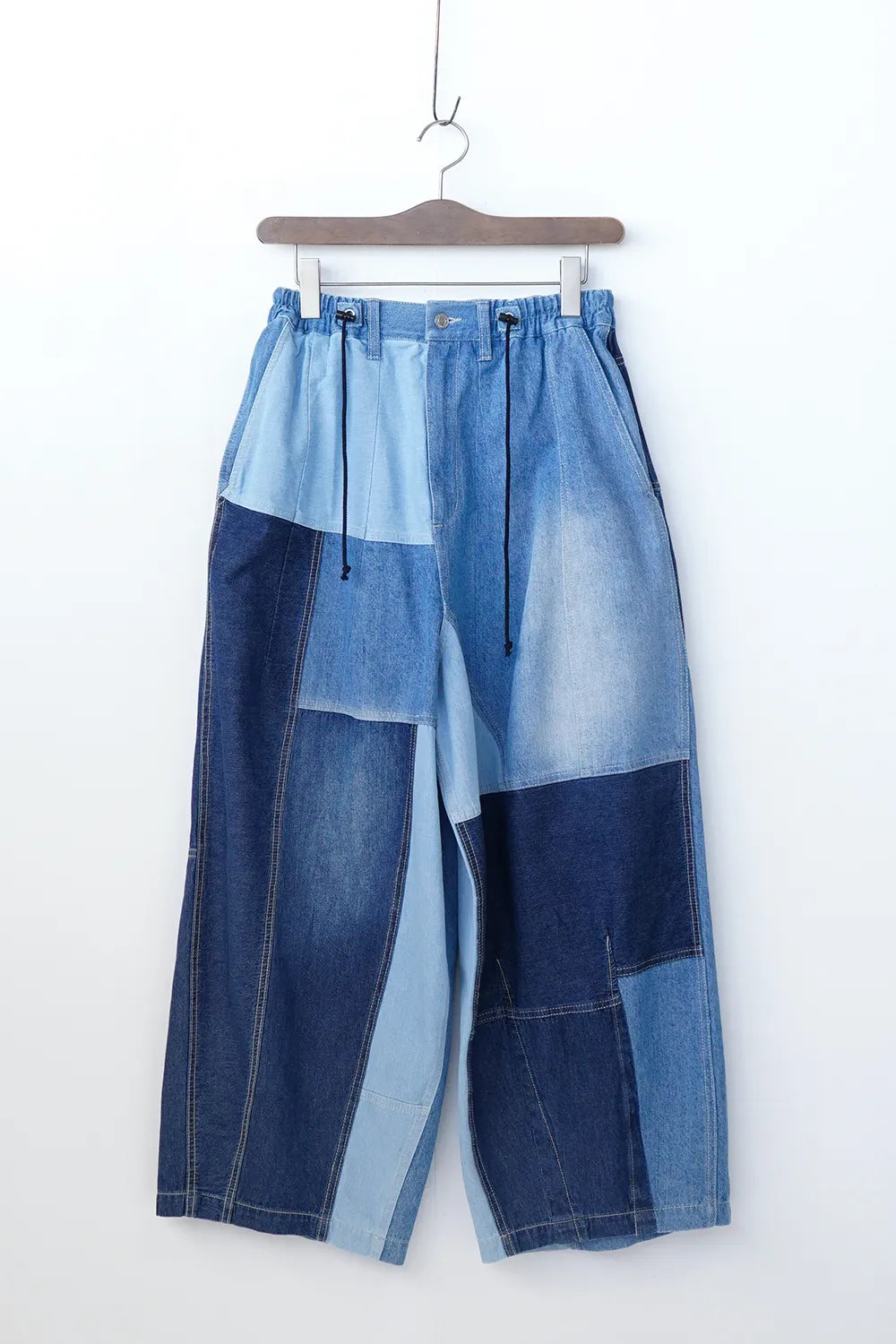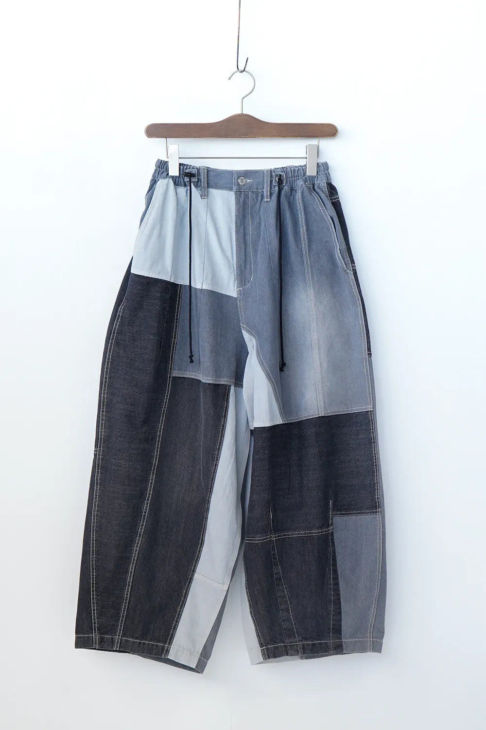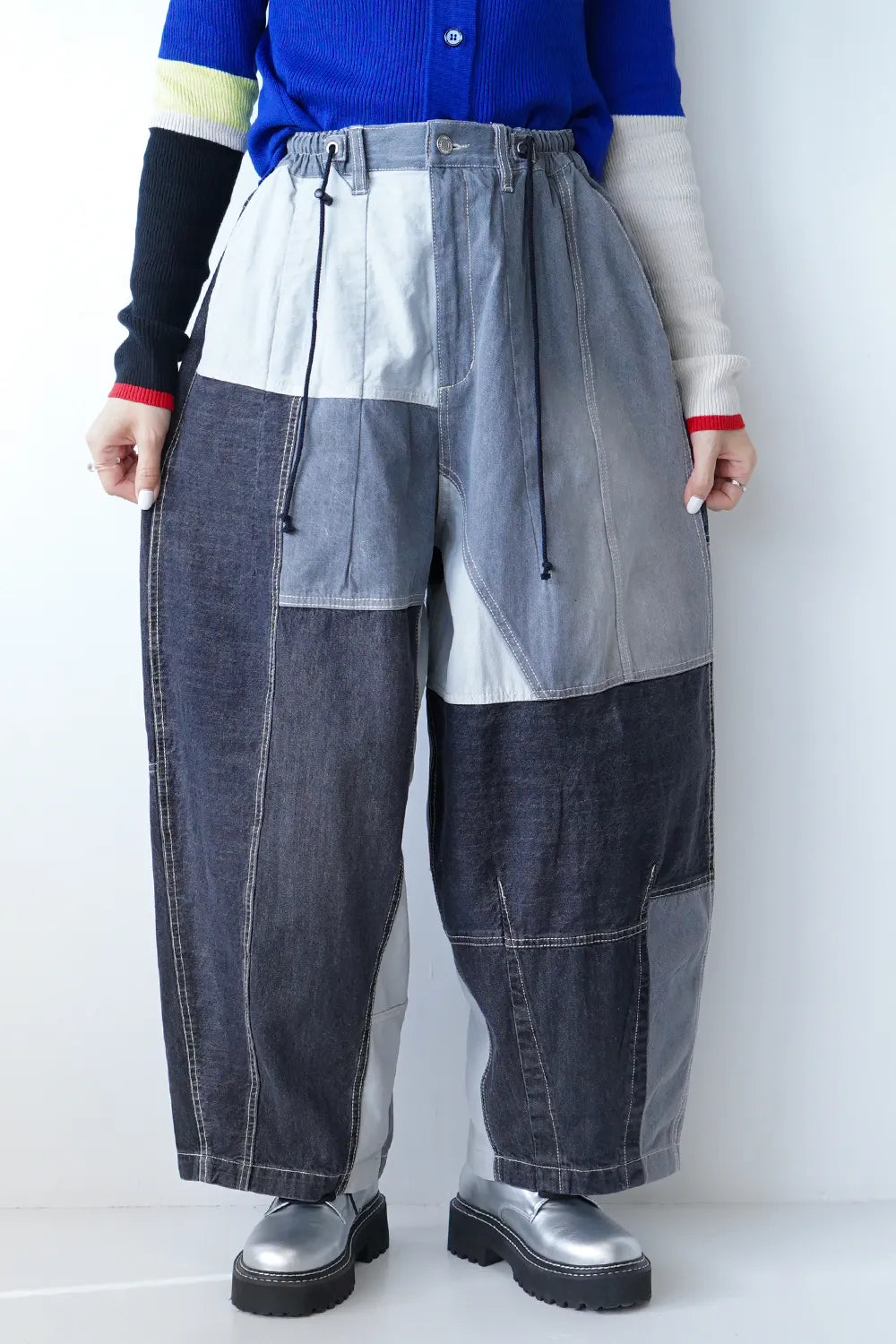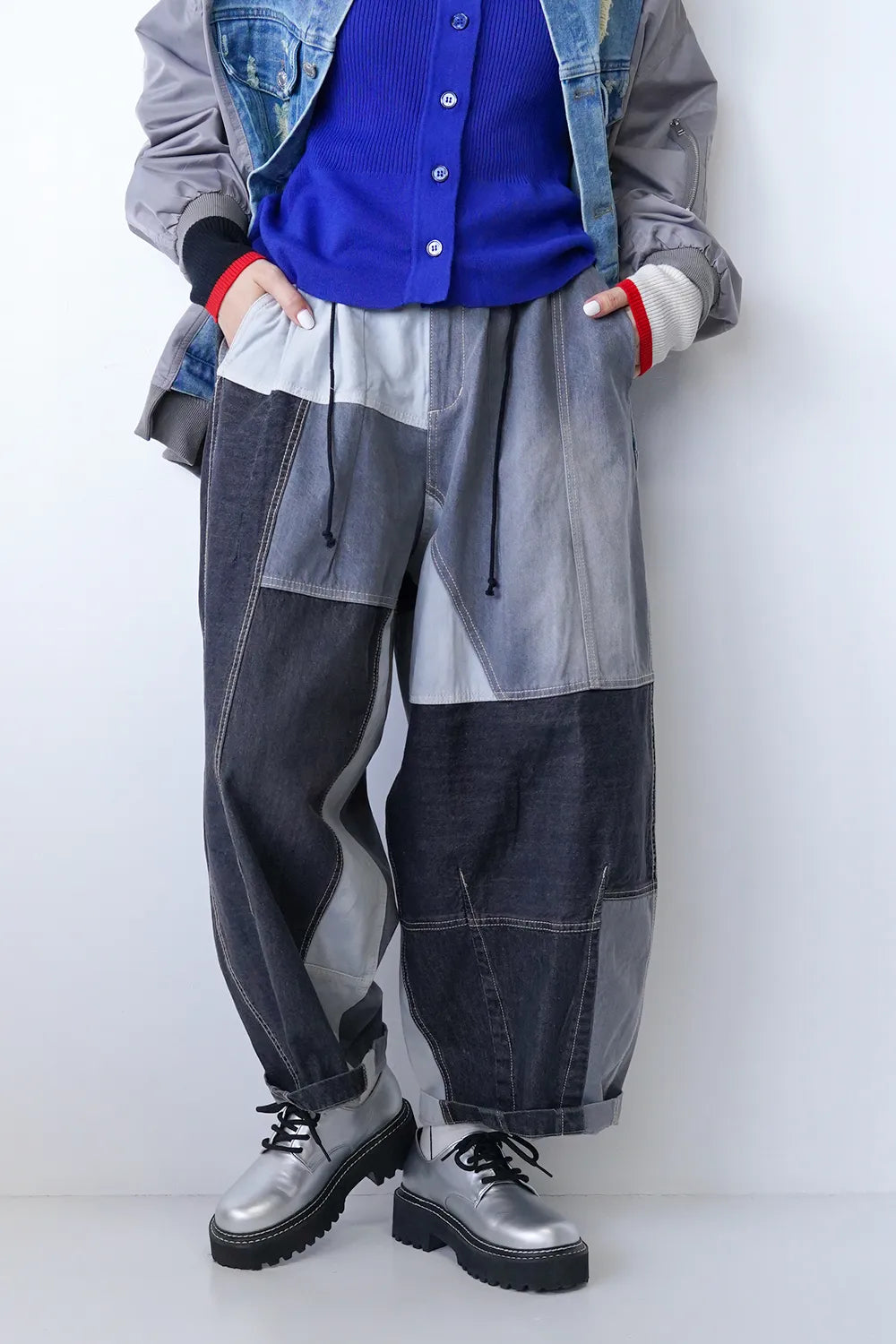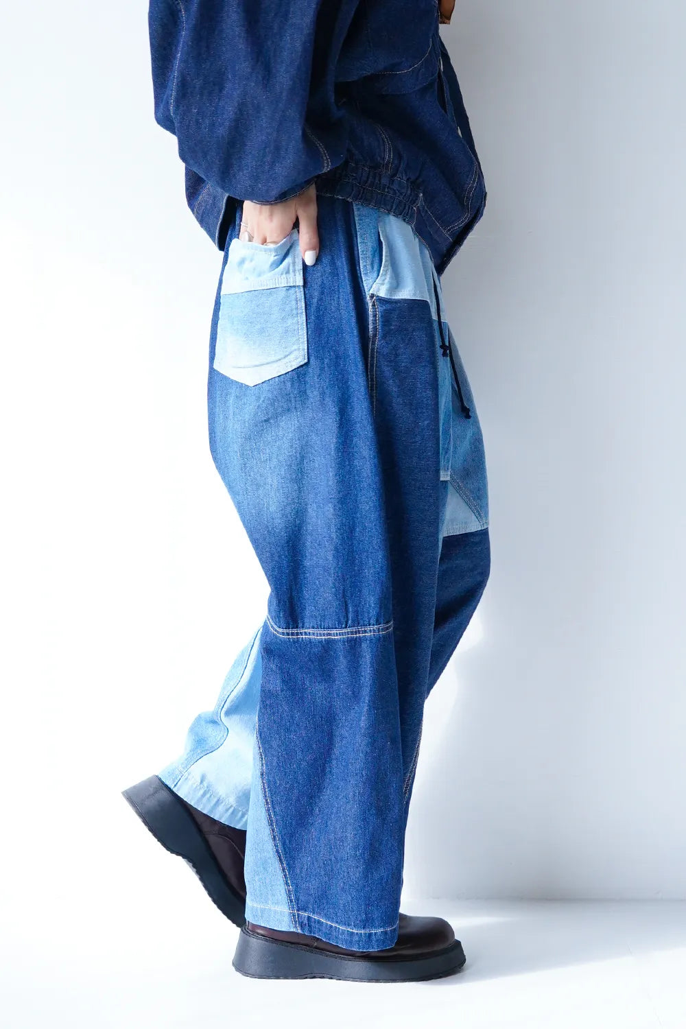 濃淡デニムがパッチワークされたデニムパンツ。ボリュームのあるシルエットで体系カバーにも◎ウエストは後ろゴムに加えてドロスト紐付きで調整可能。ゆったり履けるのでオーバーサイズがお好きな方におすすめ。メンズライクな雰囲気もありコーディネートの幅が広がりそうな1枚です。