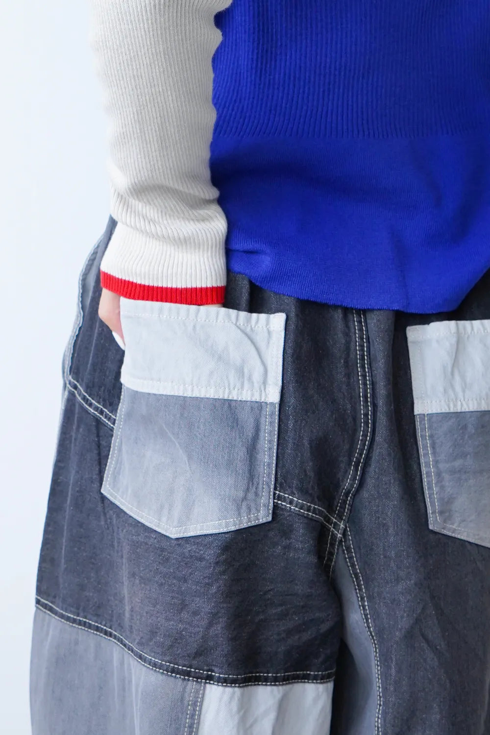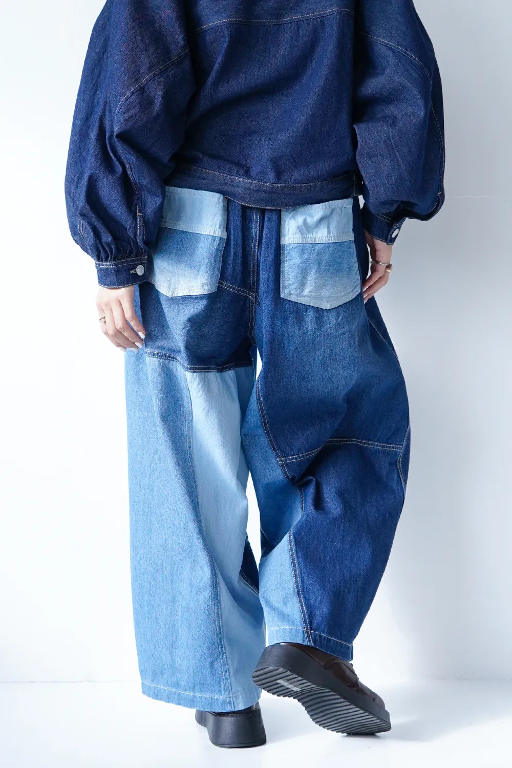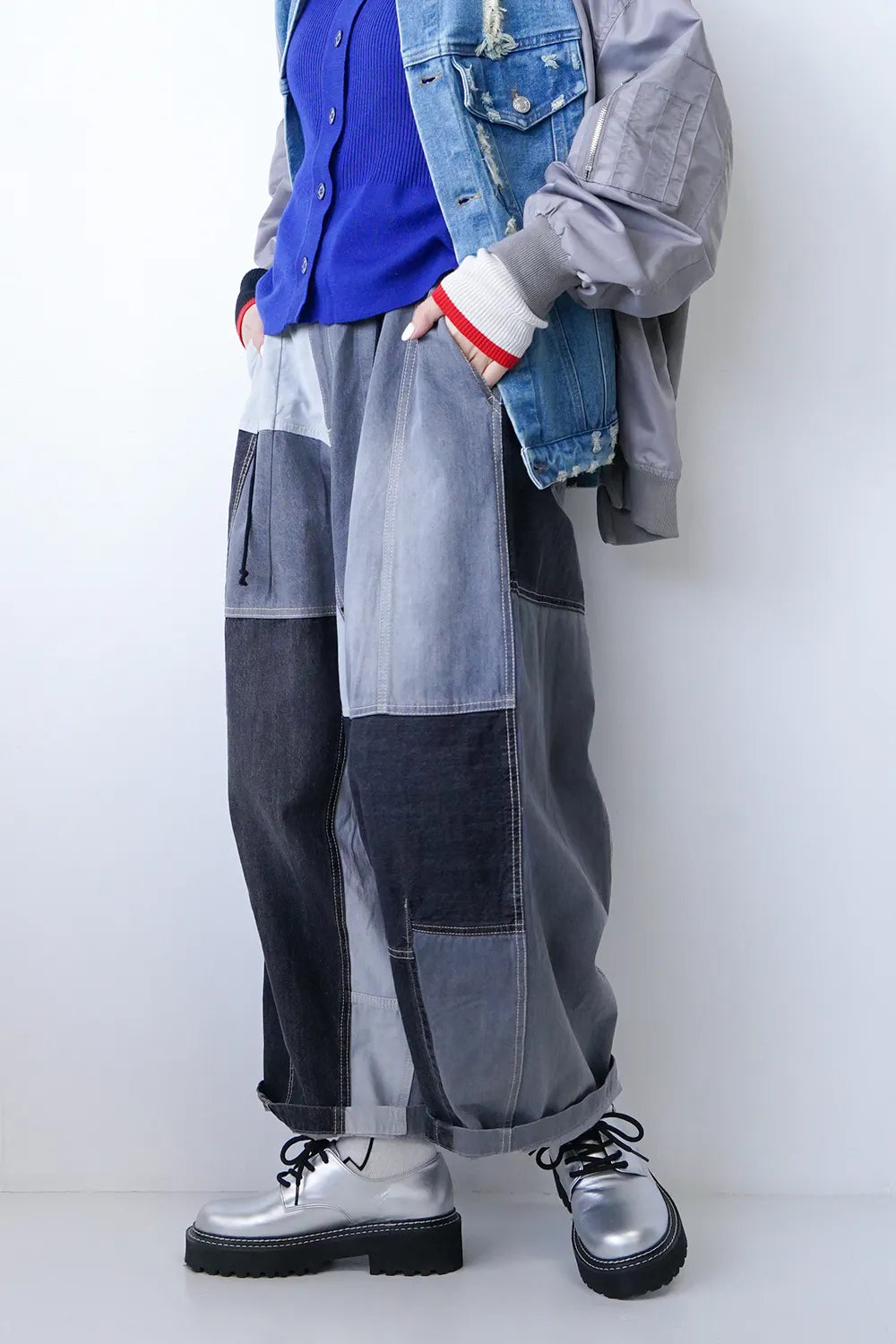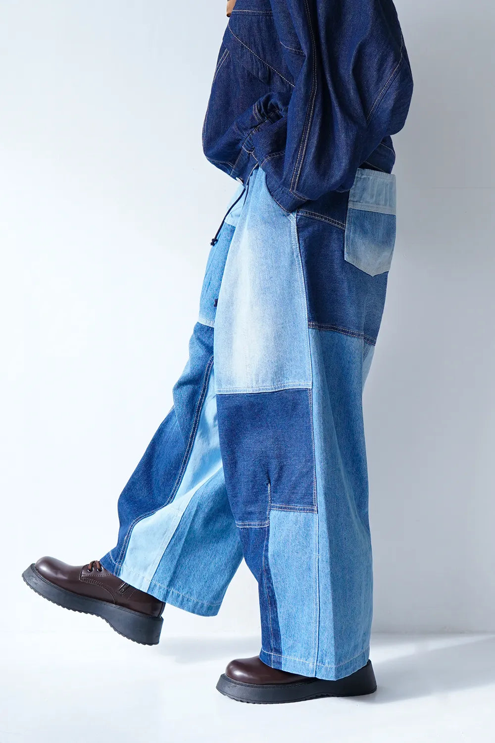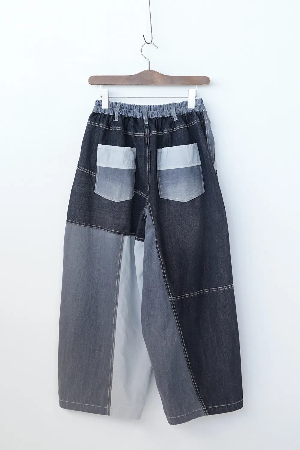 濃淡デニムがパッチワークされたデニムパンツ。ボリュームのあるシルエットで体系カバーにも◎ウエストは後ろゴムに加えてドロスト紐付きで調整可能。ゆったり履けるのでオーバーサイズがお好きな方におすすめ。メンズライクな雰囲気もありコーディネートの幅が広がりそうな1枚です。
