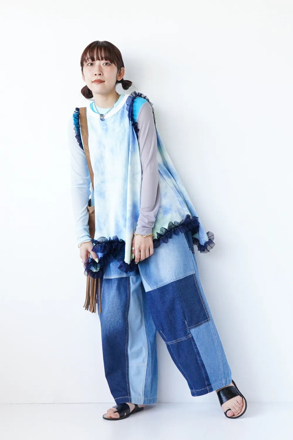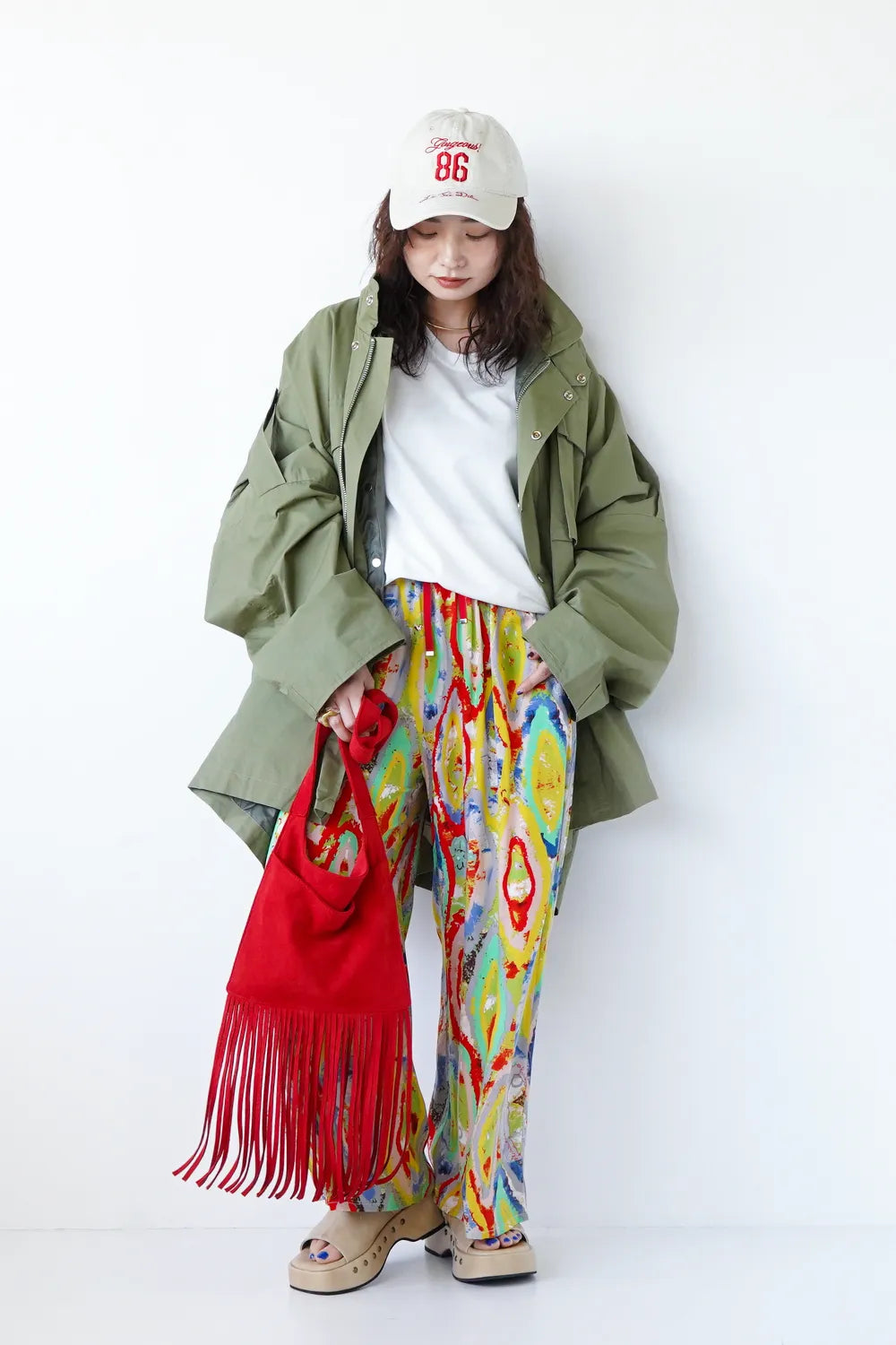 ※こちらの商品は性質上、摩擦に弱く色移りが起きやすい為、洗濯の際は単品手洗いを推薦します。 他の洗濯物と接触しないよう干す際も十分にお気をつけください。 また着用の摩擦で他の衣類などに色移りする可能性ある為、白い淡い色と組み合わせたコーディネートは極力お避け下さい。