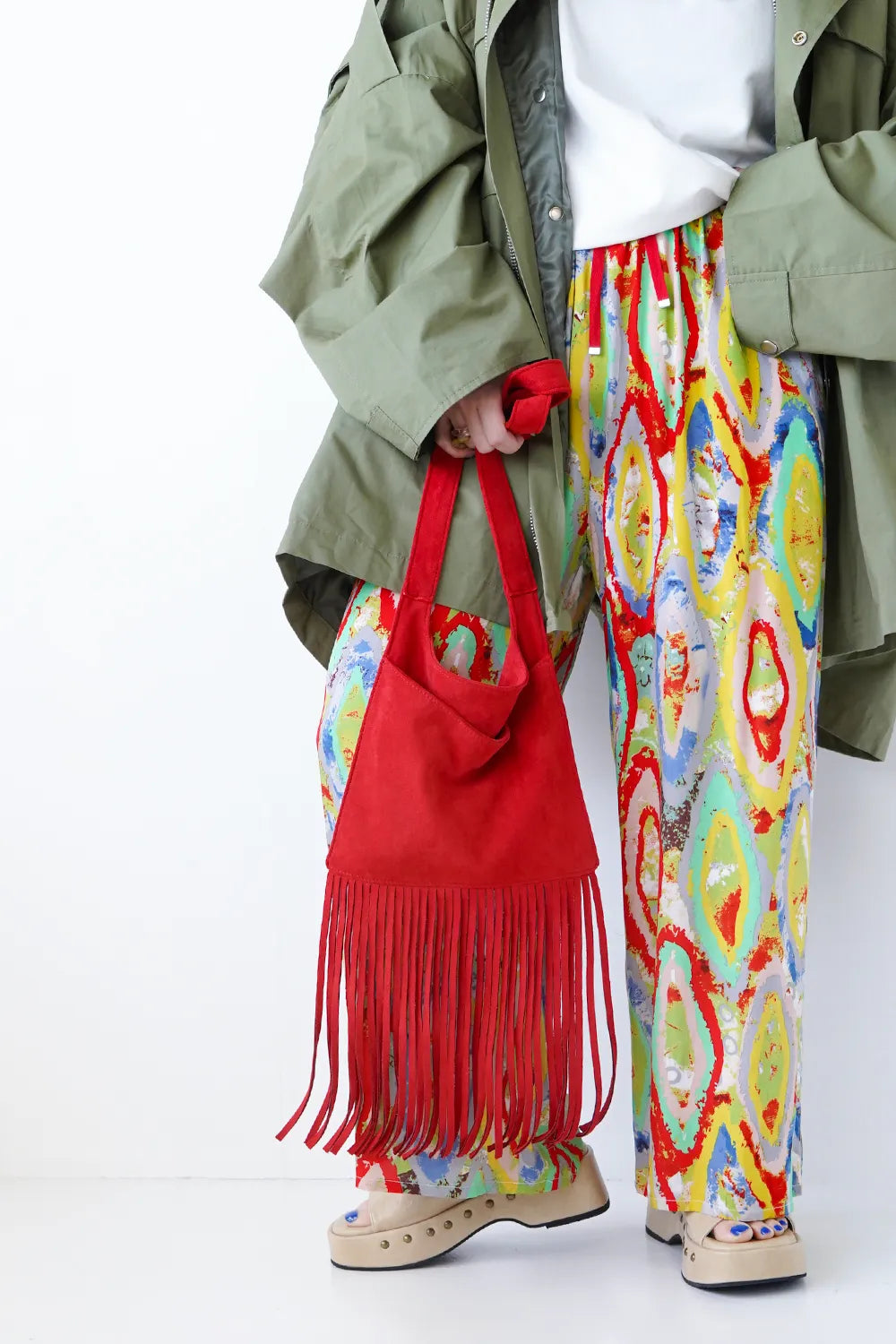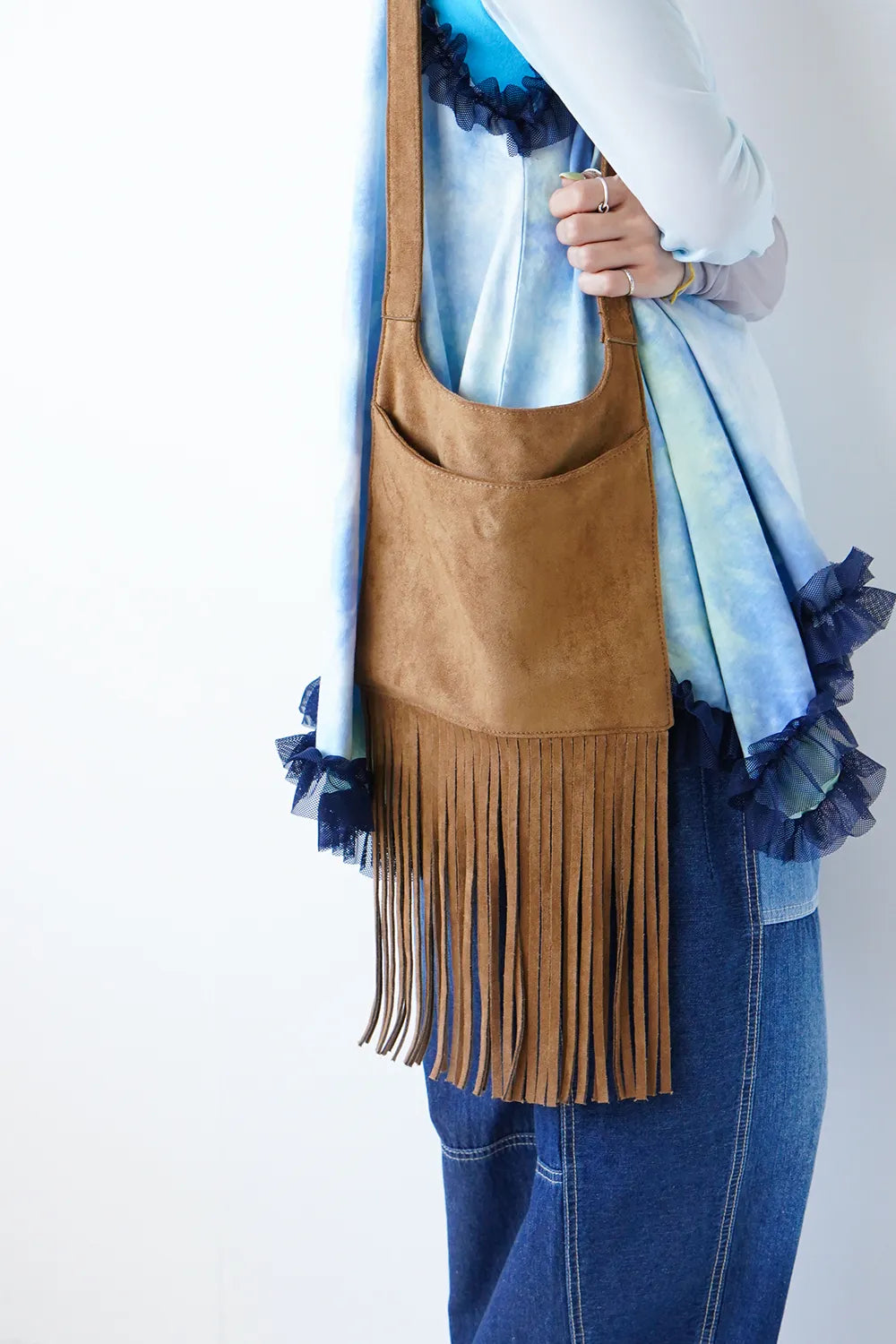 長めのフリンジデザインが特徴的なショルダーバッグ。必要最低限の荷物をコンパクトに収納できるサイズ感でコーディネートのアクセントに◎マグネットボタンでしっかり留まってくれる安心感のある仕様。動く度に揺れるフリンジデザインが印象的。小ぶりなので実用性よりはファッションアイテムとしてのプラスワンスタイル向き。