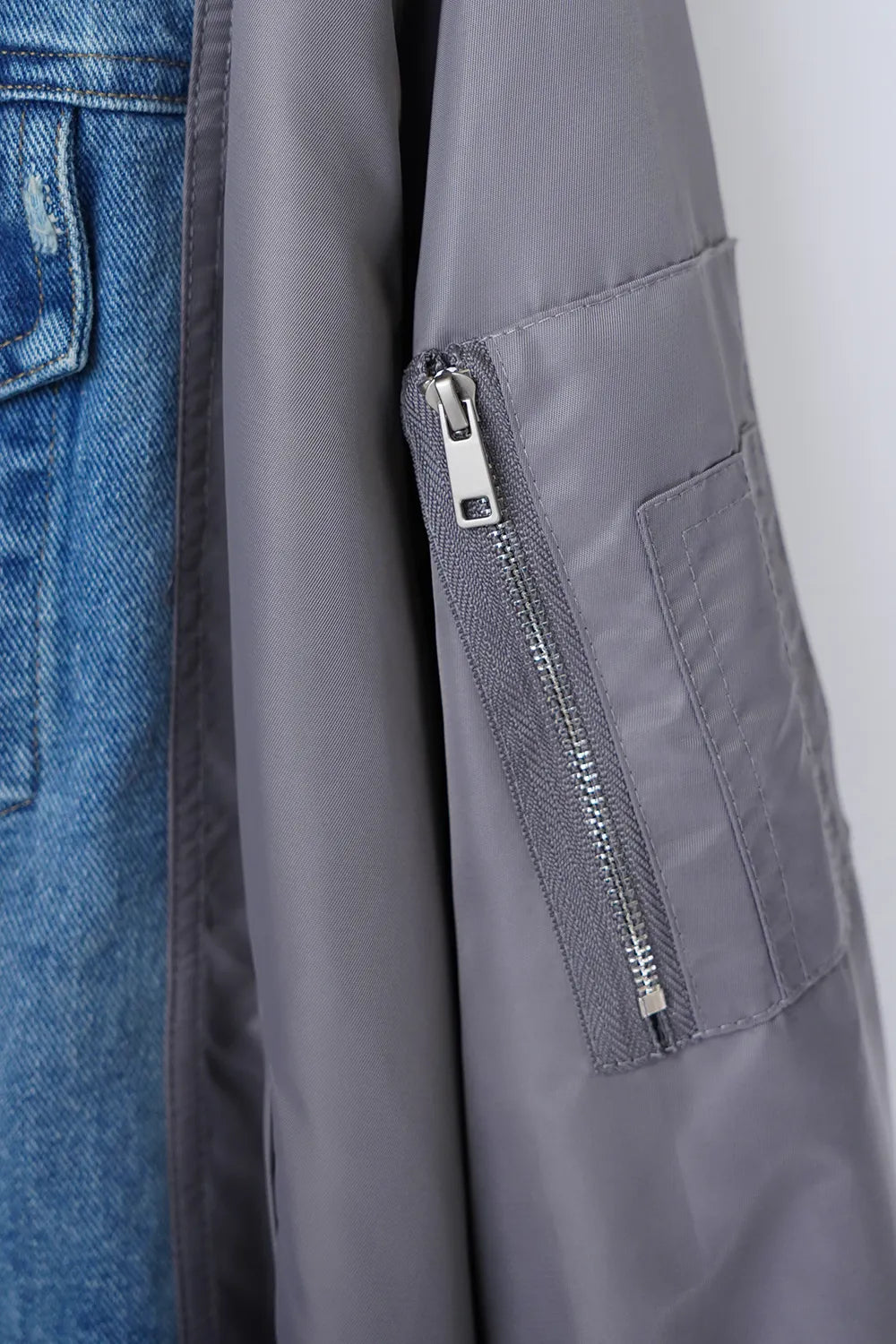 【MICALLE MICALLE】デニム地とMA-1をドッキングさせた個性派ブルゾン。デニムはダメージ加工が施されていてヴィンテージ感のある雰囲気に。ニットやトレーナーの上からも羽織りやすいオーバーシルエットがメンズライクな印象。裾と袖口はリブ使いのデザインです。