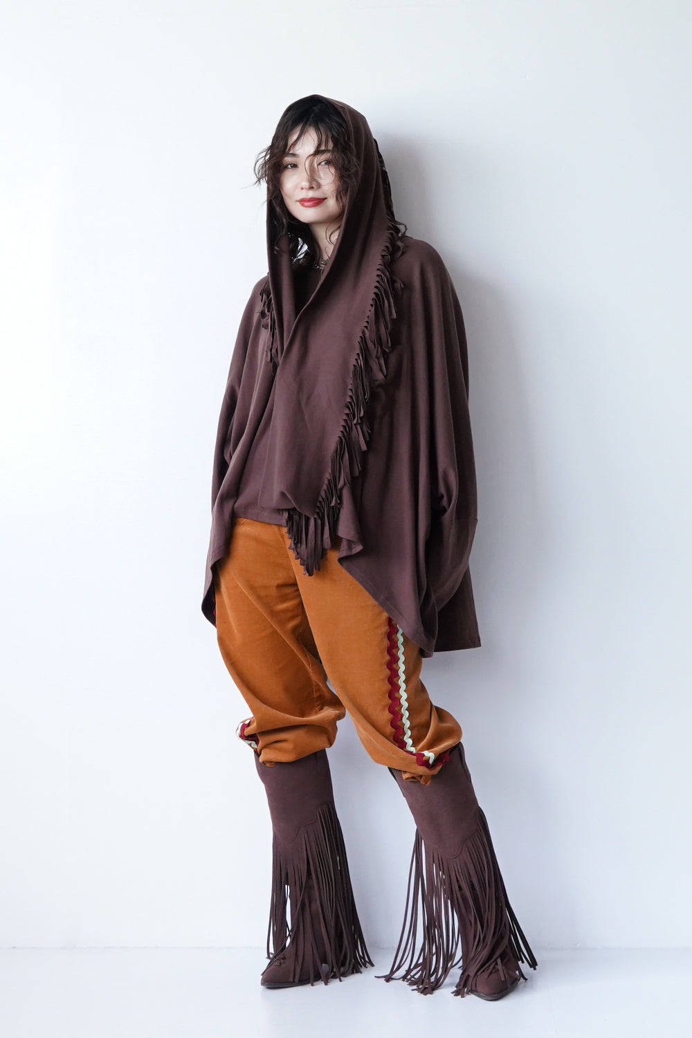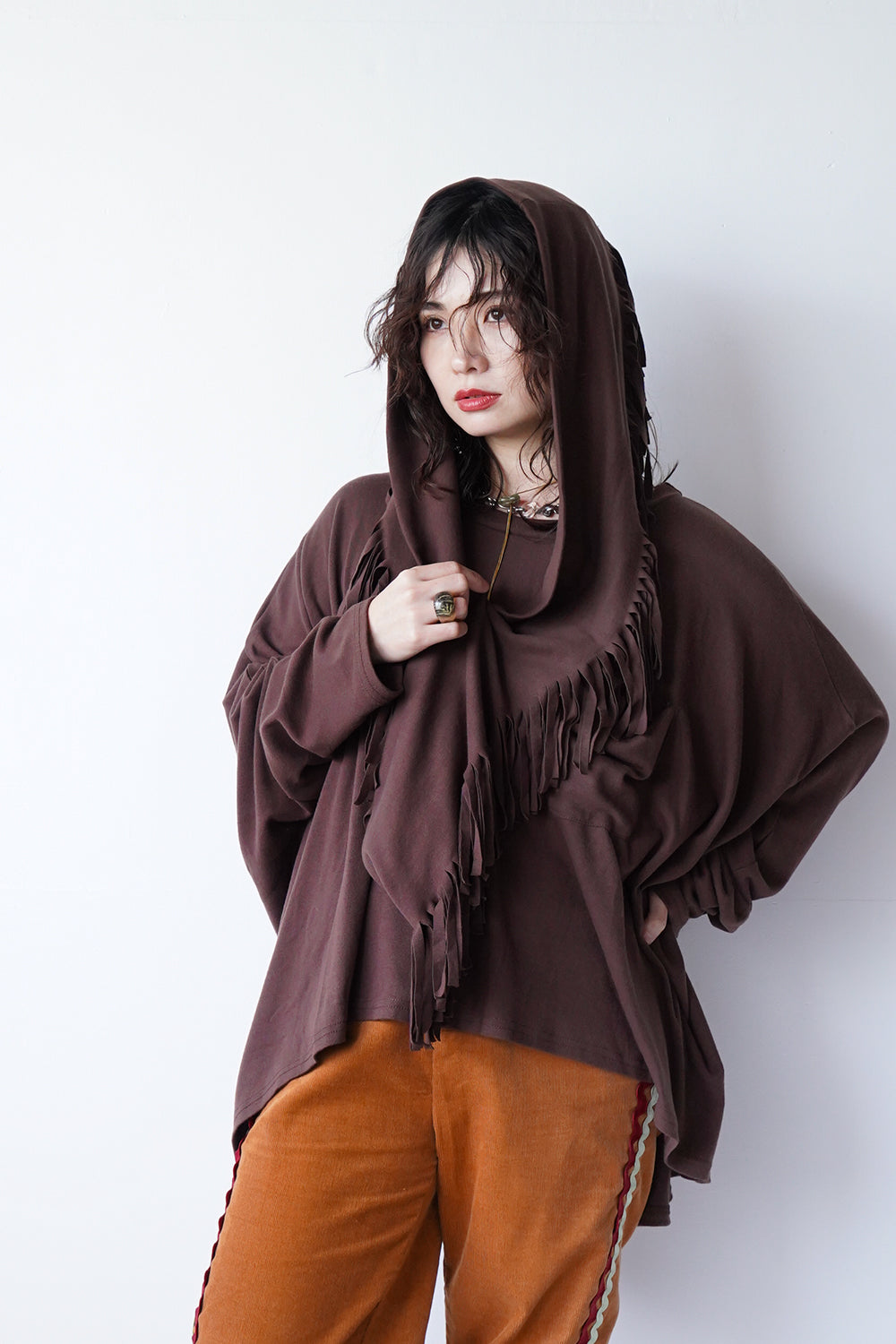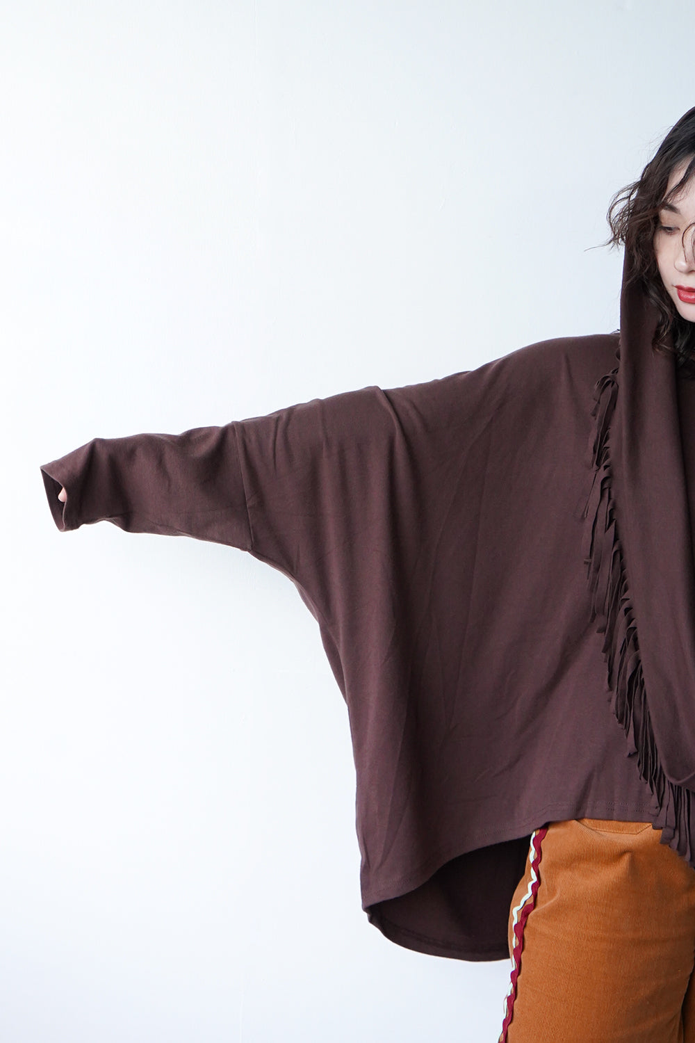 カントリー味あるブラウンはコーデュロイパンツと相性抜群!もちっと着心地のいい生地なので、ストールなしにカジュアルに着ても◎フリンジストールは用途いろいろで、頭に巻いても、首に巻いても、たすき掛けにしても^^