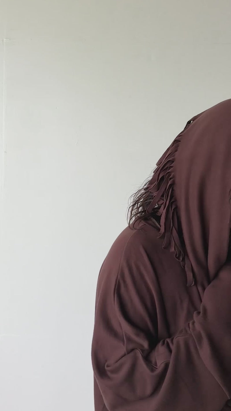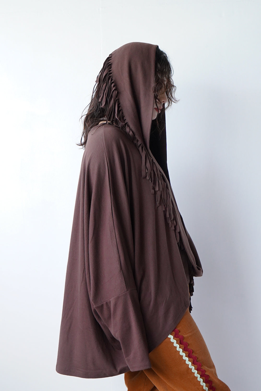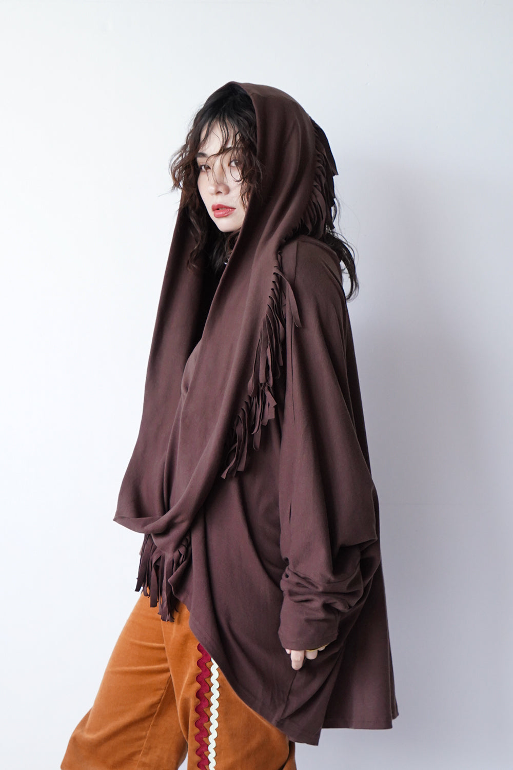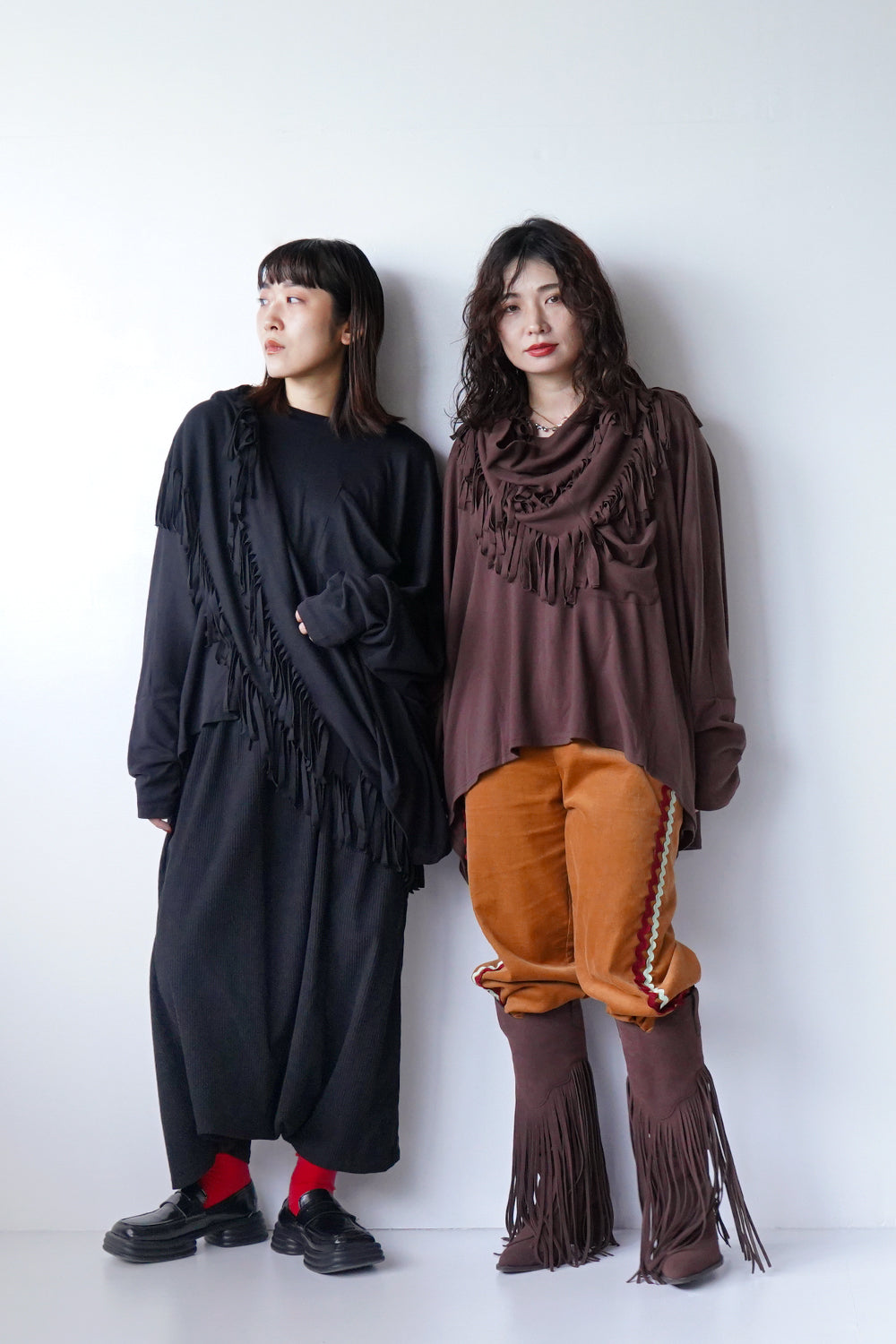 カントリー味あるブラウンはコーデュロイパンツと相性抜群!もちっと着心地のいい生地なので、ストールなしにカジュアルに着ても◎フリンジストールは用途いろいろで、頭に巻いても、首に巻いても、たすき掛けにしても^^