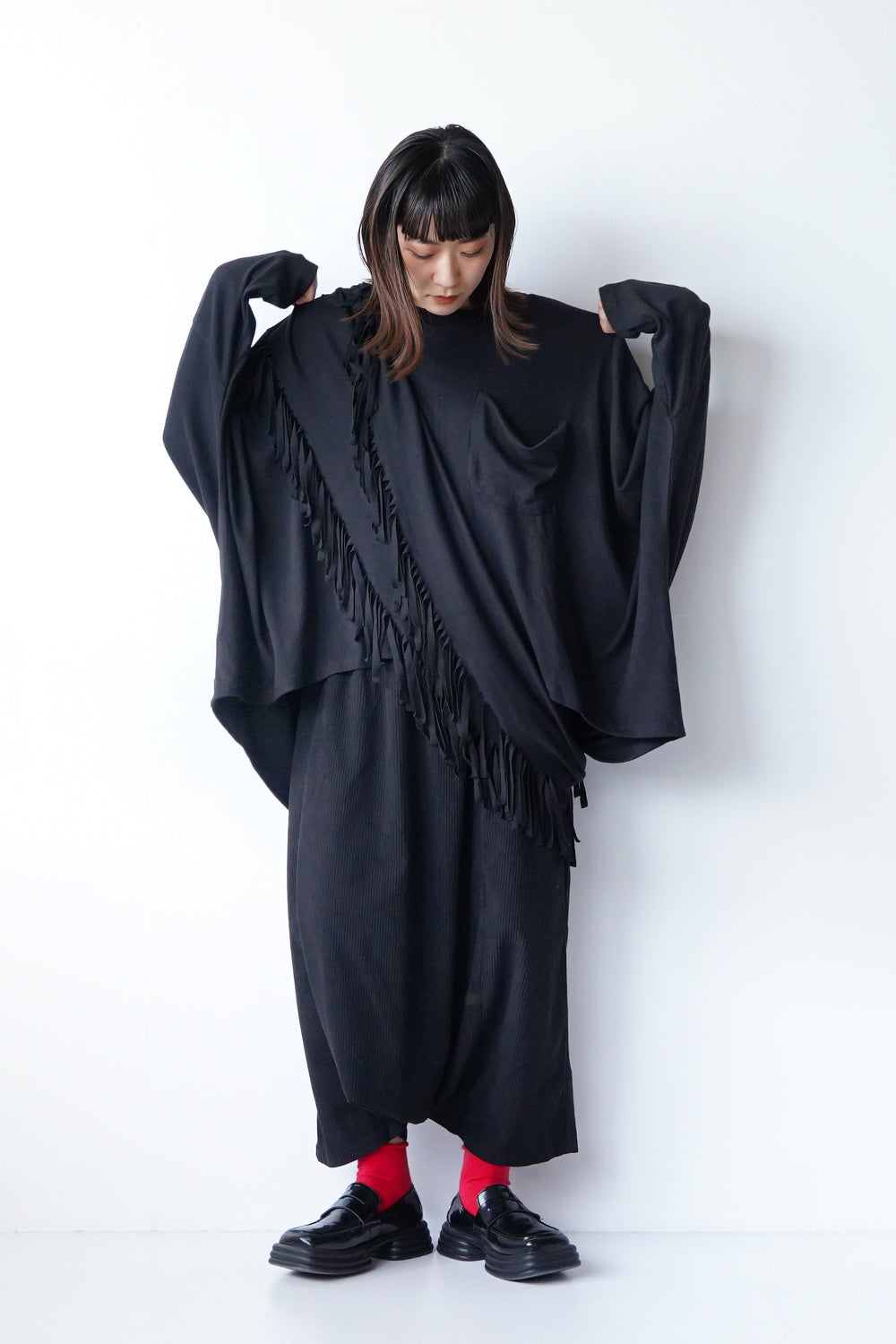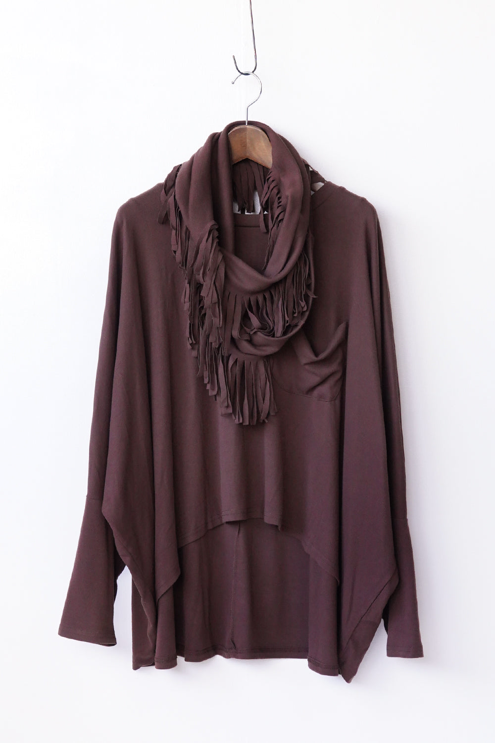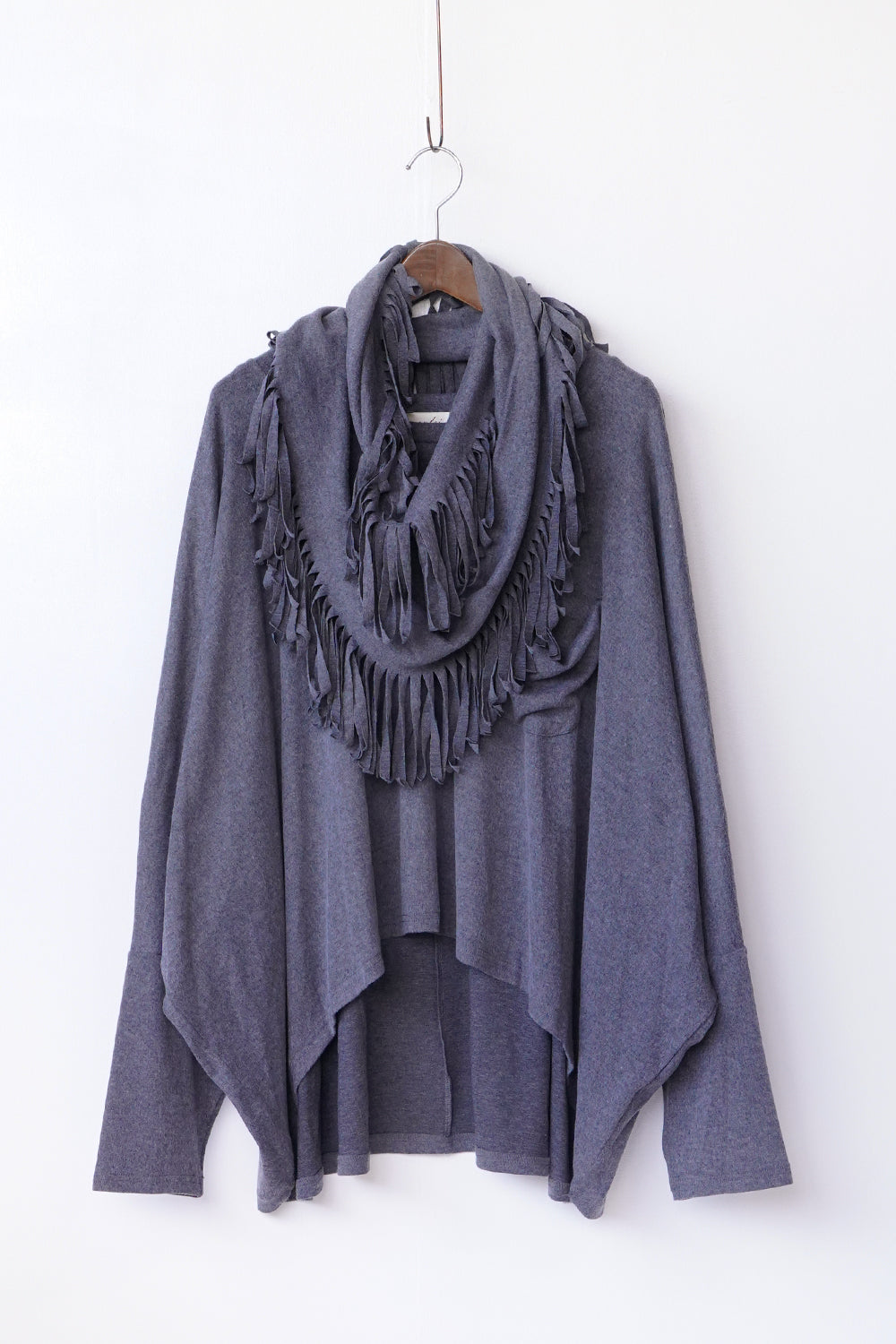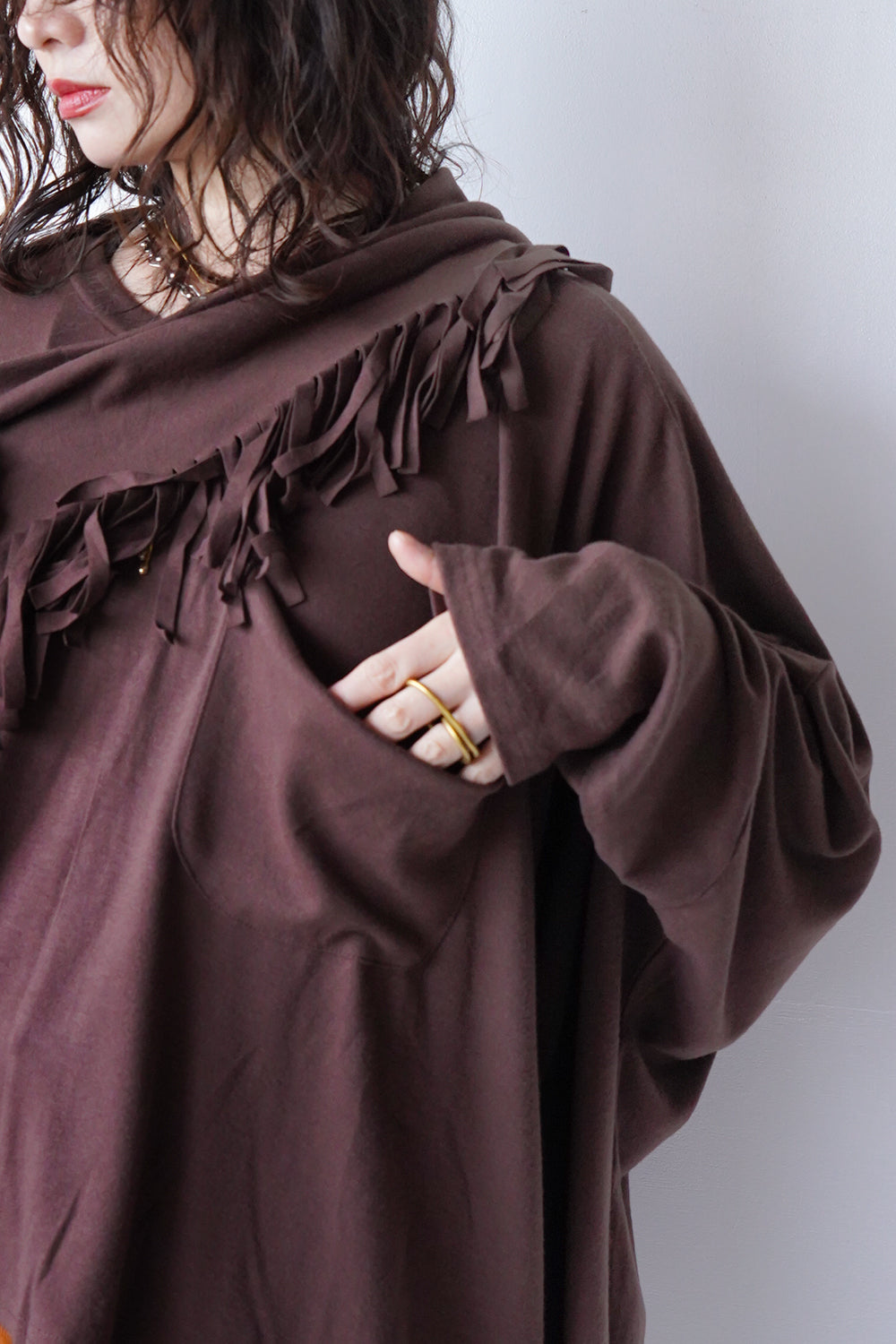 フリンジスヌードがセットになったワイドプルオーバー。たっぷり身幅のストレスフリーなサイズ感。着る人を選ばないシルエットで体系カバーにも◎単品でも使えるスヌードはセットで着るとよりスタイリングを高めてくれる嬉しいアイテム。顔回り以外にもたすき掛けなどアレンジ場所を変えて雰囲気を楽しめます。