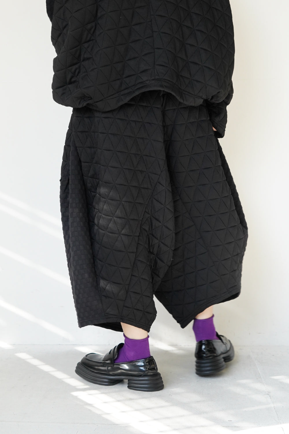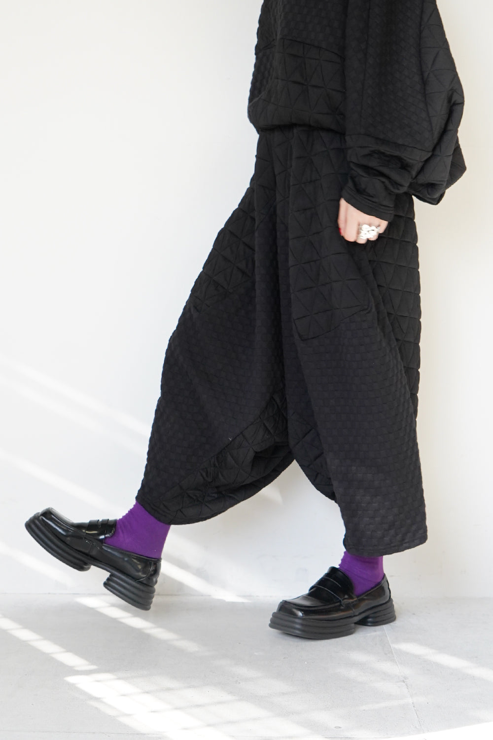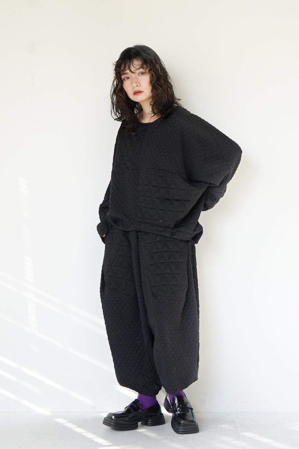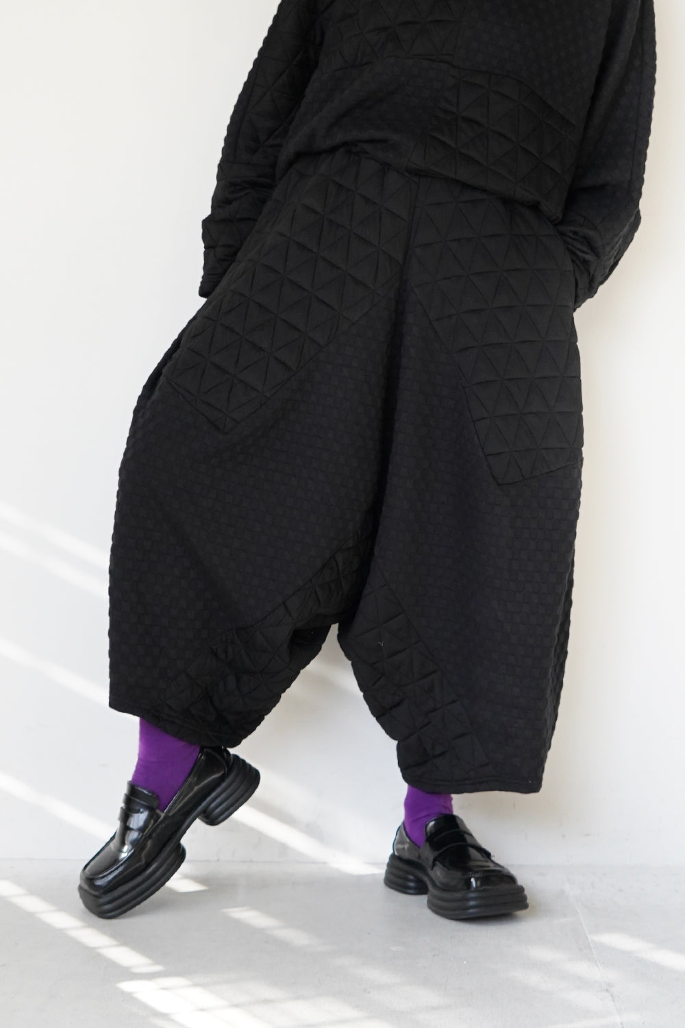暖かみのあるキルティング素材が冬らしいサルエルパンツ。たっぷり分量感のあるサイズ感は体のラインを拾わない安心感のあるシルエット。リラックス感のある素材感とモードな雰囲気が漂う1枚。同生地のプルオーバーとのセットアップもおすすめです。