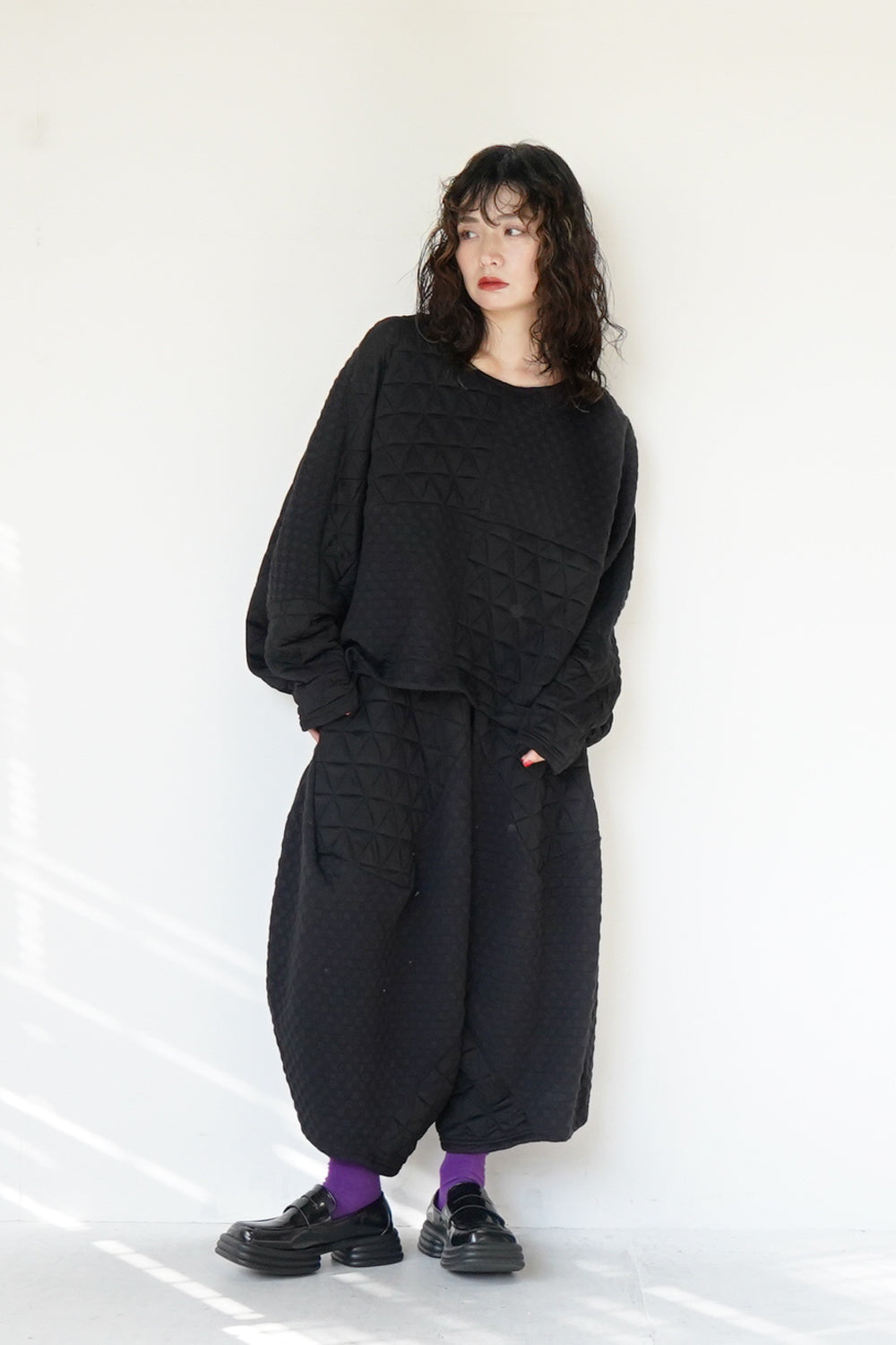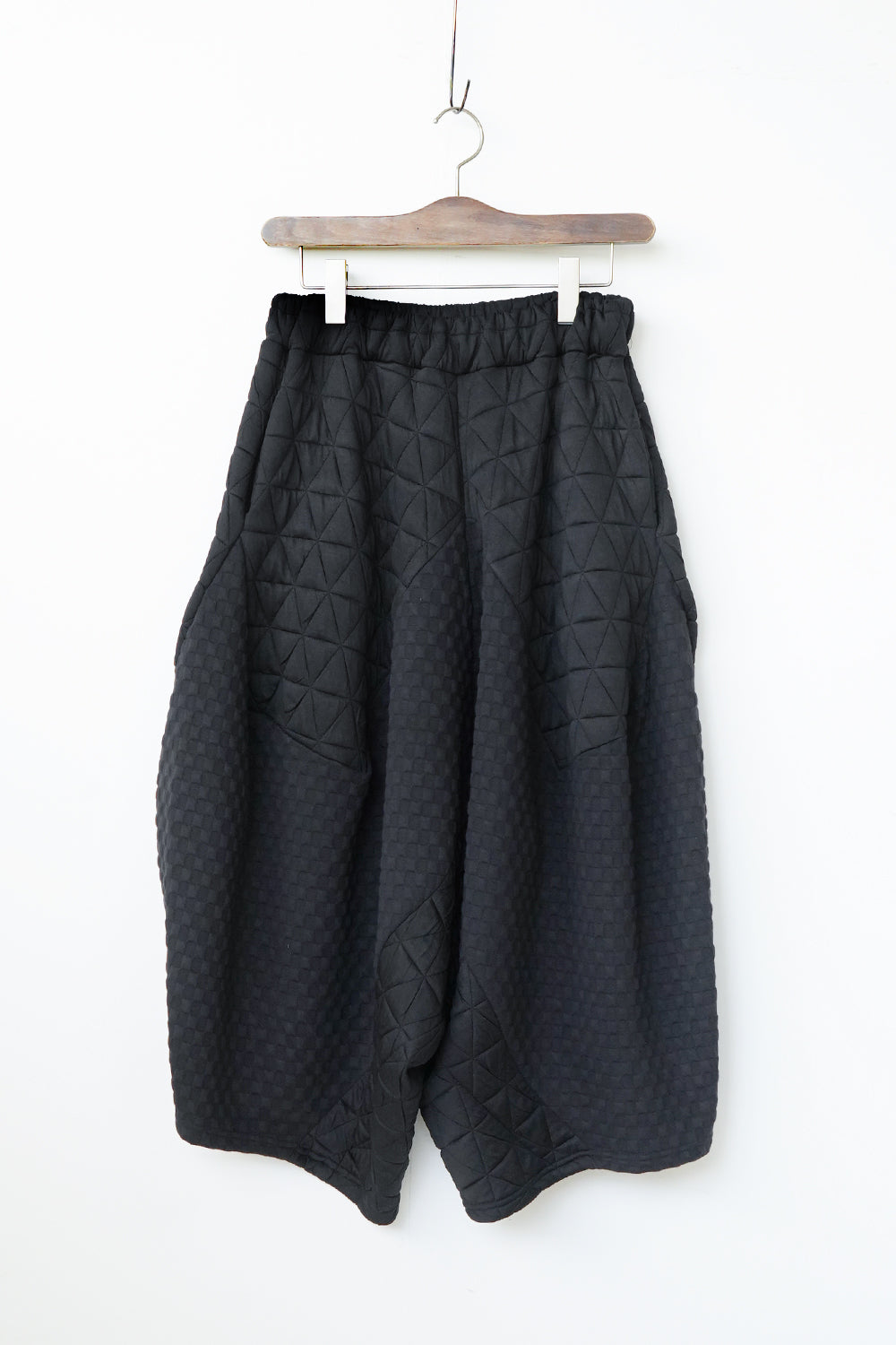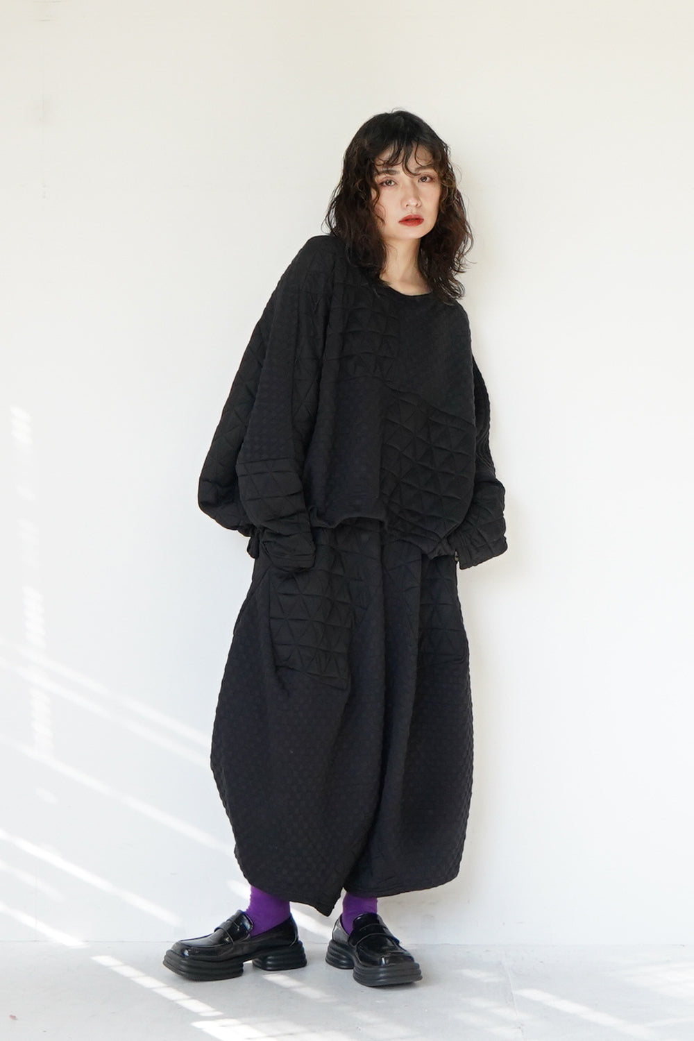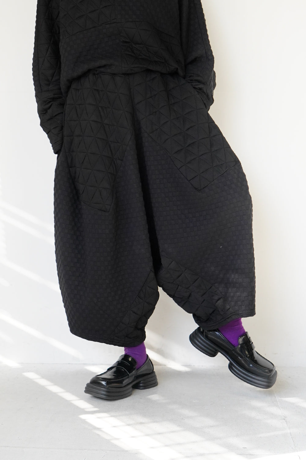 暖かみのあるキルティング素材が冬らしいサルエルパンツ。たっぷり分量感のあるサイズ感は体のラインを拾わない安心感のあるシルエット。リラックス感のある素材感とモードな雰囲気が漂う1枚。同生地のプルオーバーとのセットアップもおすすめです。