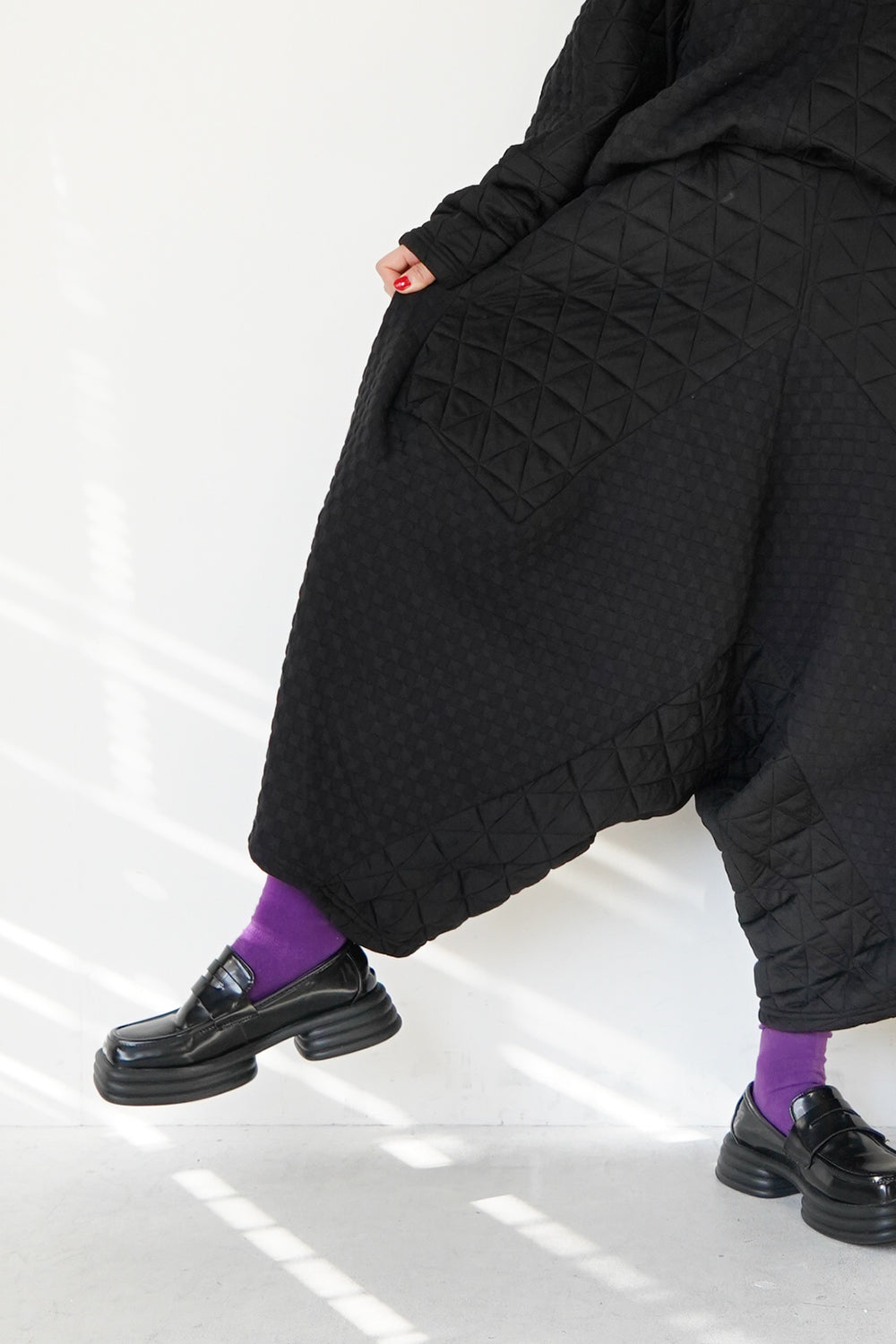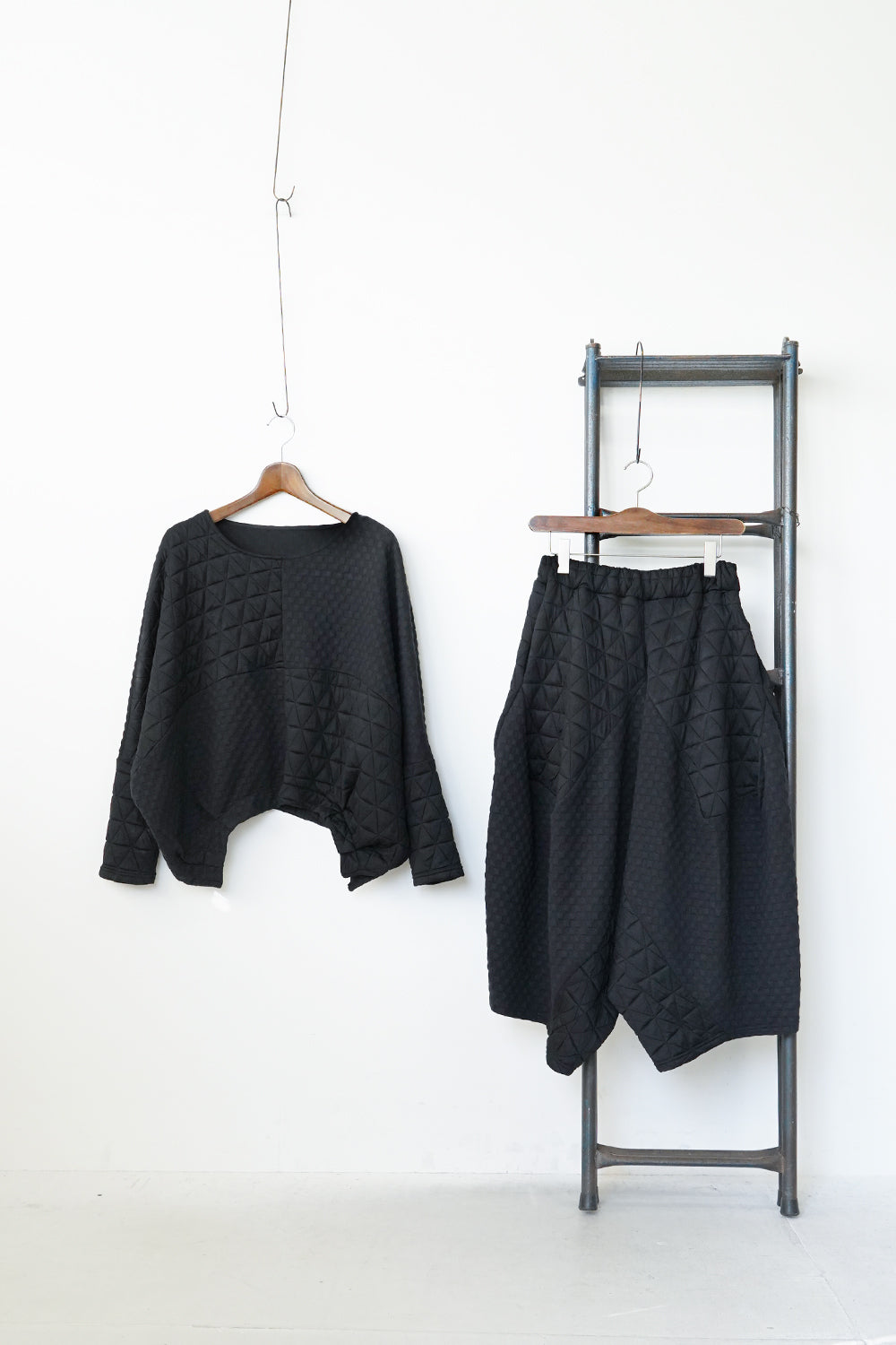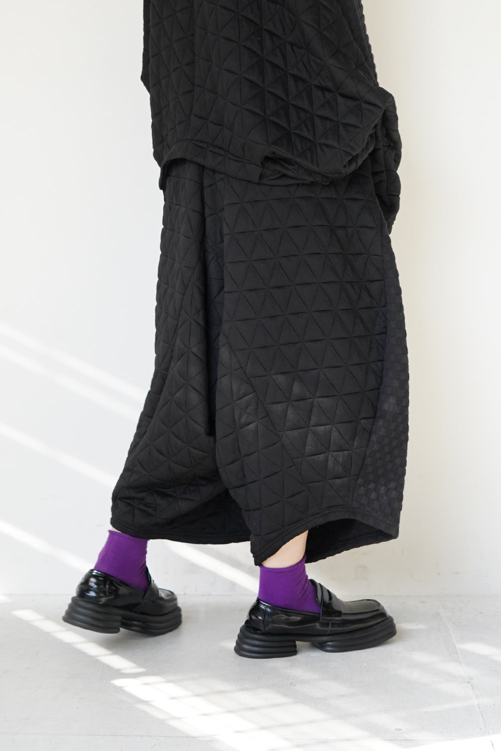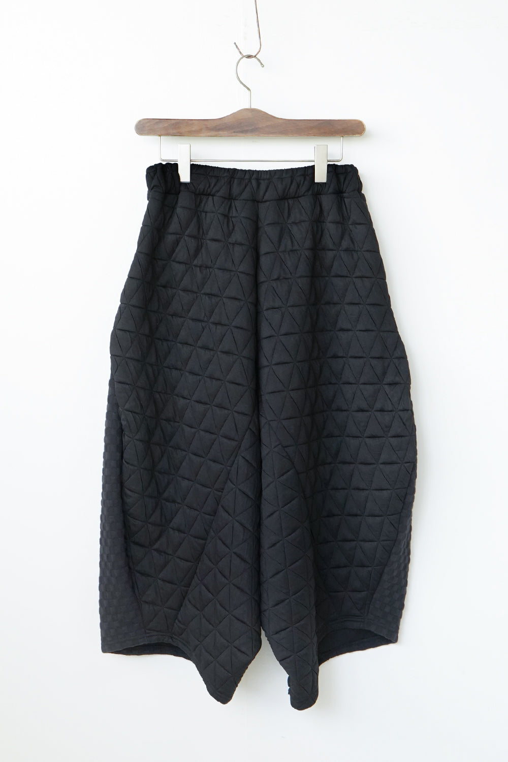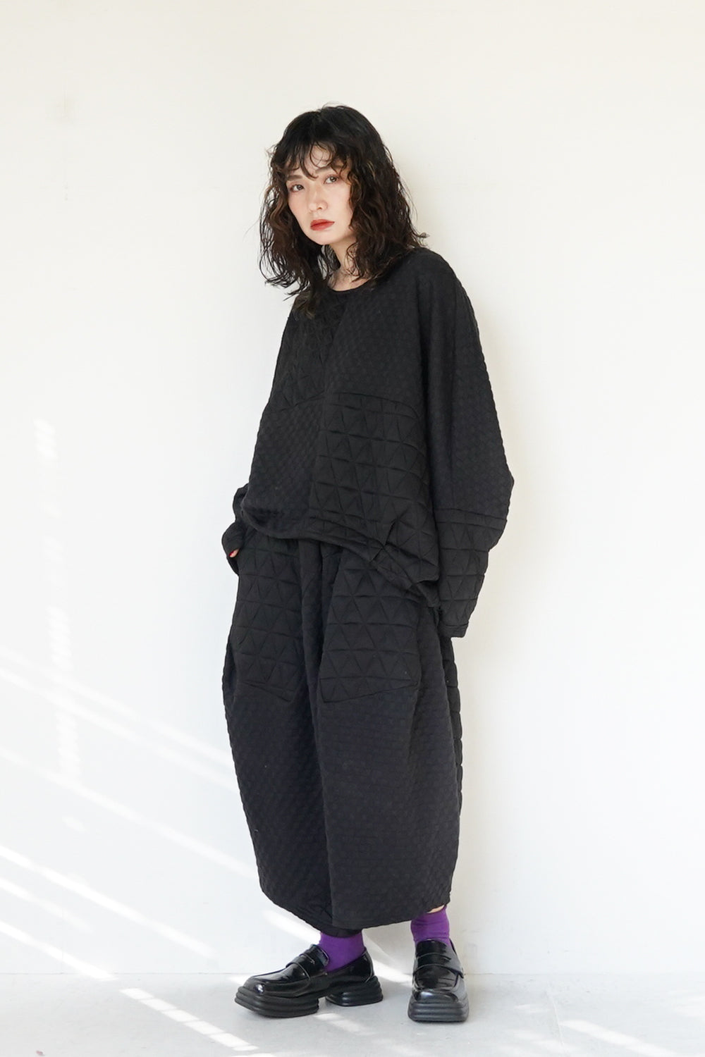 暖かみのあるキルティング素材が冬らしいサルエルパンツ。たっぷり分量感のあるサイズ感は体のラインを拾わない安心感のあるシルエット。リラックス感のある素材感とモードな雰囲気が漂う1枚。同生地のプルオーバーとのセットアップもおすすめです。