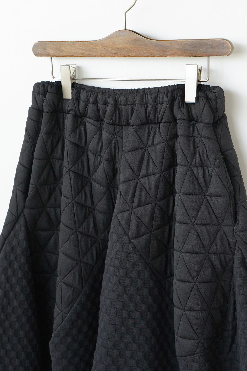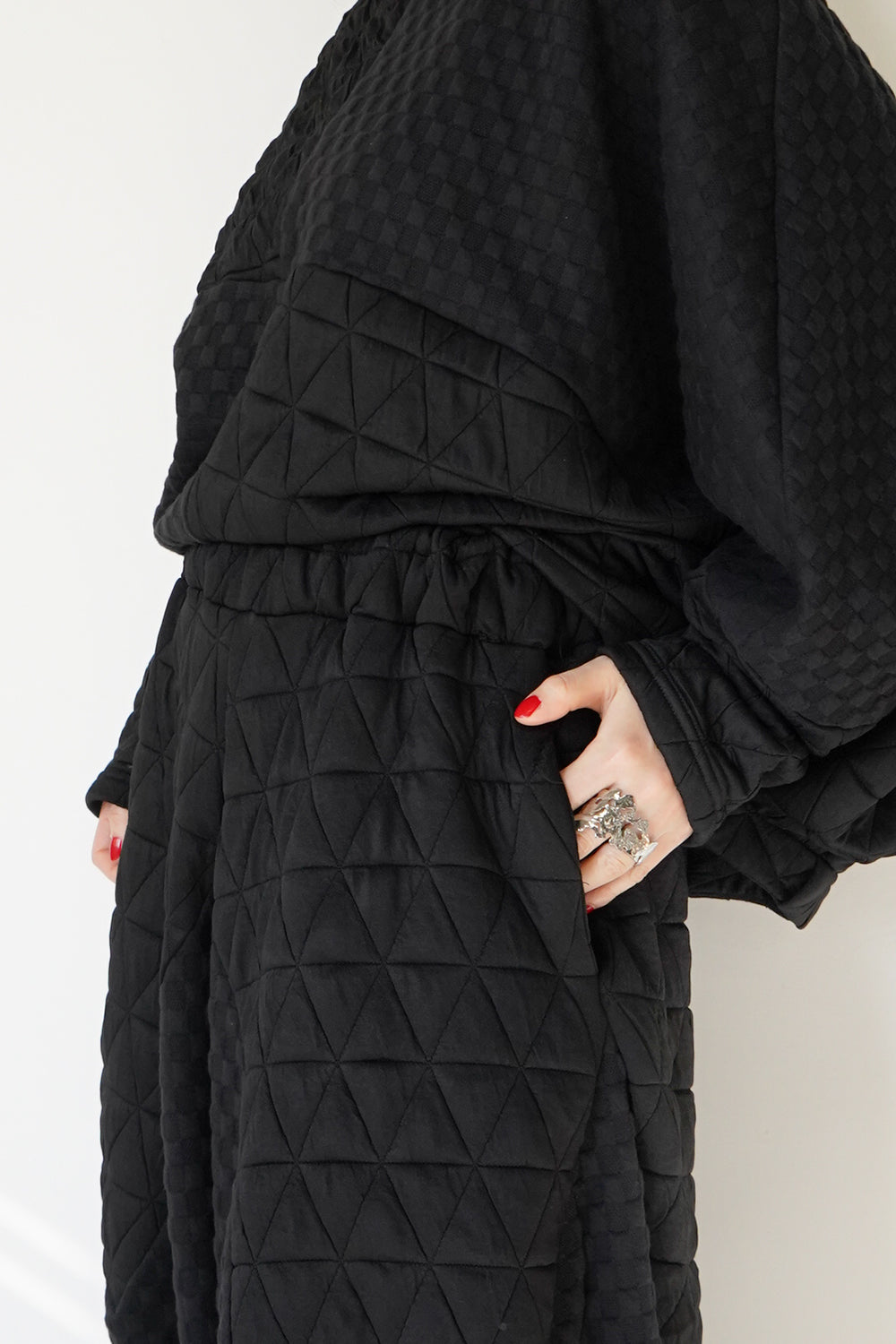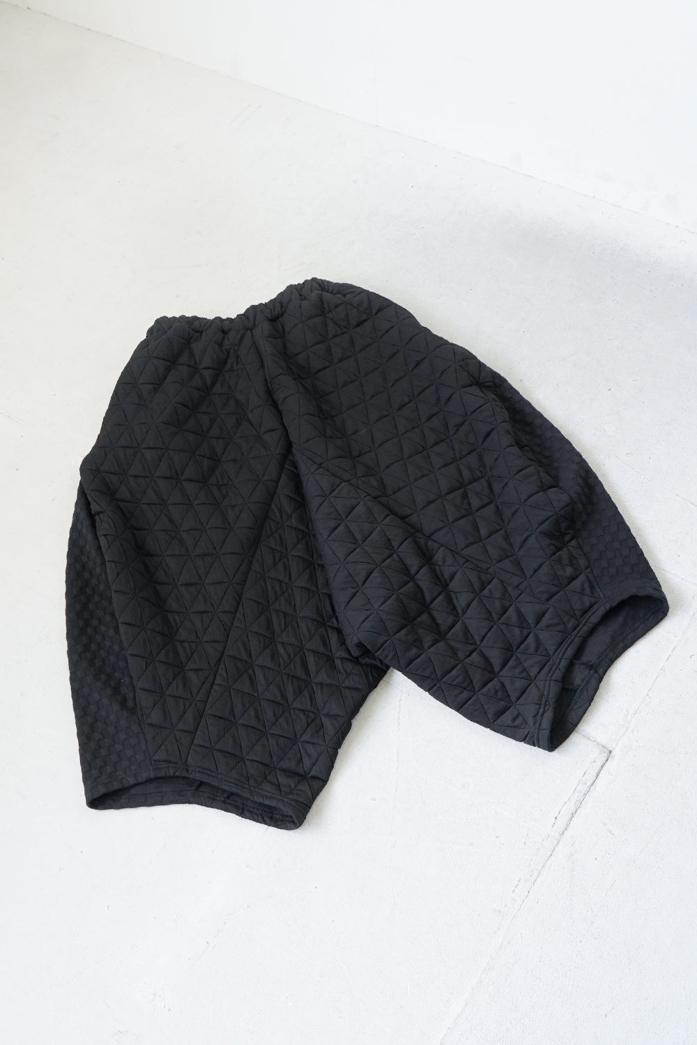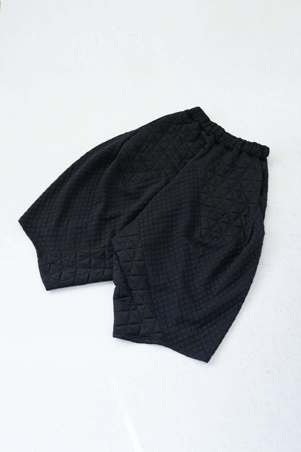 暖かみのあるキルティング素材が冬らしいサルエルパンツ。たっぷり分量感のあるサイズ感は体のラインを拾わない安心感のあるシルエット。リラックス感のある素材感とモードな雰囲気が漂う1枚。同生地のプルオーバーとのセットアップもおすすめです。