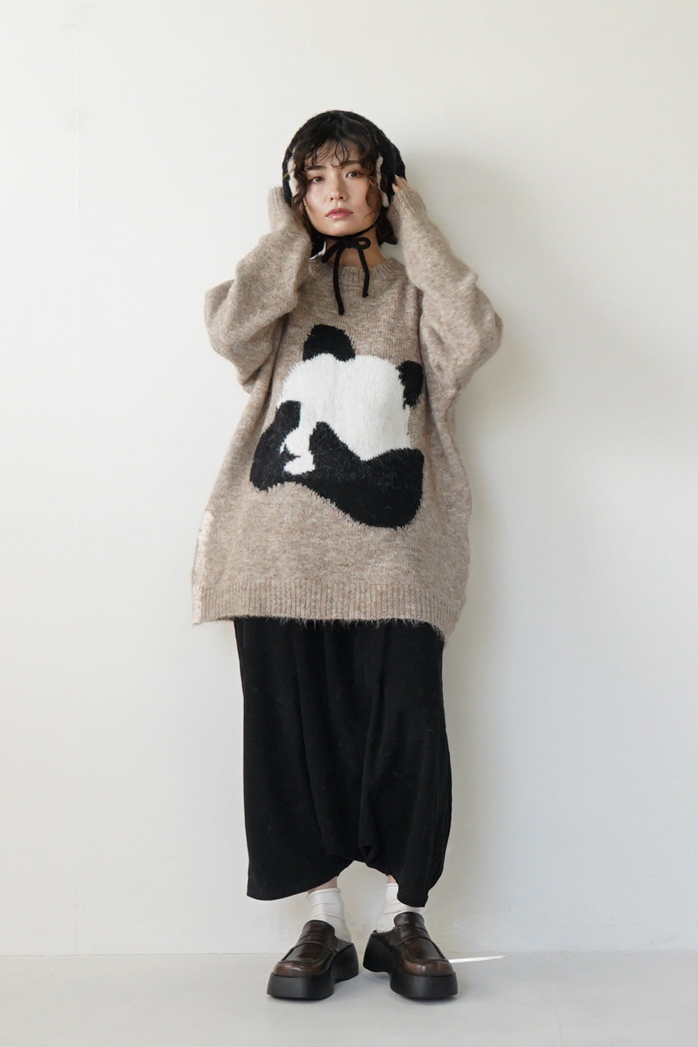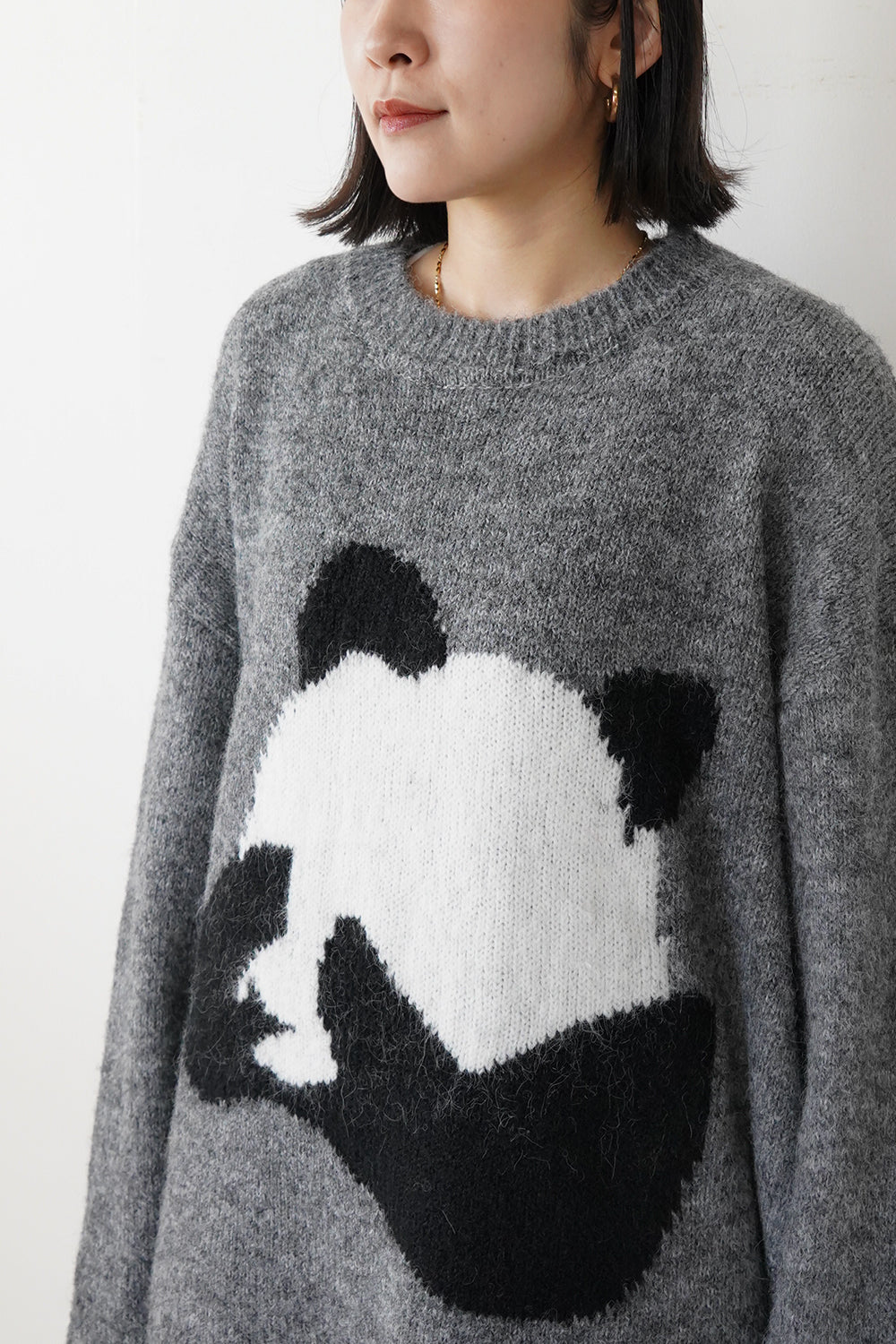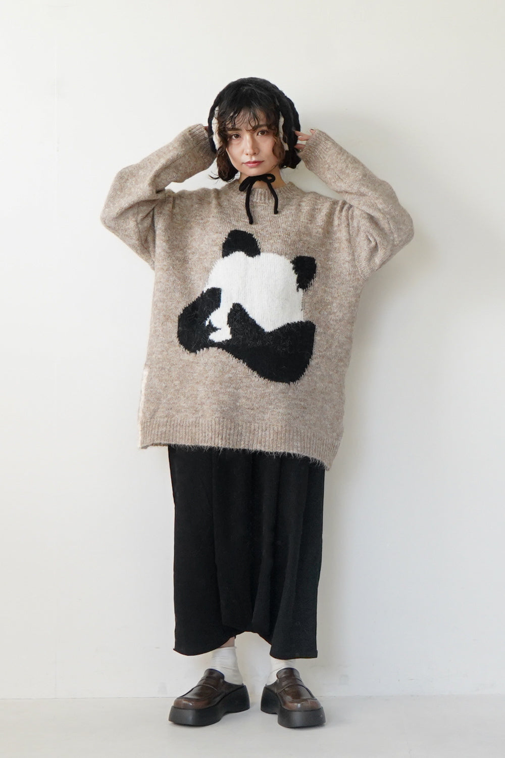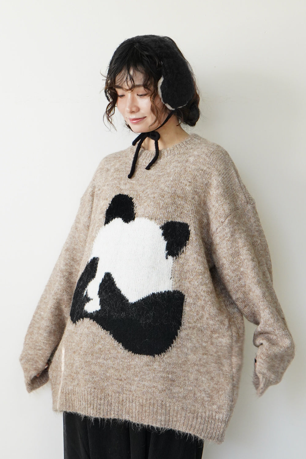 キャッチーなパンダモチーフがスタイリングの主役になるニット。毛足の長めな柔らかく暖かい素材感で、ハイネックインナーやシャツをレイヤードしても余裕のあるサイズ感。気の抜けたデザインがルーズなシルエットにピッタリのアイテム。デニムなどでカジュアルにもスカートで外したスタイリングにも◎