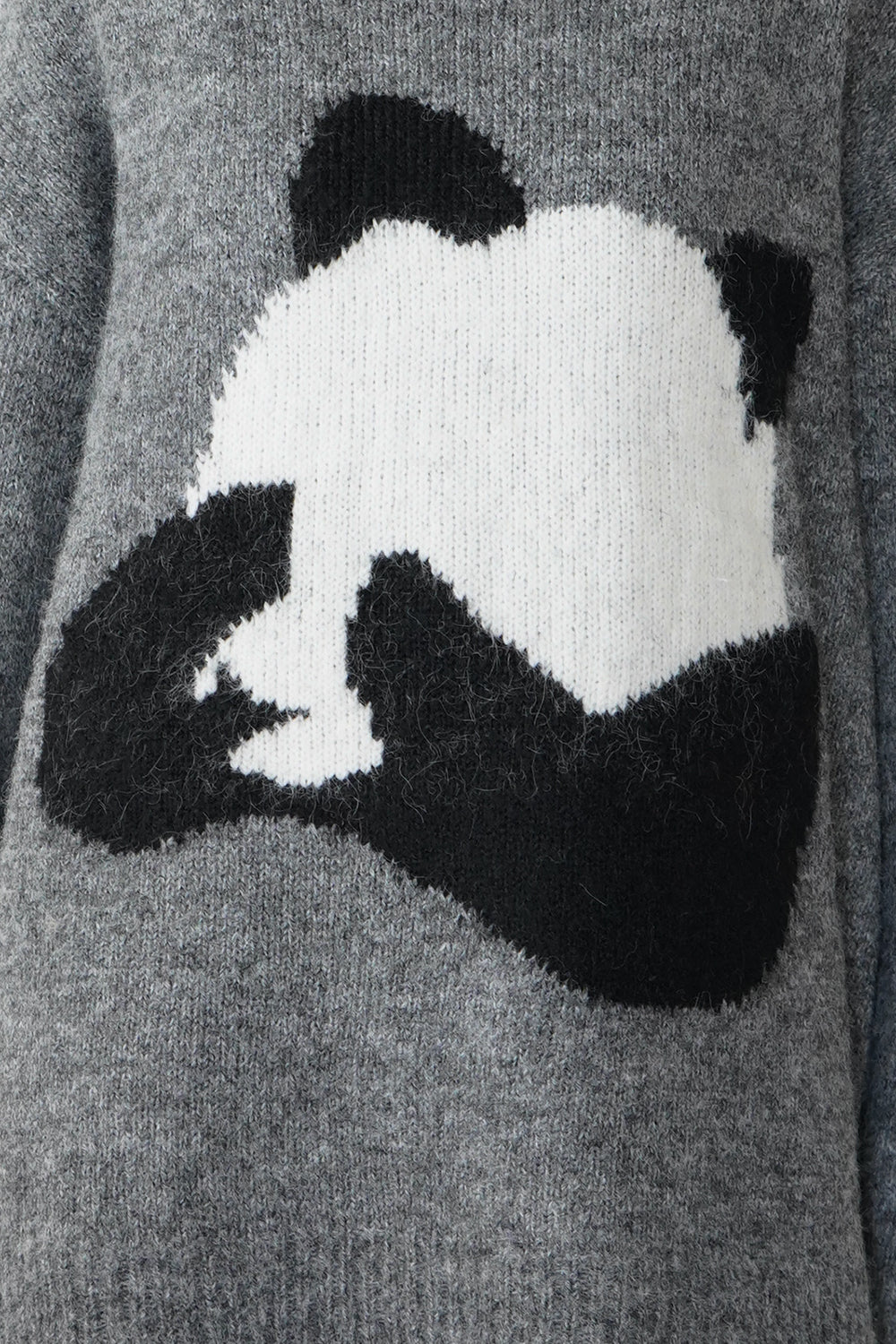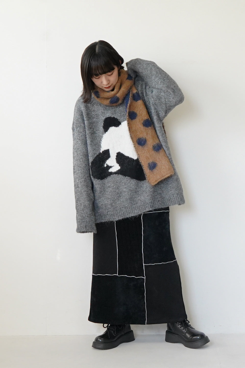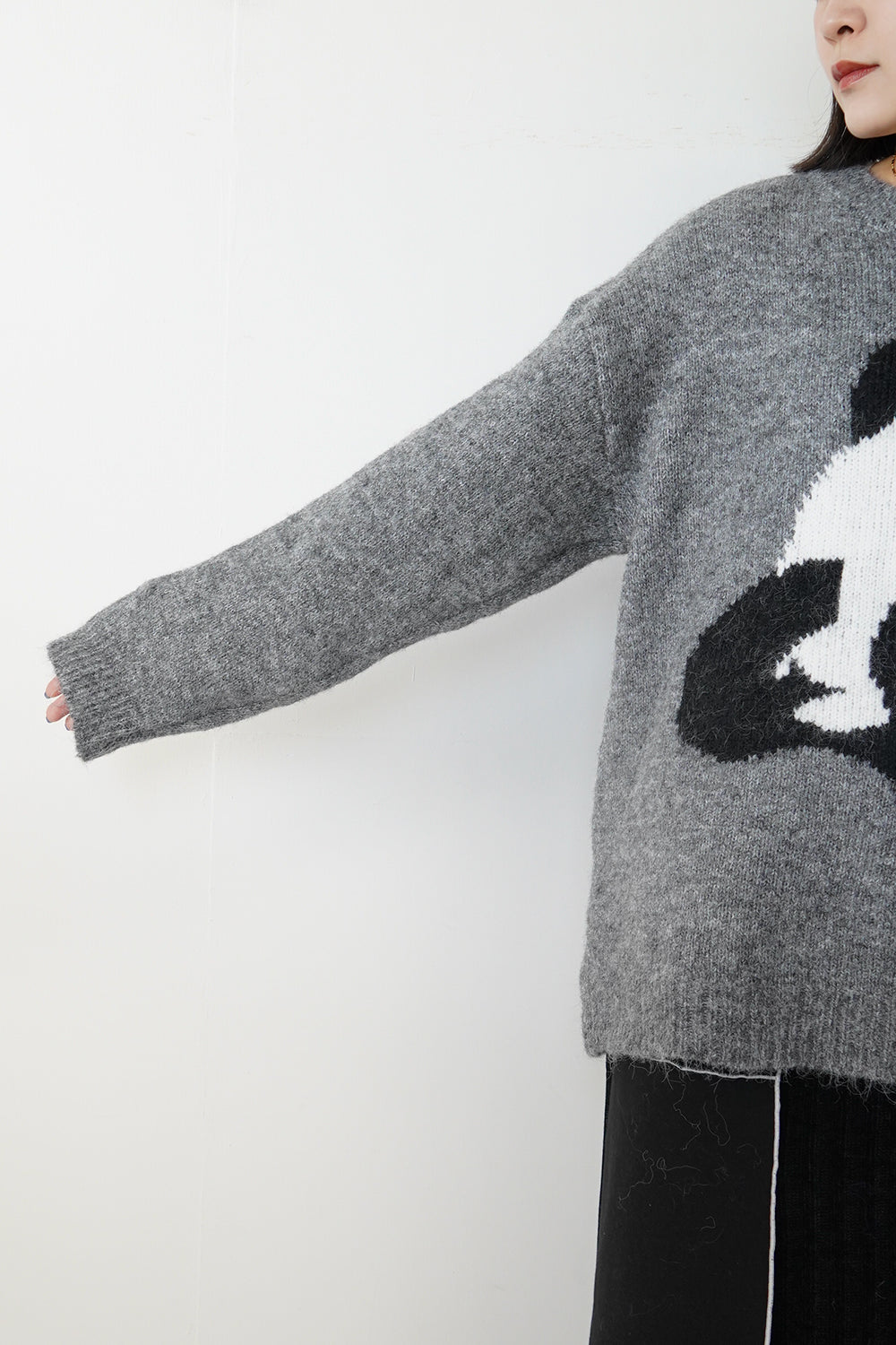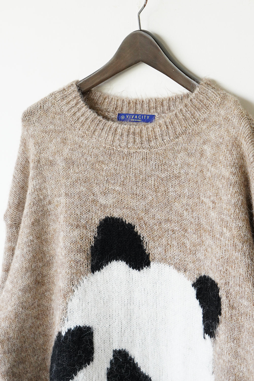 キャッチーなパンダモチーフがスタイリングの主役になるニット。毛足の長めな柔らかく暖かい素材感で、ハイネックインナーやシャツをレイヤードしても余裕のあるサイズ感。気の抜けたデザインがルーズなシルエットにピッタリのアイテム。デニムなどでカジュアルにもスカートで外したスタイリングにも◎