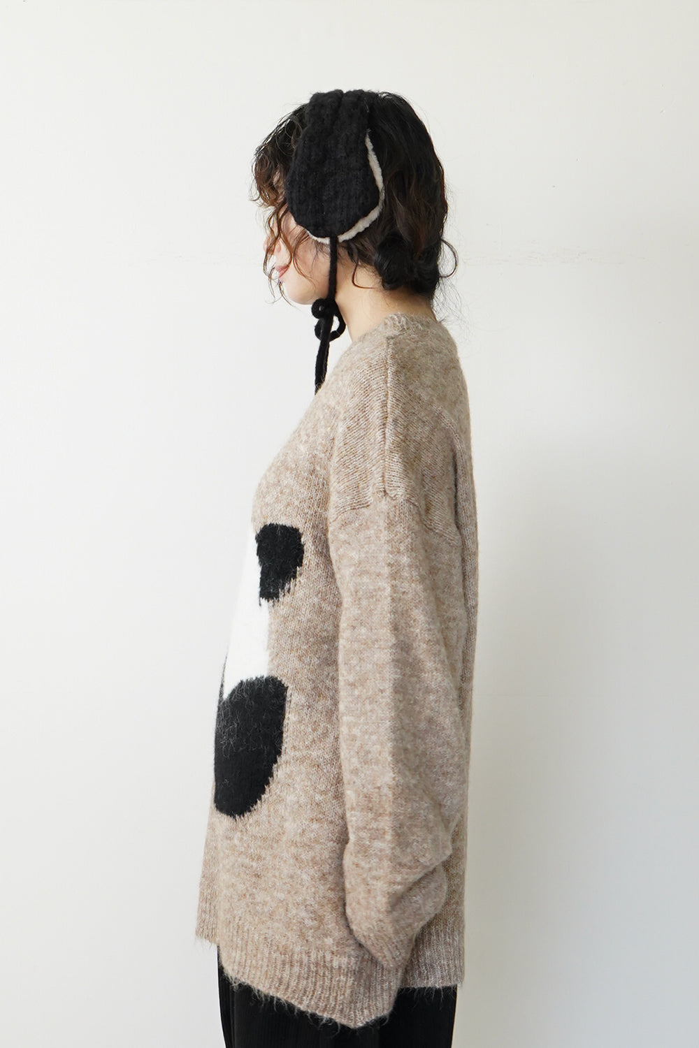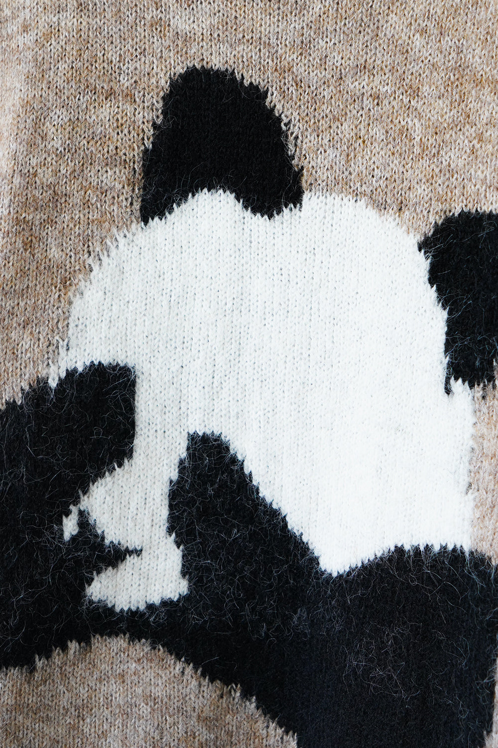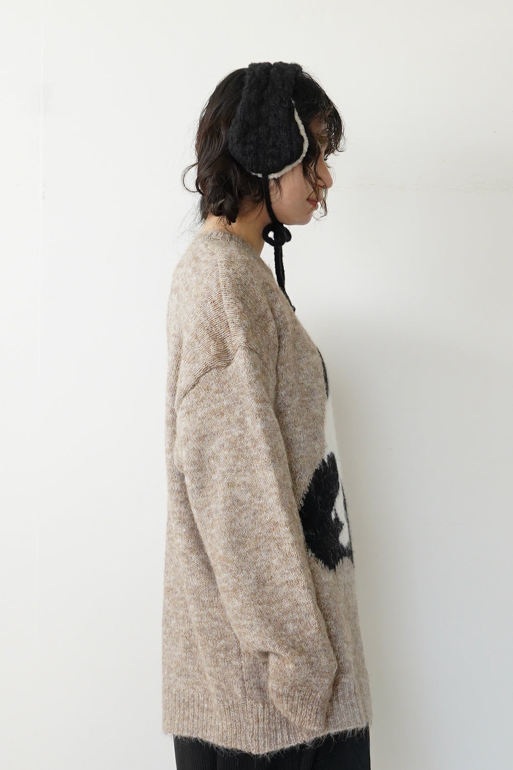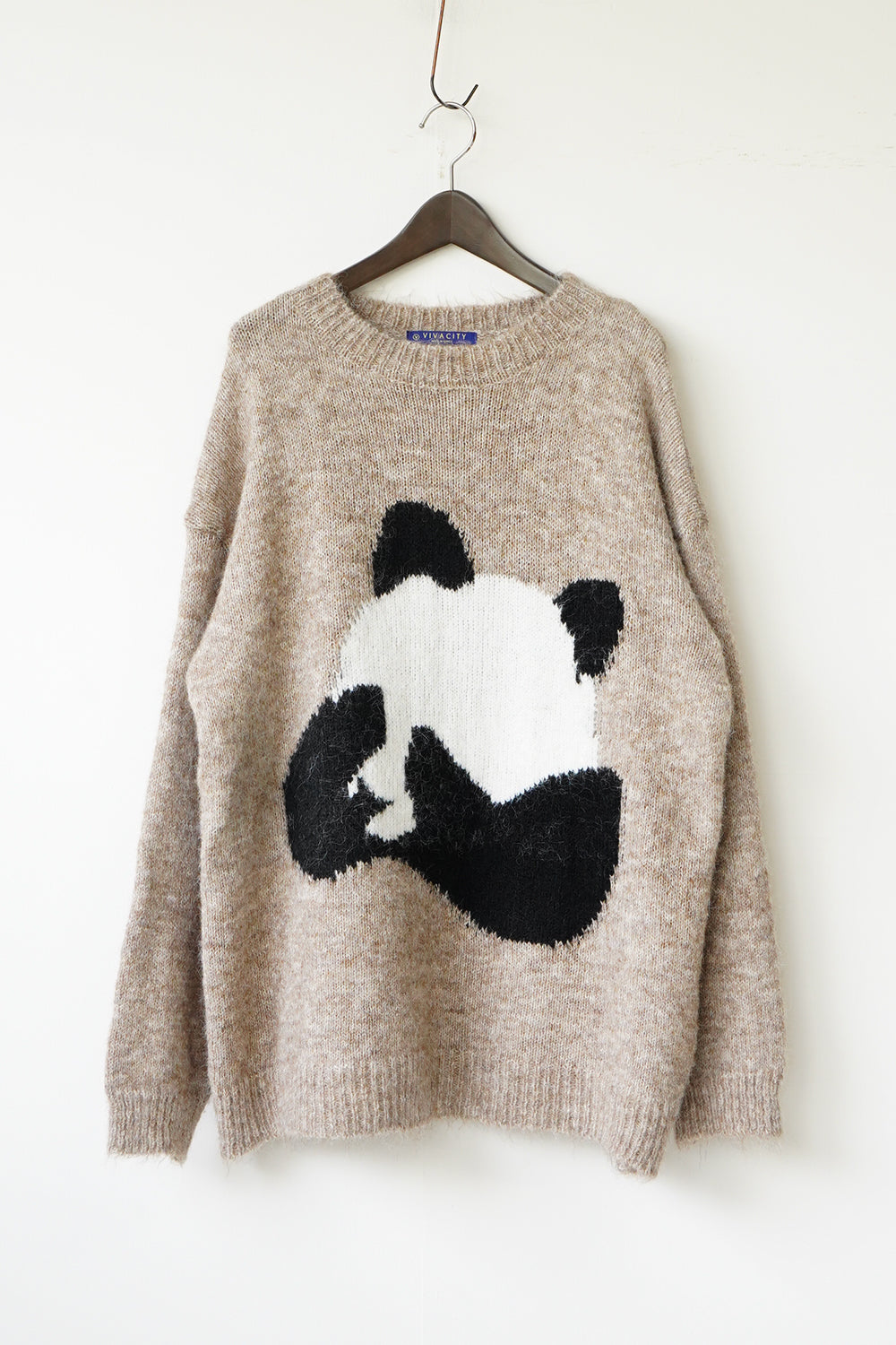 キャッチーなパンダモチーフがスタイリングの主役になるニット。毛足の長めな柔らかく暖かい素材感で、ハイネックインナーやシャツをレイヤードしても余裕のあるサイズ感。気の抜けたデザインがルーズなシルエットにピッタリのアイテム。デニムなどでカジュアルにもスカートで外したスタイリングにも◎