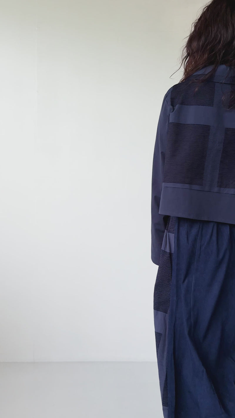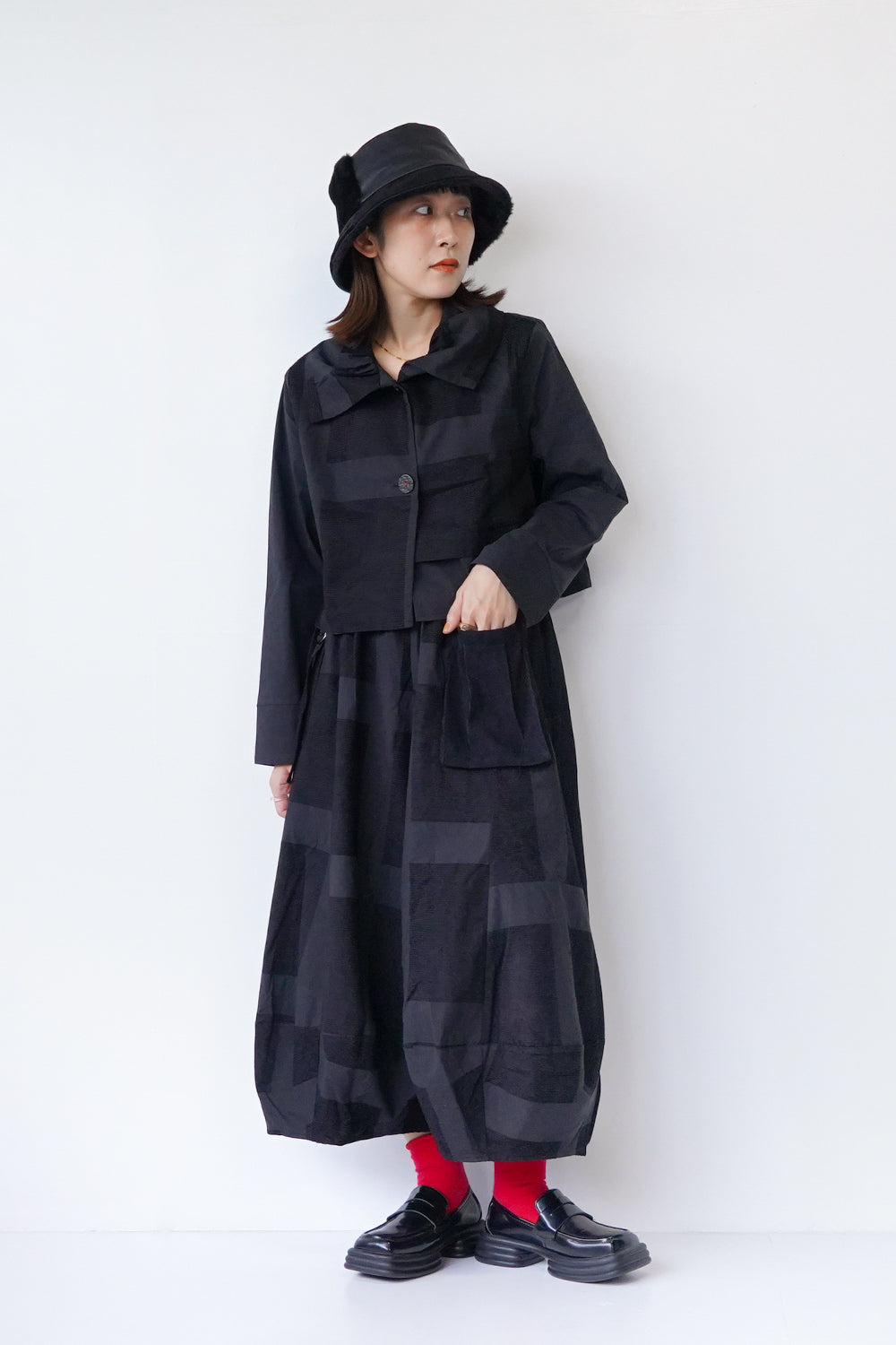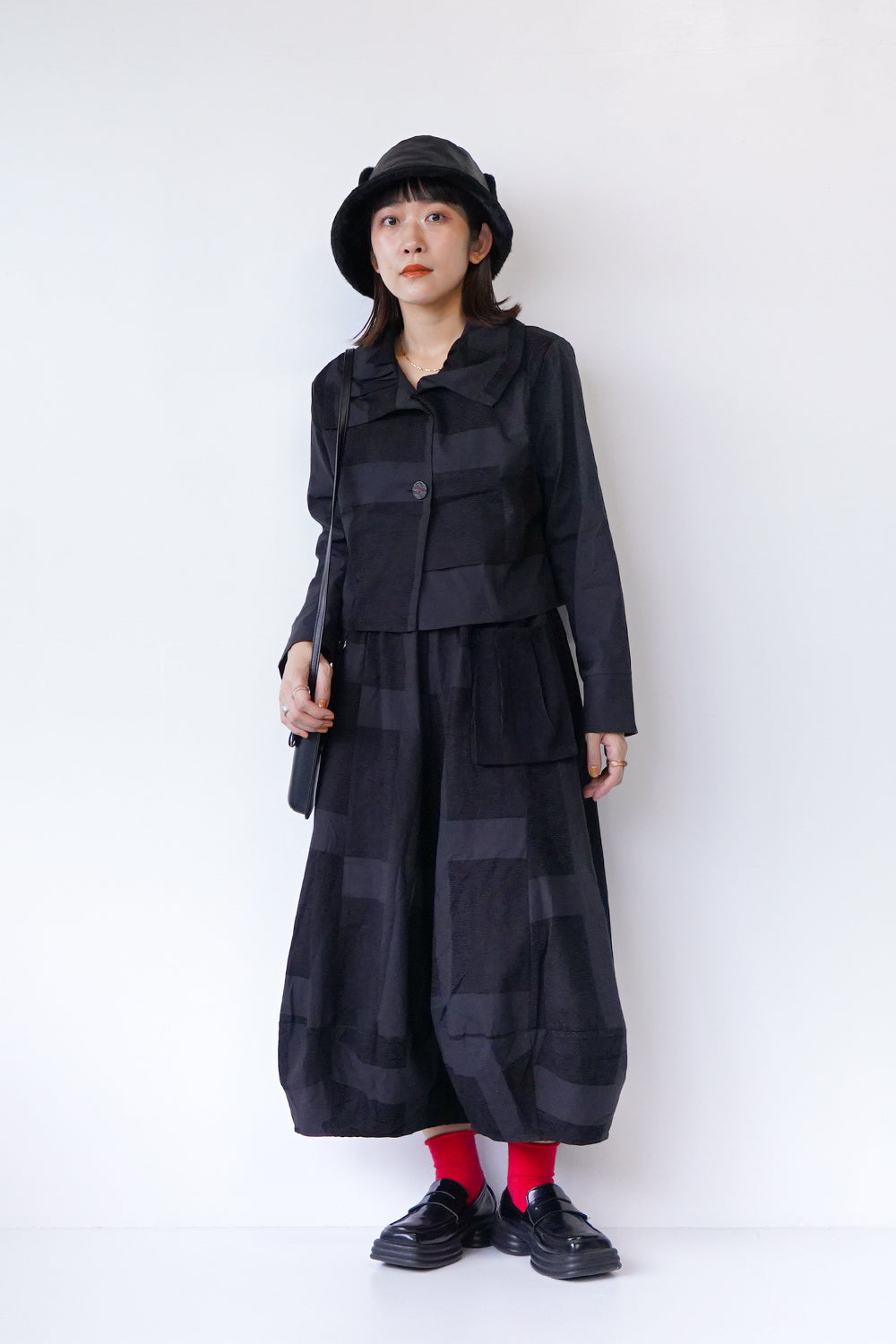 大きな格子柄がモードな印象のショートジャケット。珍しい立体的な襟元がポイント。コンパクトなショート丈に長めの袖丈がバランスよくボリュームボトムと合わせるとスタイルアップに◎裏地なしの薄手の素材なので長いシーズン楽しめる1枚です。ぼたんの赤いステッチ糸もさりげないポイント。