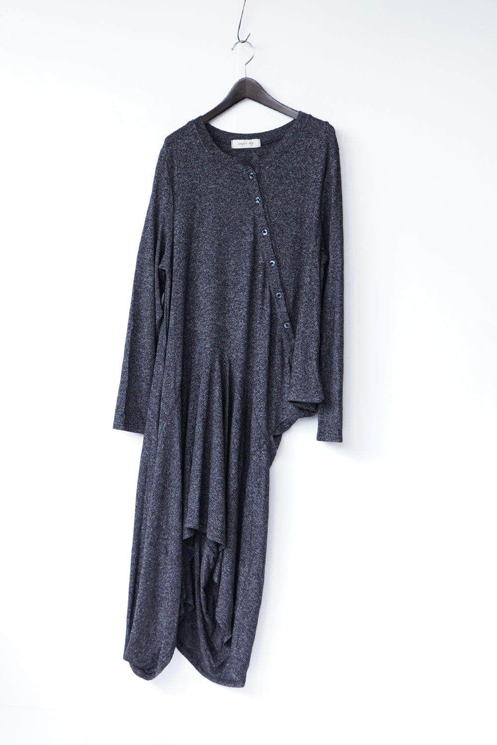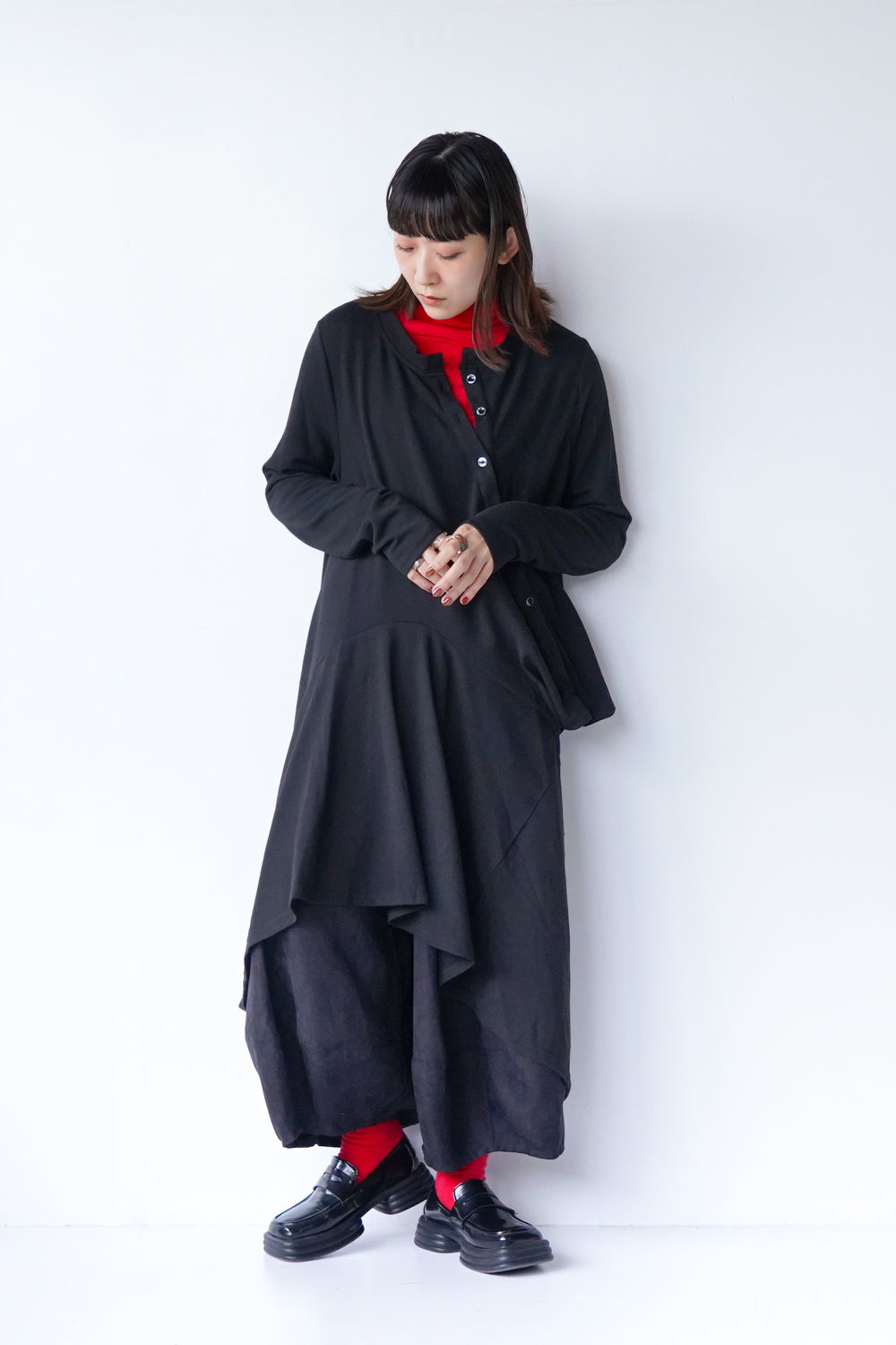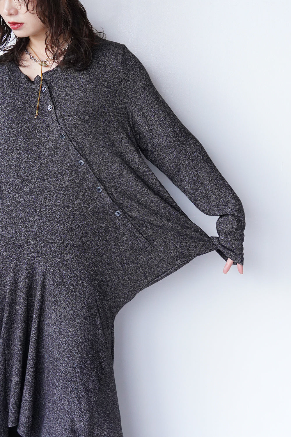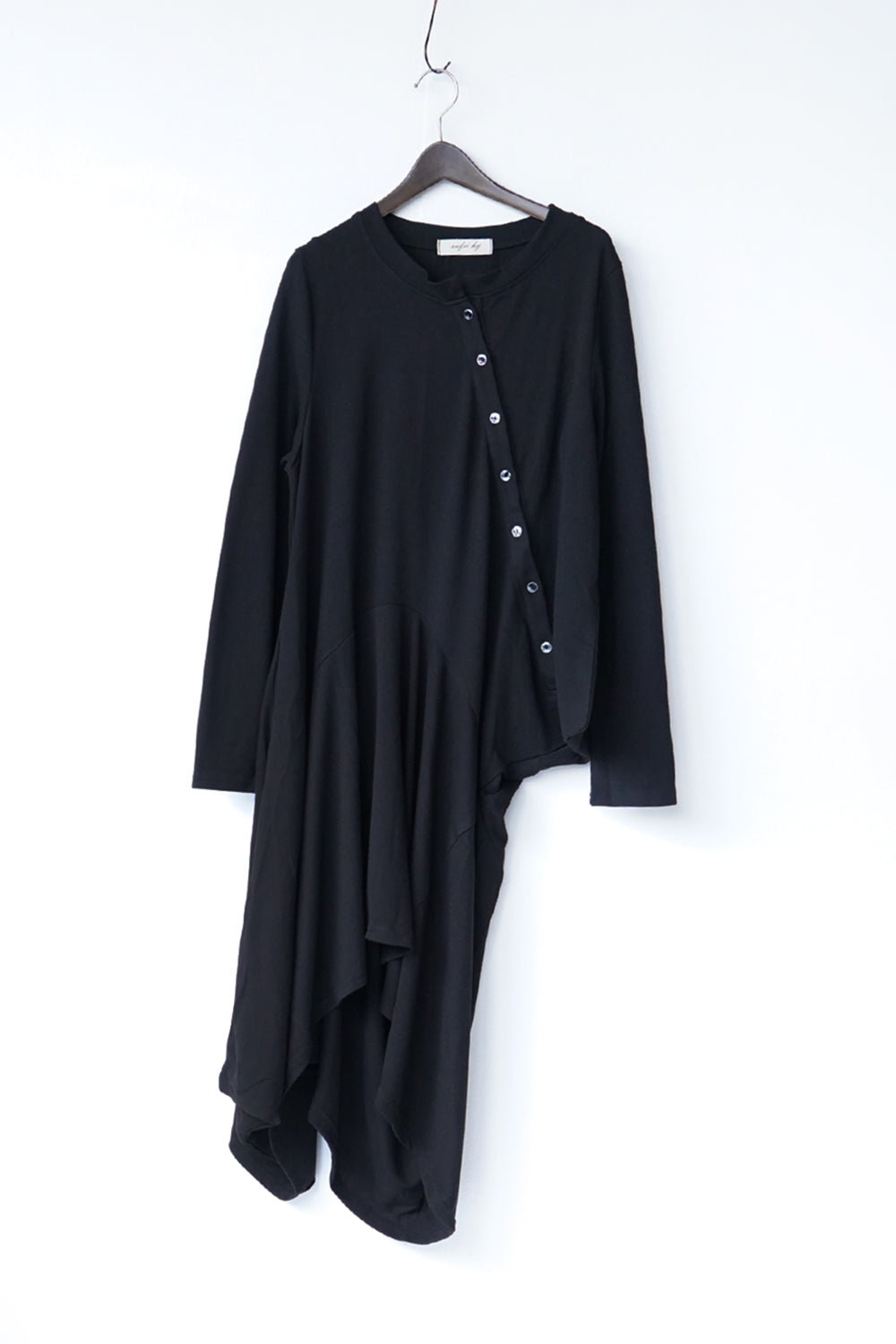 アンバランスなデザインが個性豊かな変形ワンピース。伸縮性のある柔らかい質感のニットソー生地。滑らかで落ち感がありきれいなドレープ感が出るので女性らしいシルエットがお好きな方におすすめ。フロントは短くサイドは長めの丈なので小柄な方は1枚で、長身の方はボトムス合わせでコーデを楽しめます。特徴的な形なので色展開はベーシックカラーの使いやすい2色。