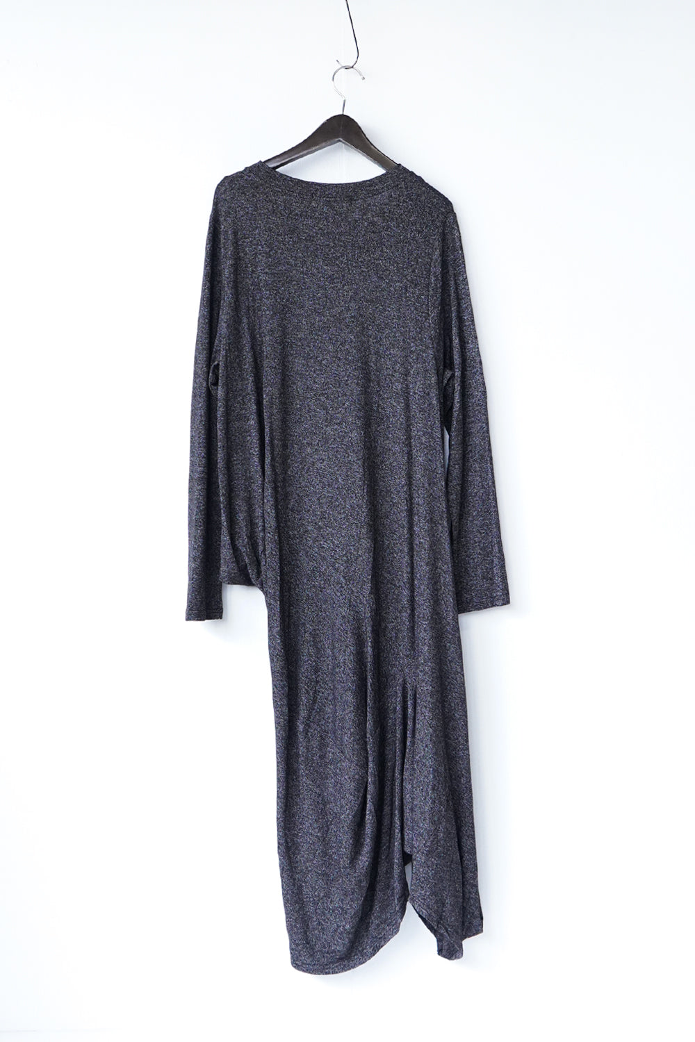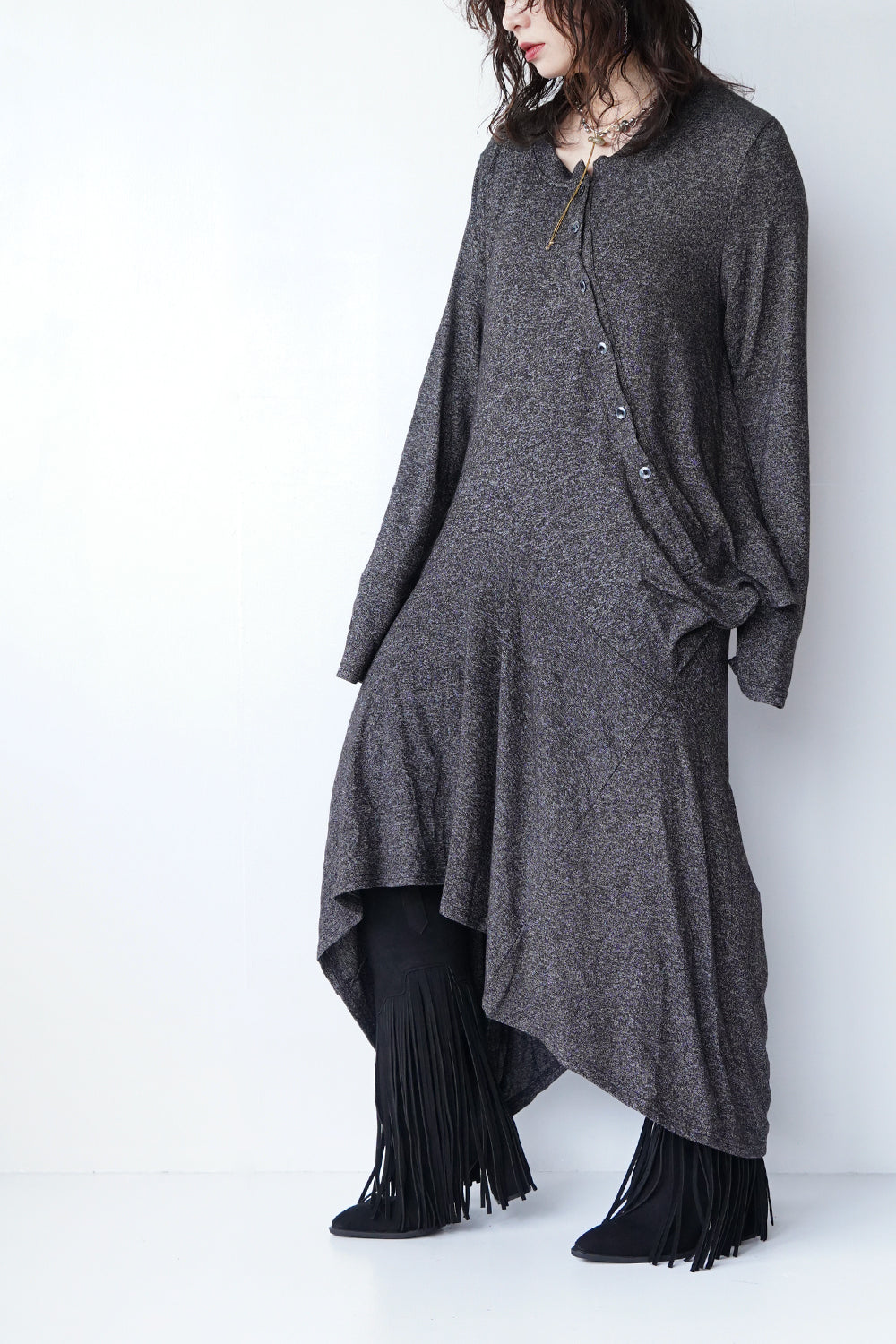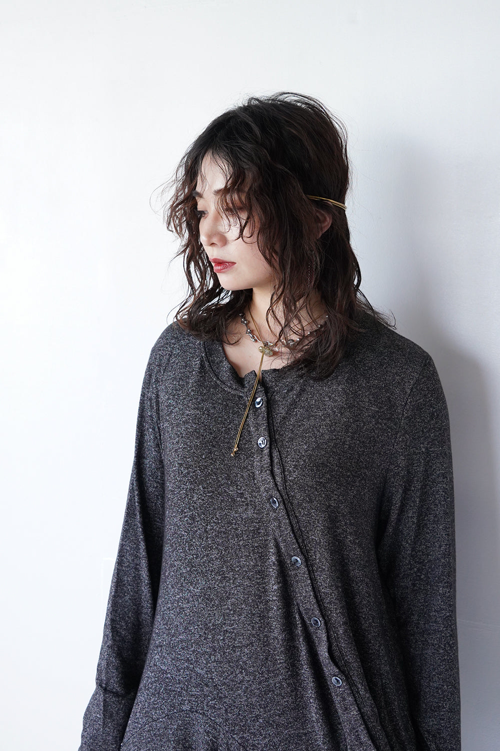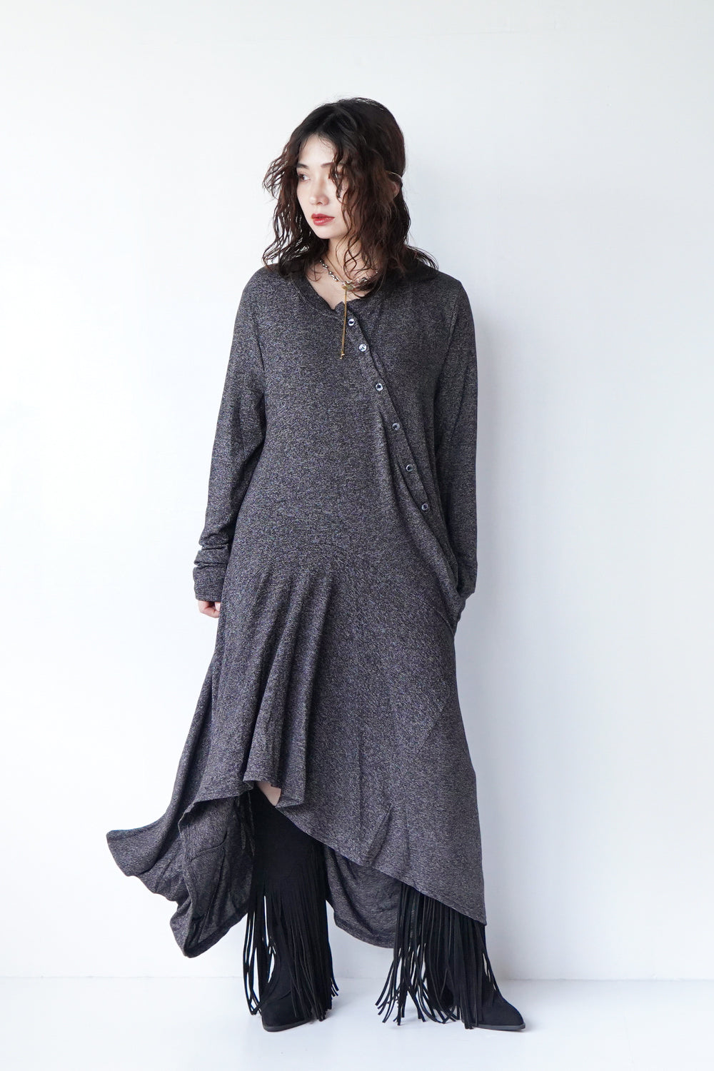アンバランスなデザインが個性豊かな変形ワンピース。伸縮性のある柔らかい質感のニットソー生地。滑らかで落ち感がありきれいなドレープ感が出るので女性らしいシルエットがお好きな方におすすめ。フロントは短くサイドは長めの丈なので小柄な方は1枚で、長身の方はボトムス合わせでコーデを楽しめます。特徴的な形なので色展開はベーシックカラーの使いやすい2色。