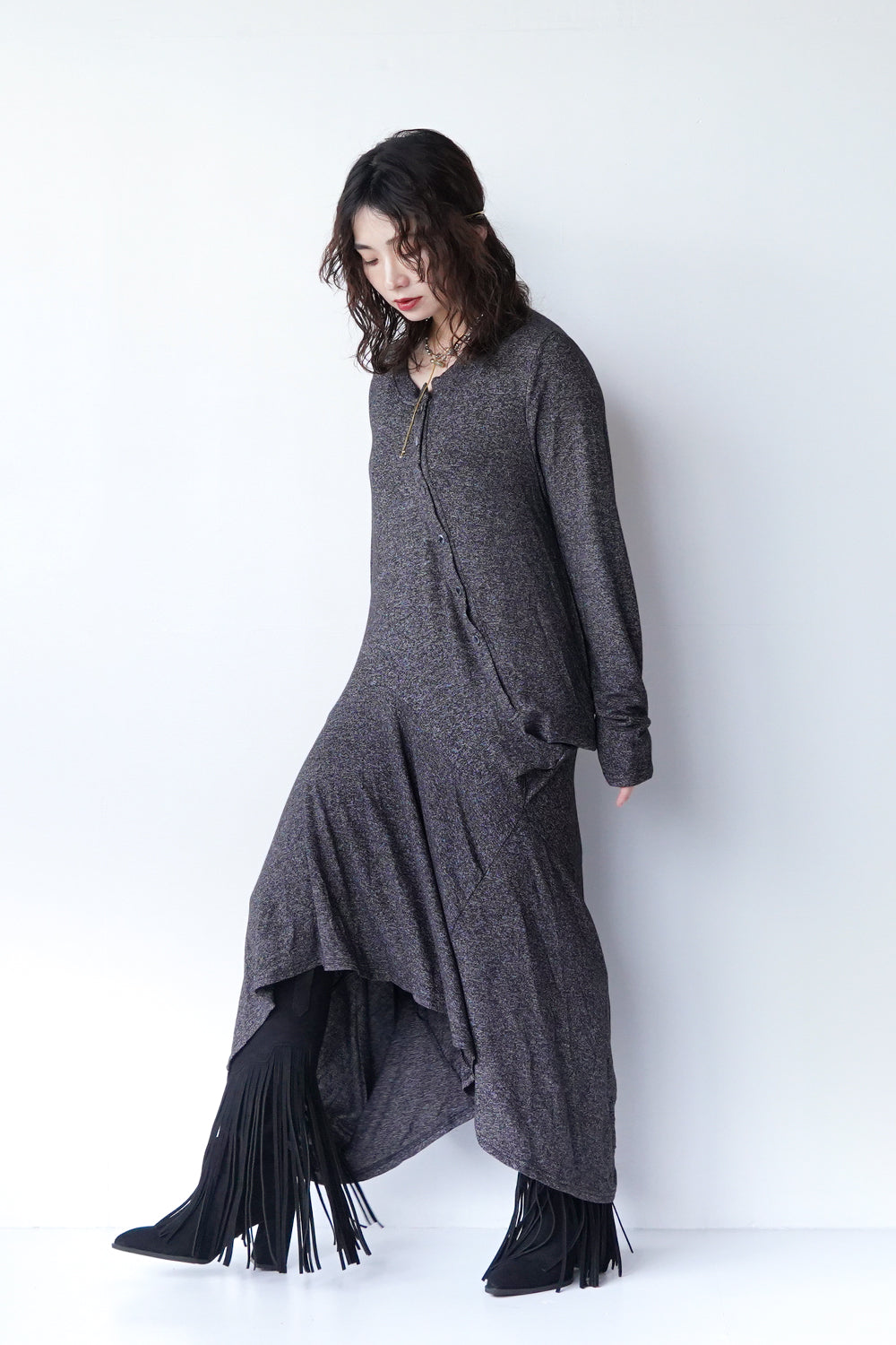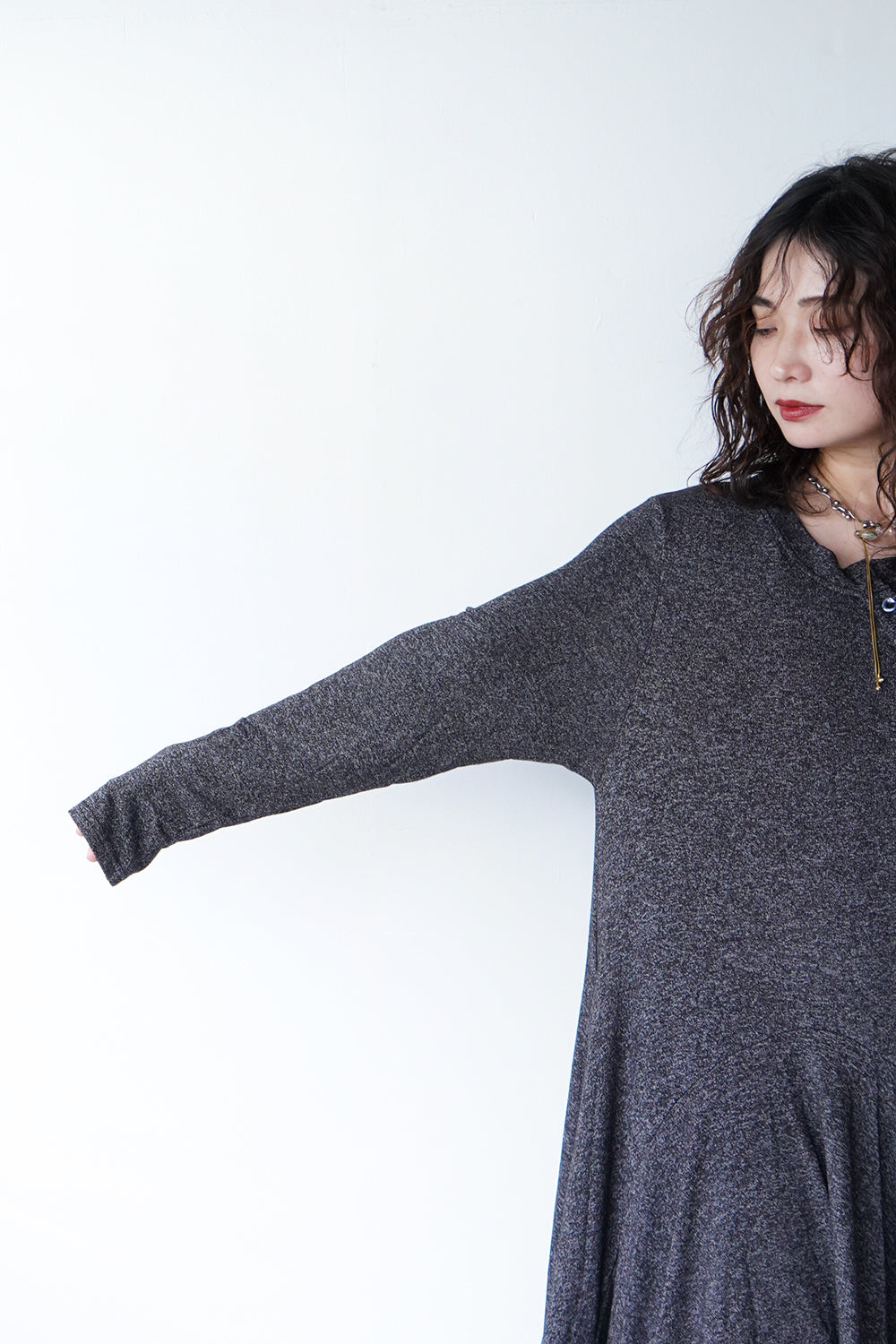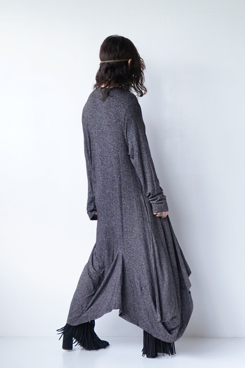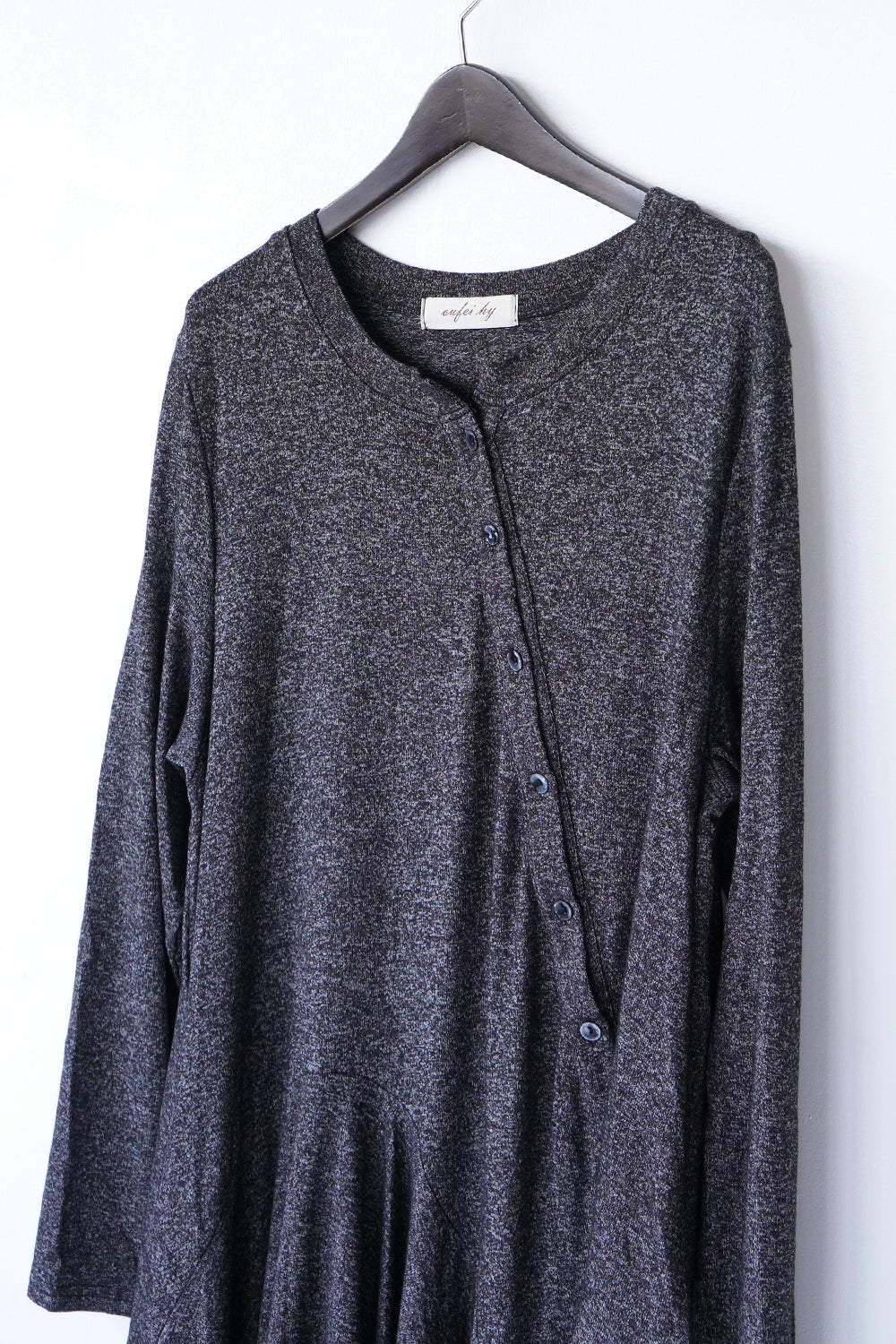 アンバランスなデザインが個性豊かな変形ワンピース。伸縮性のある柔らかい質感のニットソー生地。滑らかで落ち感がありきれいなドレープ感が出るので女性らしいシルエットがお好きな方におすすめ。フロントは短くサイドは長めの丈なので小柄な方は1枚で、長身の方はボトムス合わせでコーデを楽しめます。特徴的な形なので色展開はベーシックカラーの使いやすい2色。