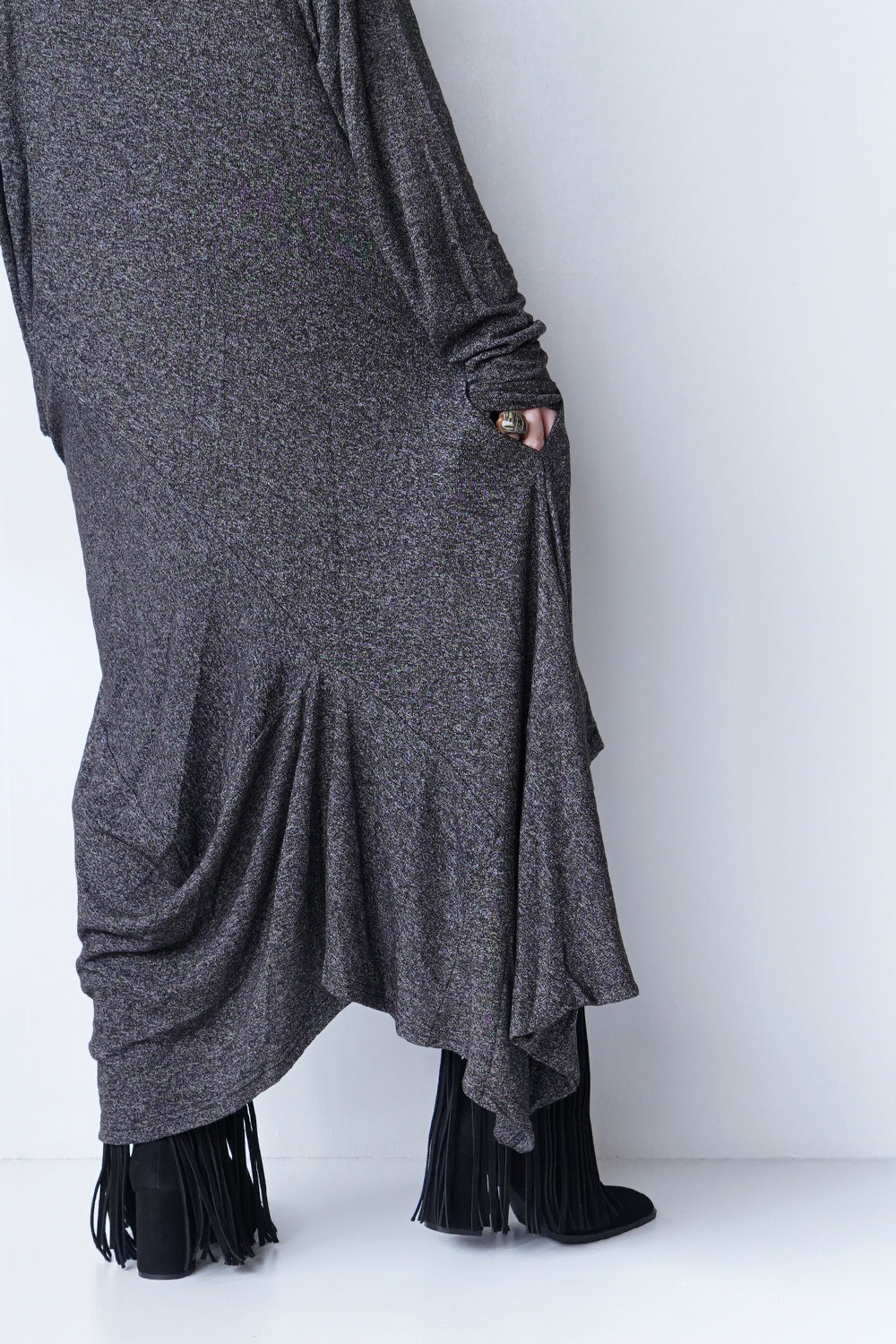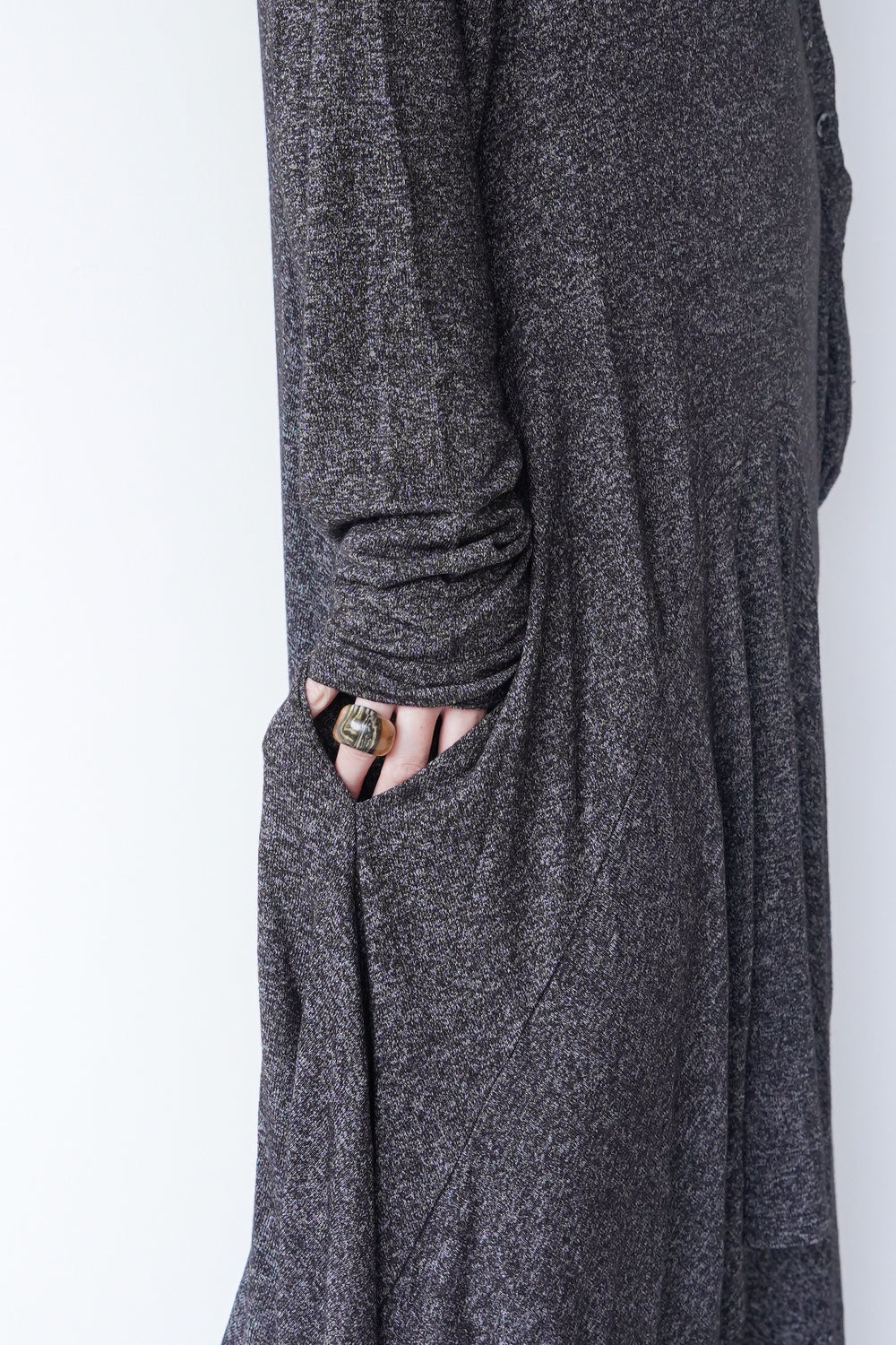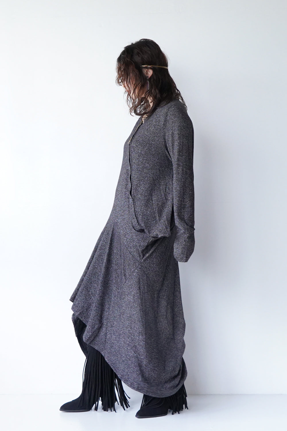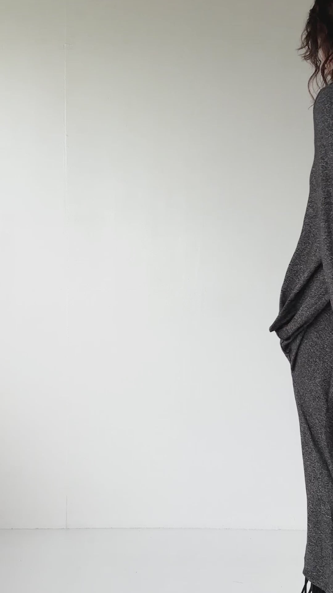 アンバランスなデザインが個性豊かな変形ワンピース。伸縮性のある柔らかい質感のニットソー生地。滑らかで落ち感がありきれいなドレープ感が出るので女性らしいシルエットがお好きな方におすすめ。フロントは短くサイドは長めの丈なので小柄な方は1枚で、長身の方はボトムス合わせでコーデを楽しめます。特徴的な形なので色展開はベーシックカラーの使いやすい2色。