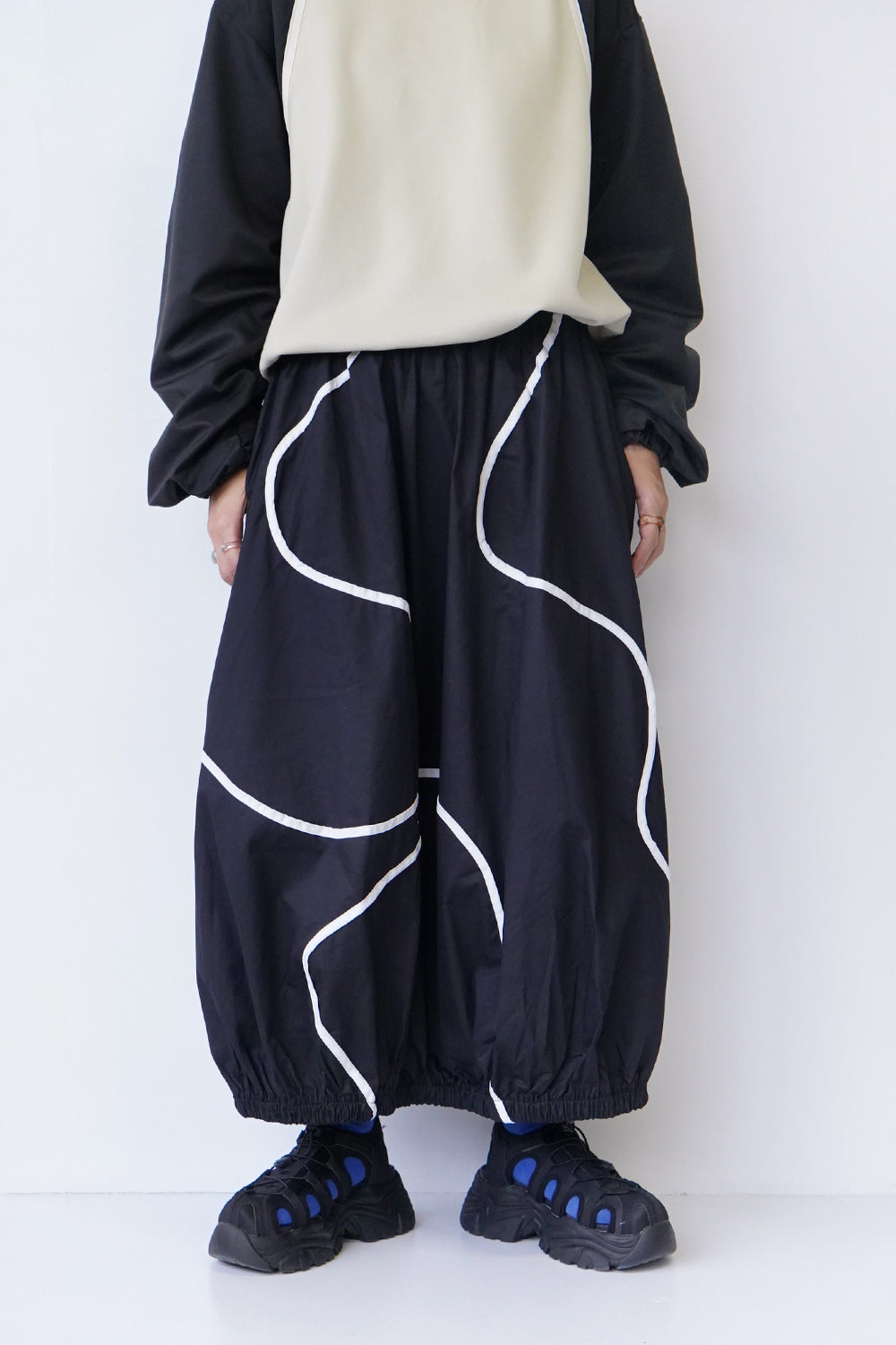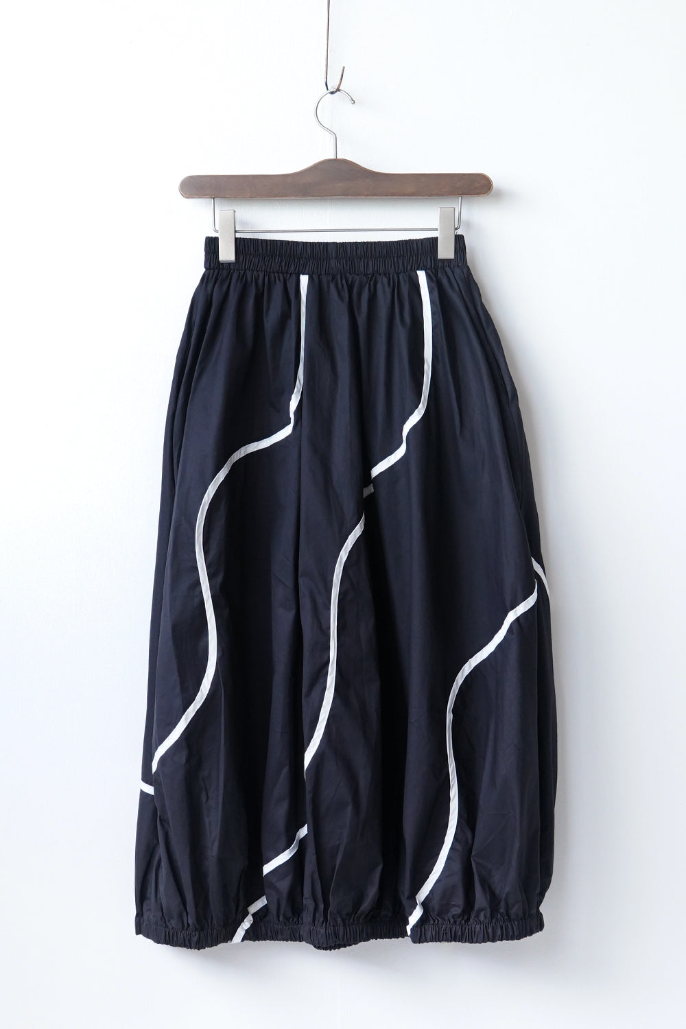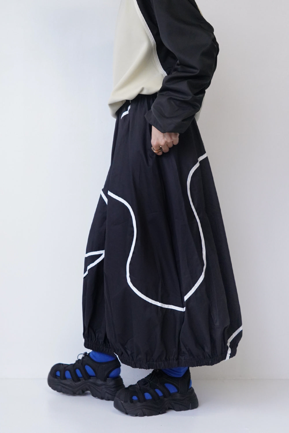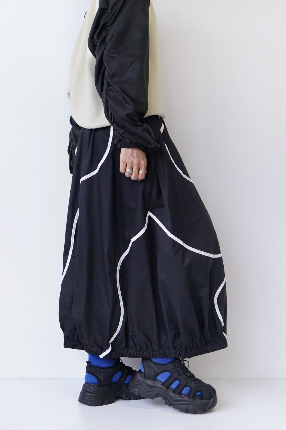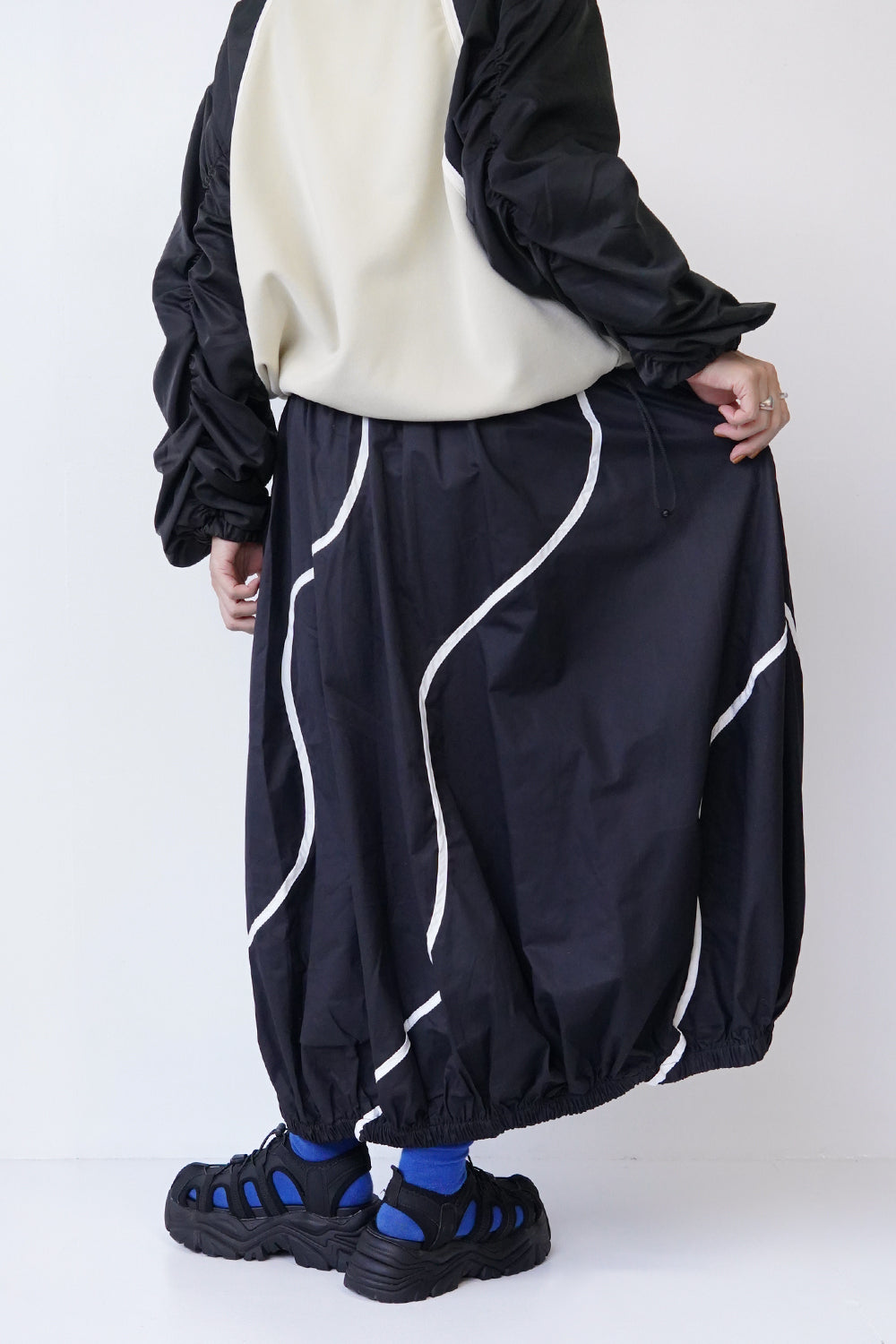 ホワイトラインのパイピングが個性的なバルーンスカート。ウエストはゴム仕様でストレスフリーに着用可能。裾にもしっかりゴムが入っているのでシルエットをキープ。透け感はなく1枚で安心して着用できる素材感なのも嬉しいポイント◎
