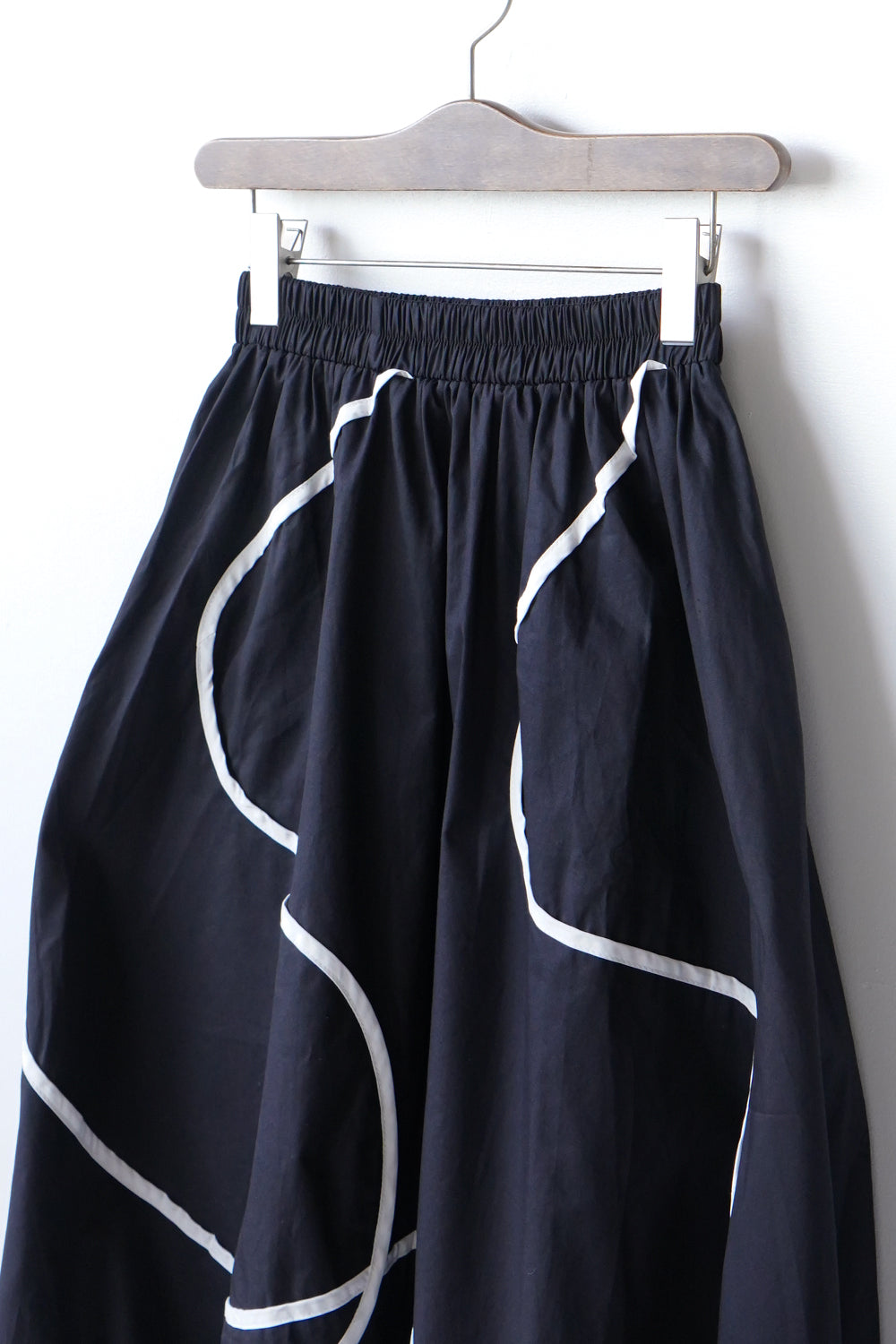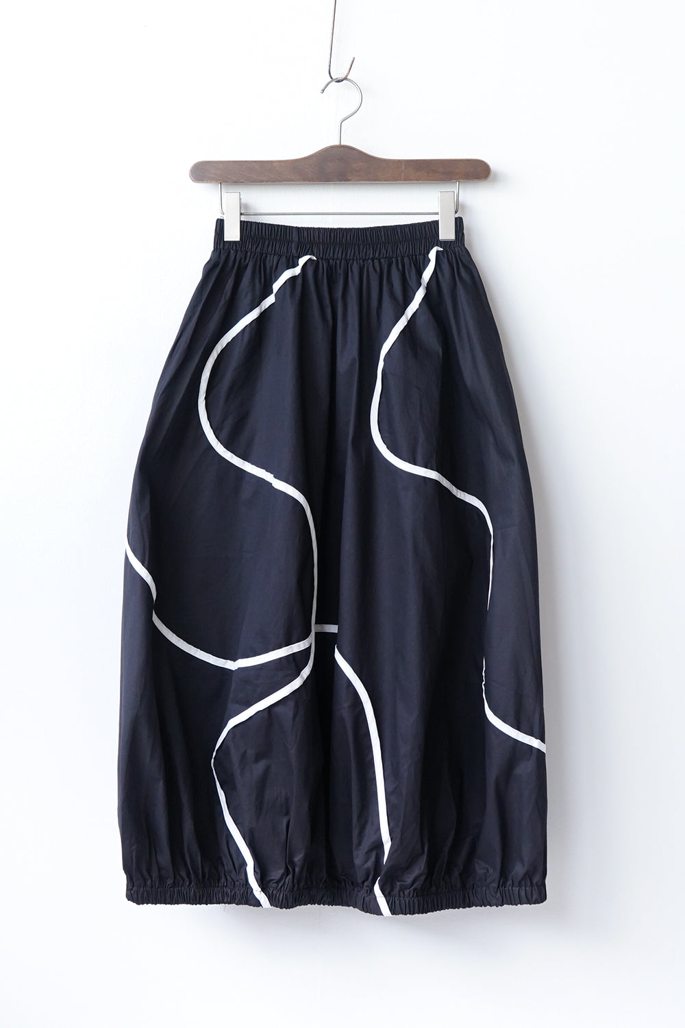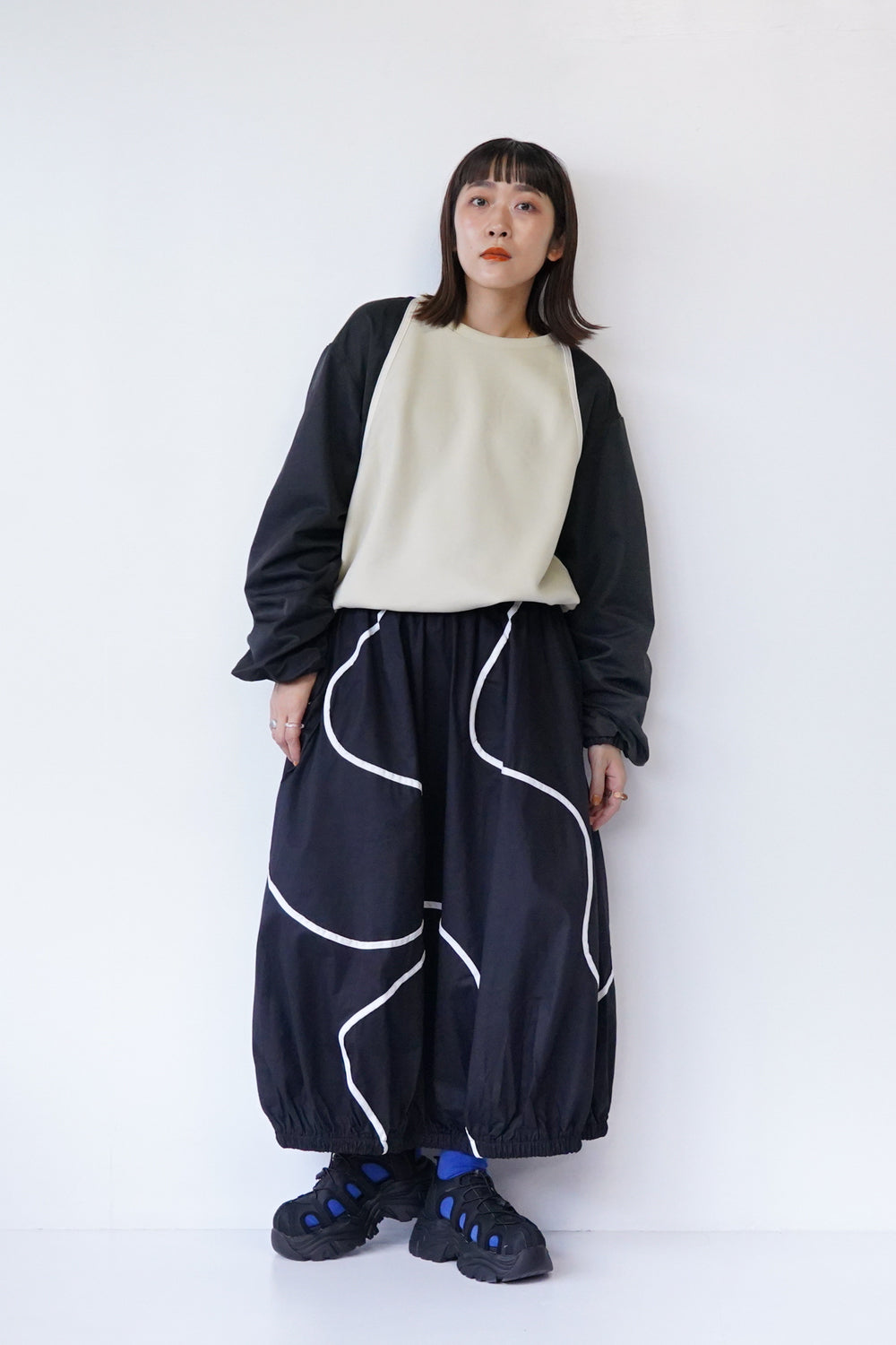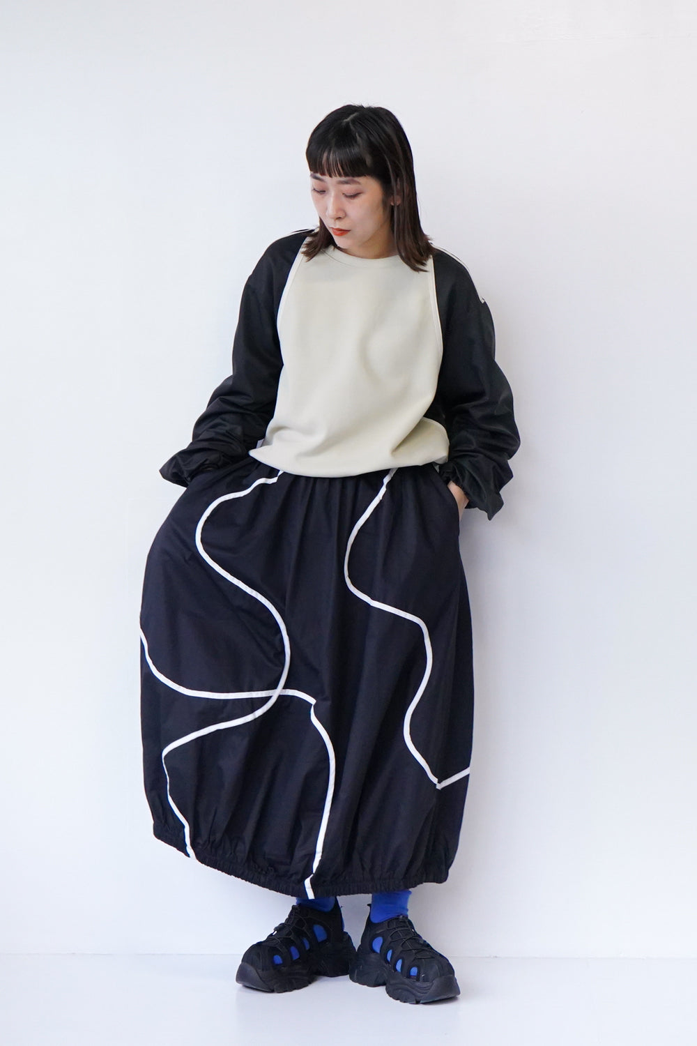 ホワイトラインのパイピングが個性的なバルーンスカート。ウエストはゴム仕様でストレスフリーに着用可能。裾にもしっかりゴムが入っているのでシルエットをキープ。透け感はなく1枚で安心して着用できる素材感なのも嬉しいポイント◎