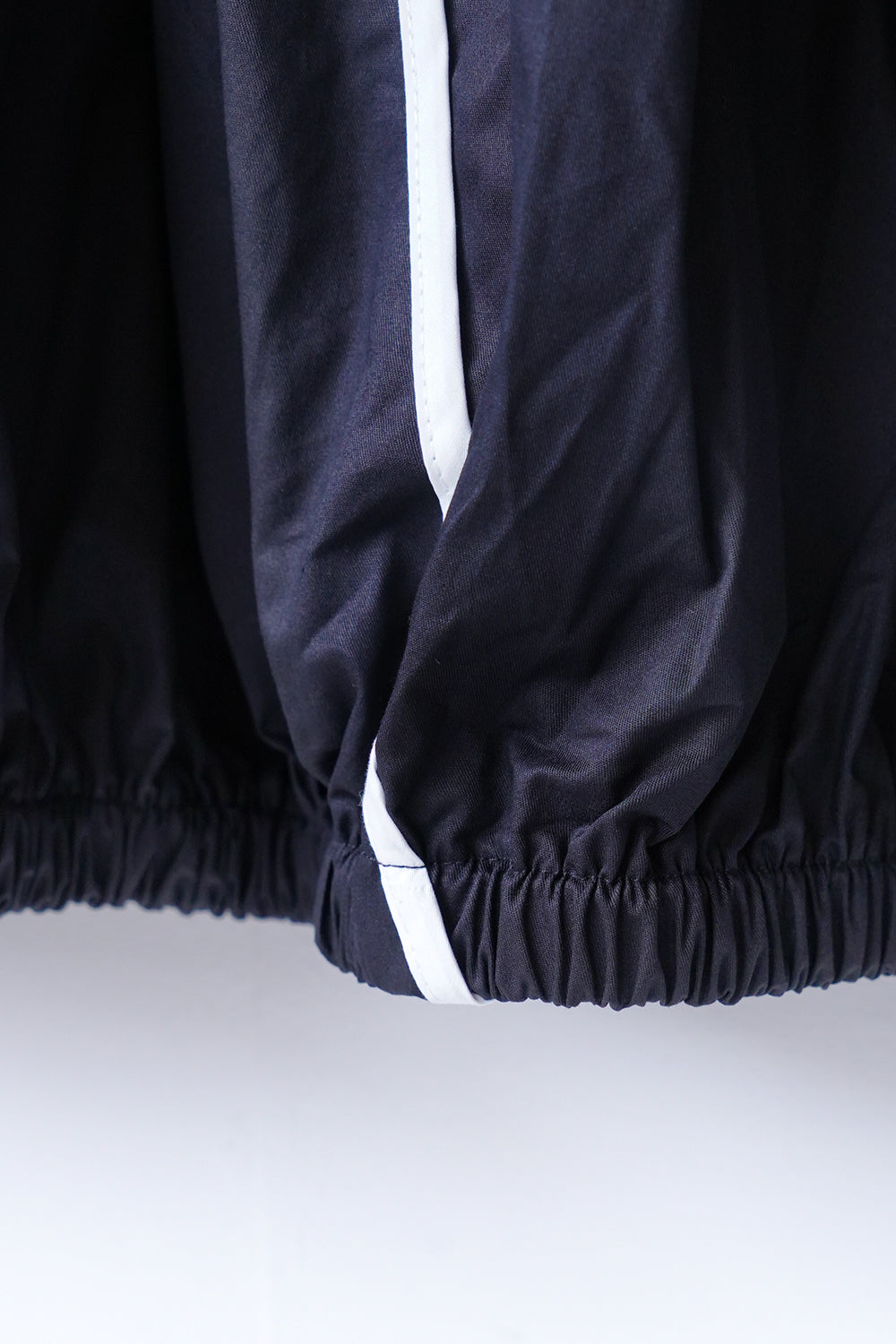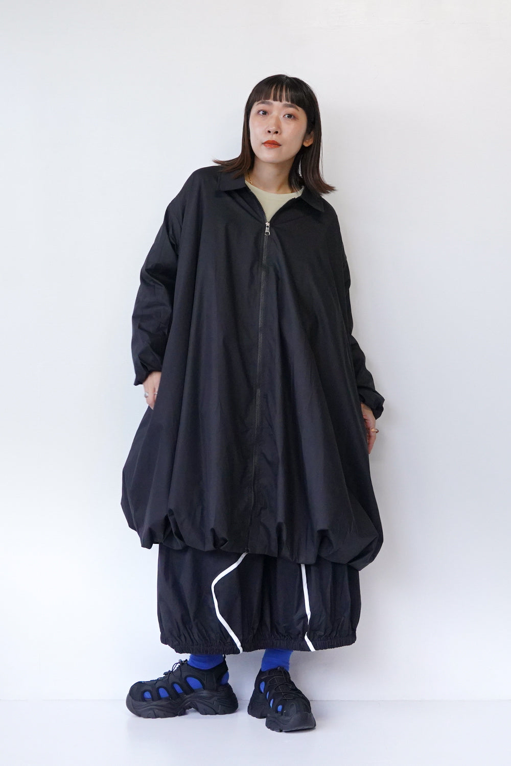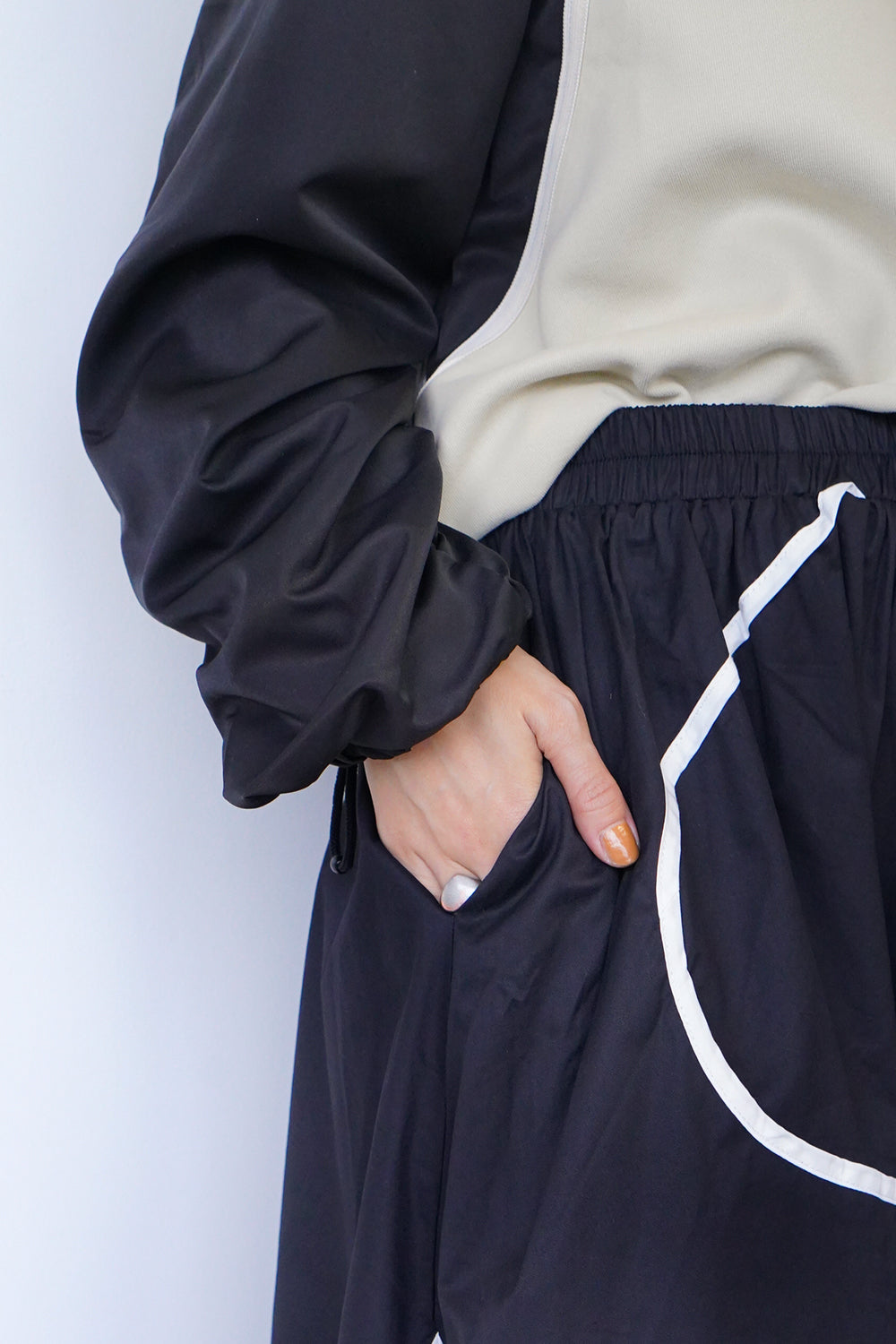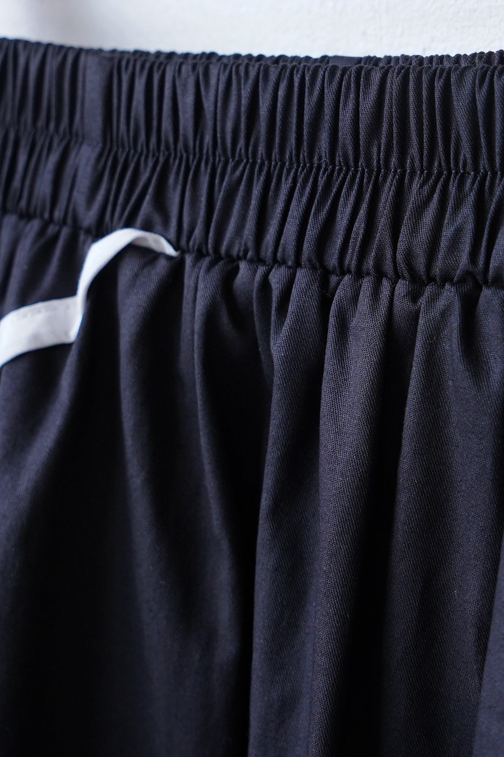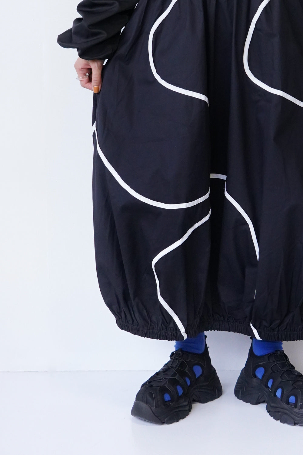 ホワイトラインのパイピングが個性的なバルーンスカート。ウエストはゴム仕様でストレスフリーに着用可能。裾にもしっかりゴムが入っているのでシルエットをキープ。透け感はなく1枚で安心して着用できる素材感なのも嬉しいポイント◎