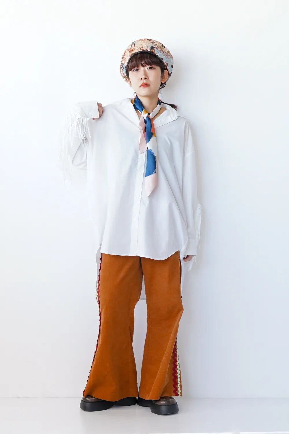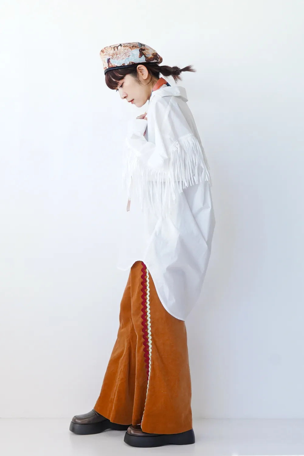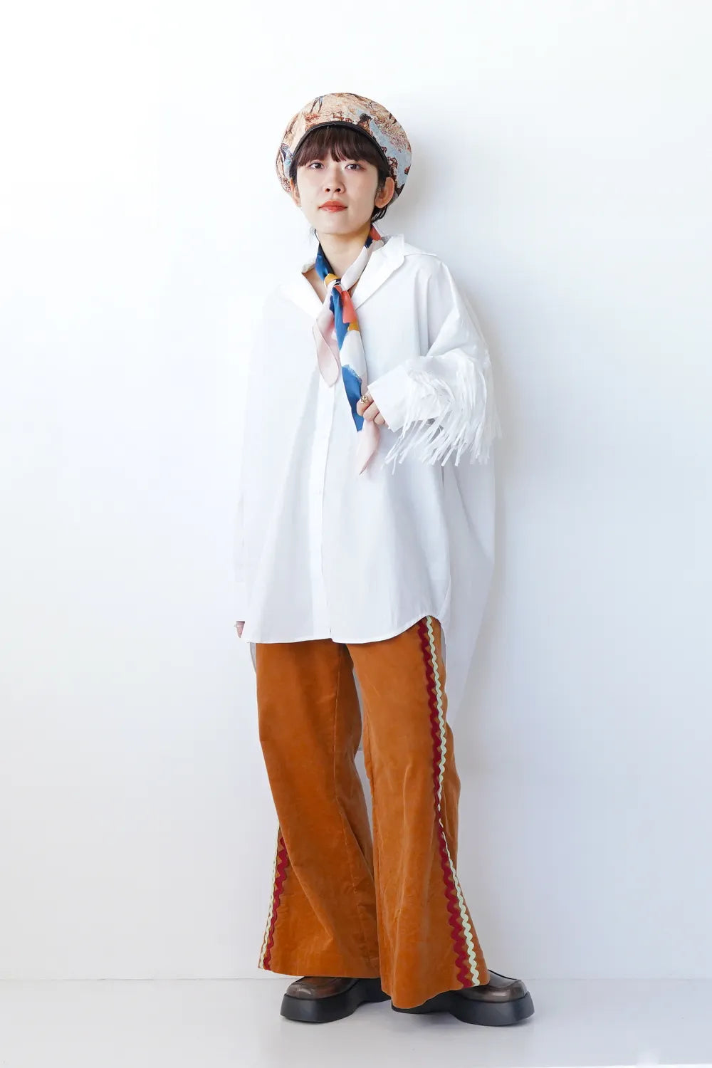 かっちりシャツにフリンジデザインの組み合わせが珍しいチュニックシャツ!シンプルに着ても可愛いですが、襟を抜いてスカーフをアクセントに、春を意識したウエスタン風スタイルです◎