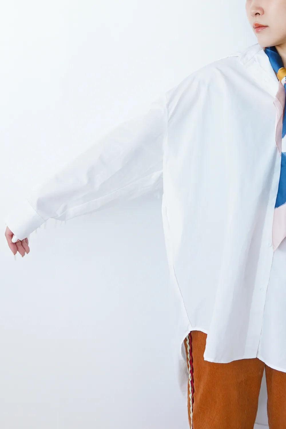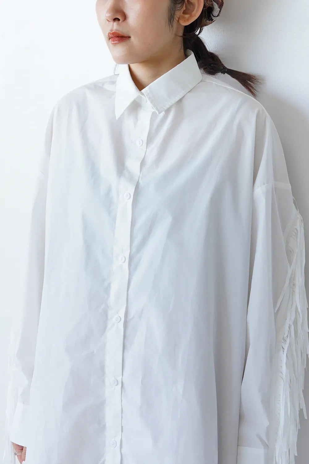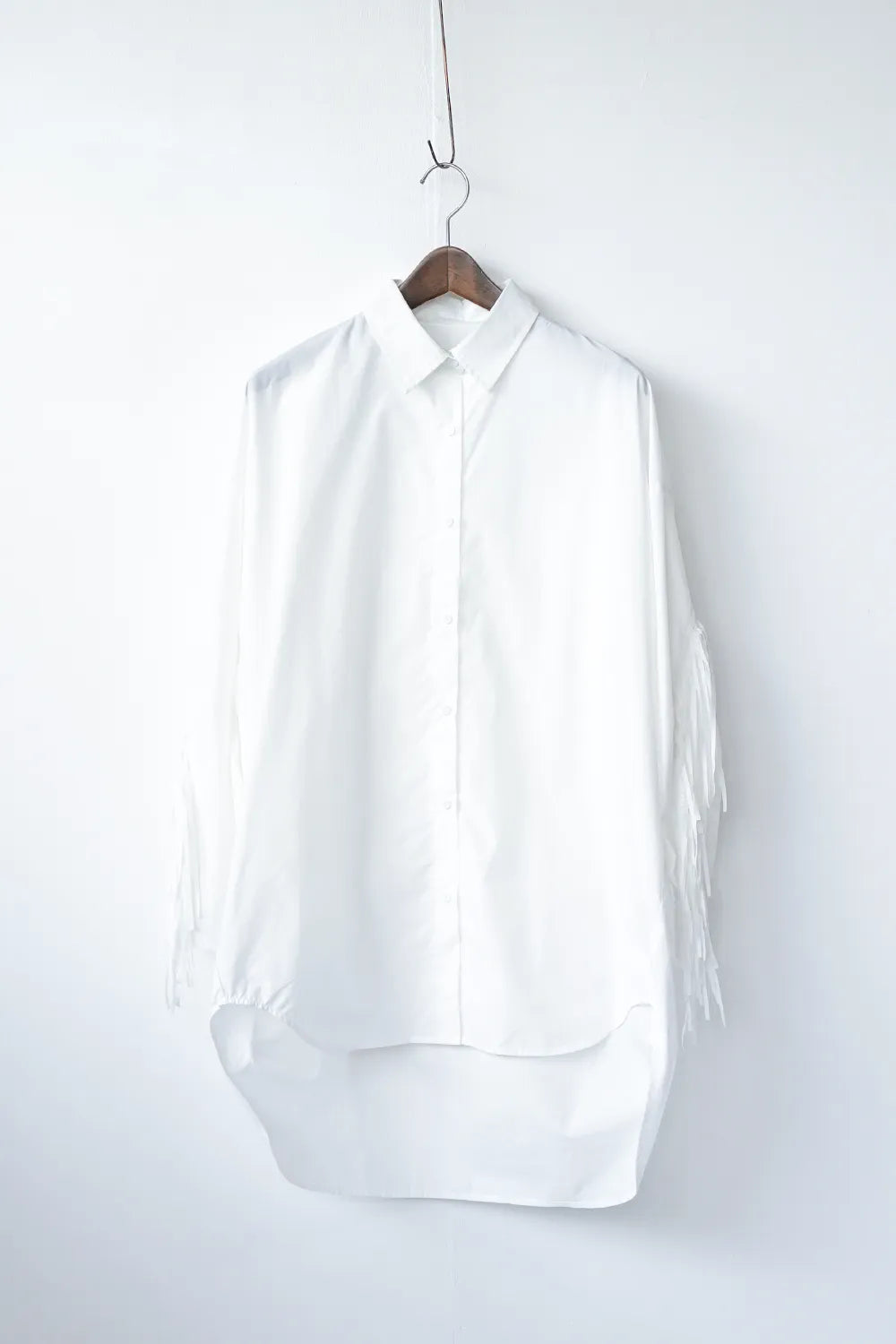 かっちりシャツにフリンジデザインの組み合わせが珍しいチュニックシャツ!シンプルに着ても可愛いですが、襟を抜いてスカーフをアクセントに、春を意識したウエスタン風スタイルです◎