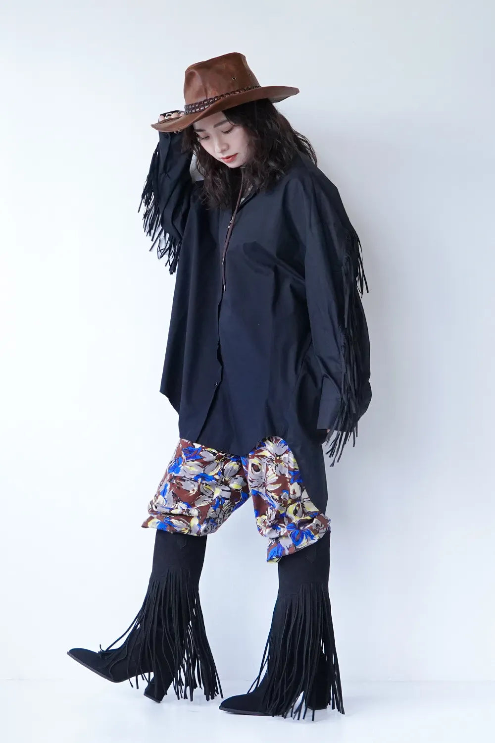 バックフリンジがカントリーな雰囲気を醸し出すシャツは、柄パンとロングブーツでよりコンセプトあるスタイルに。フリンジシャツ×フリンジブーツでディティールを合わせたのもポイント♪