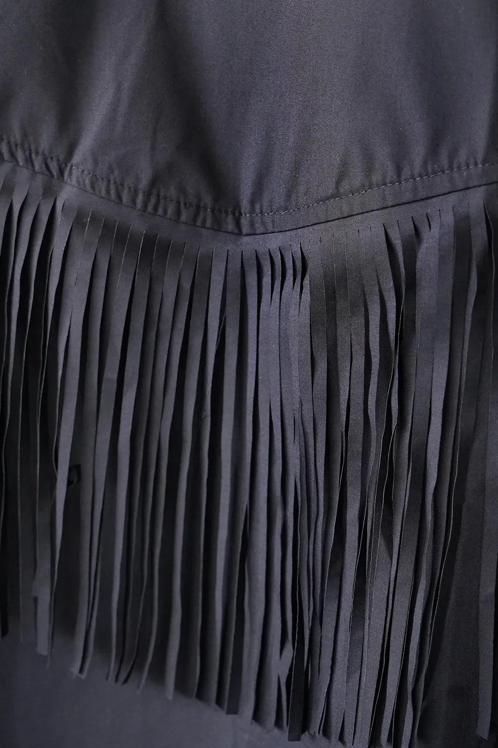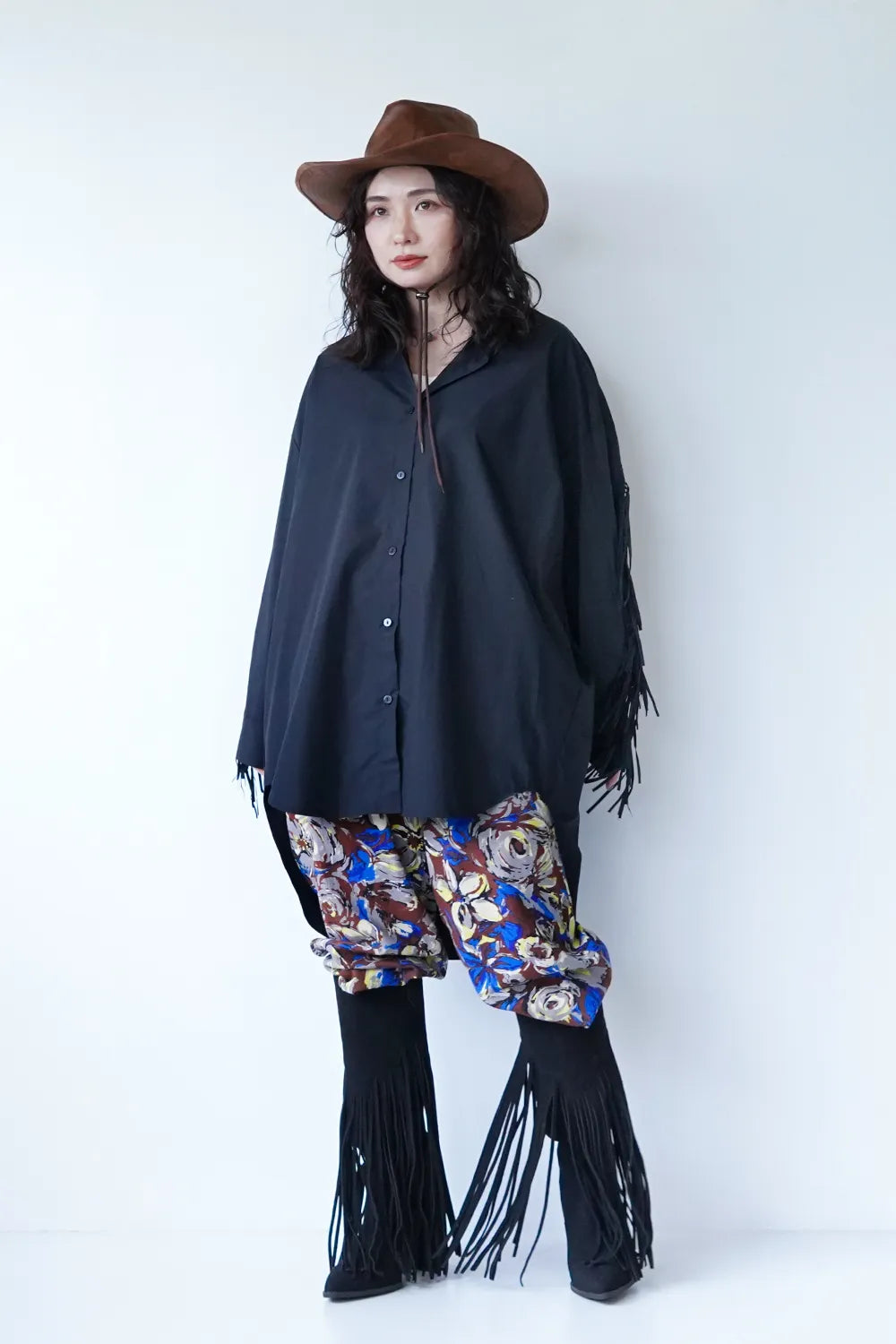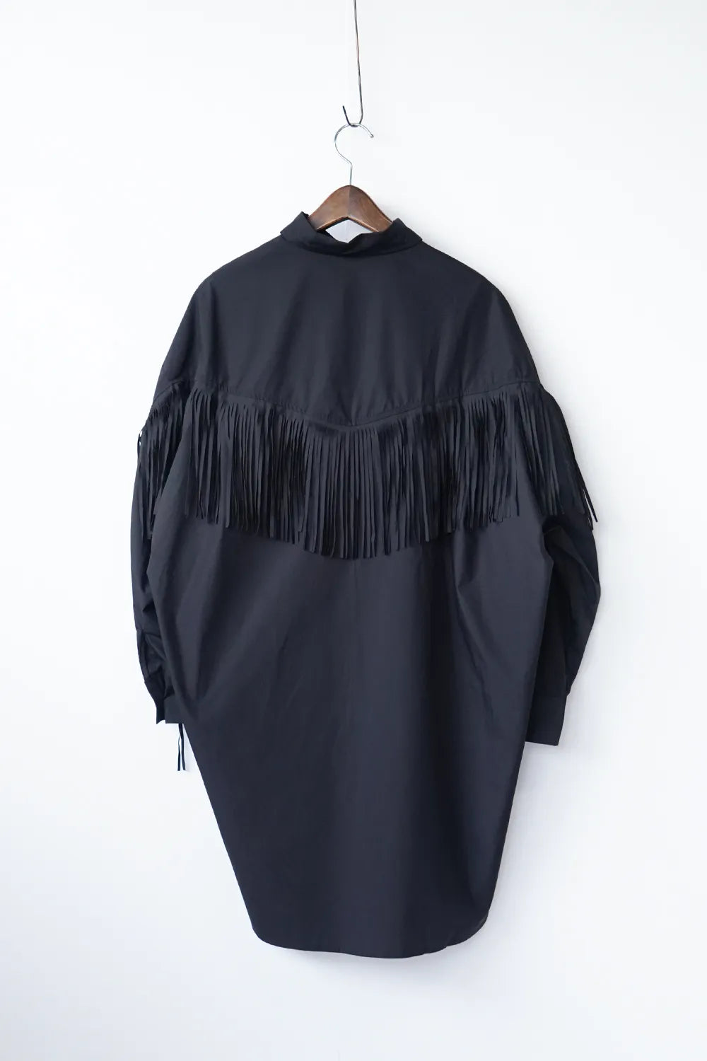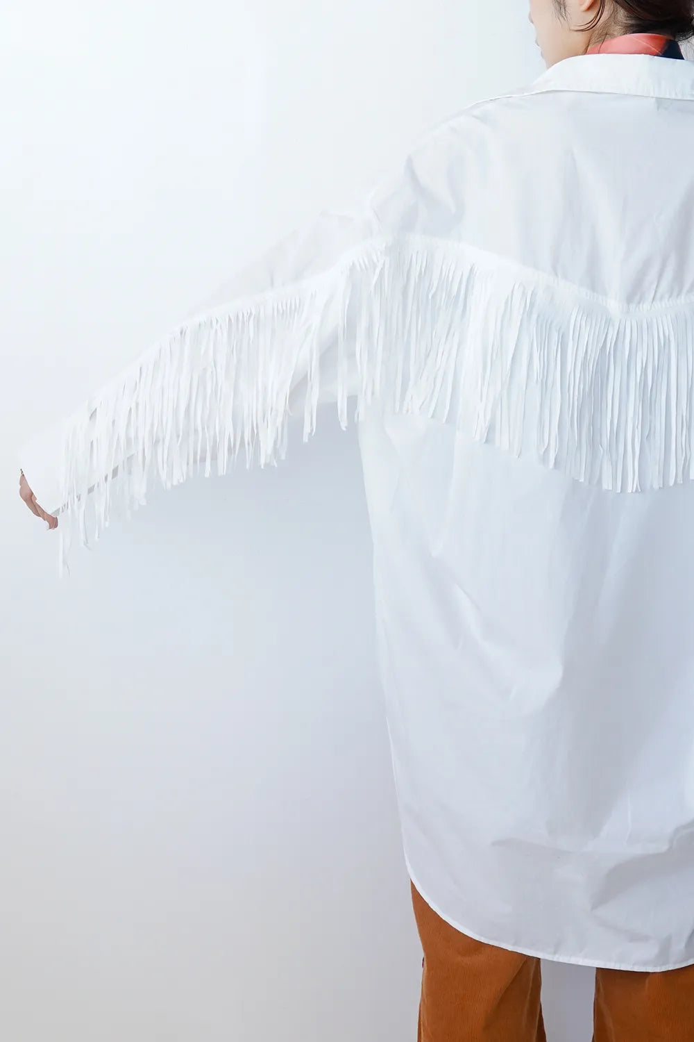 存在感抜群のフリンジチュニックシャツ。ウエスタンライクな雰囲気を持ちつつも、モノトーンカラーが都会的な印象。動くたびに揺れるフリンジがポイント。身幅はたっぷりとしていて前後差があるので体系カバーにも◎コーデの主役になるおすすめアイテムです。