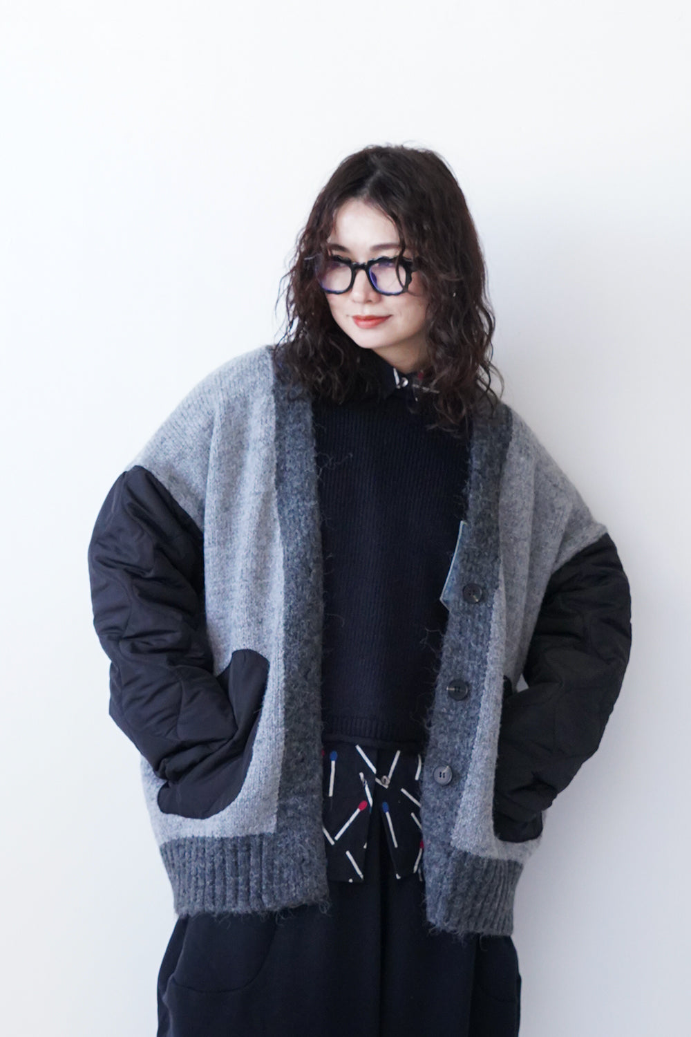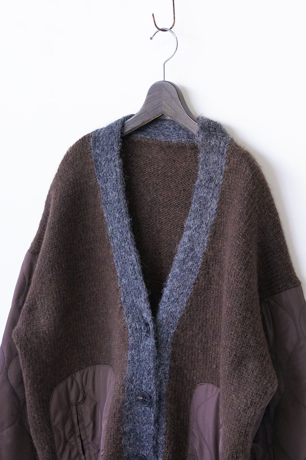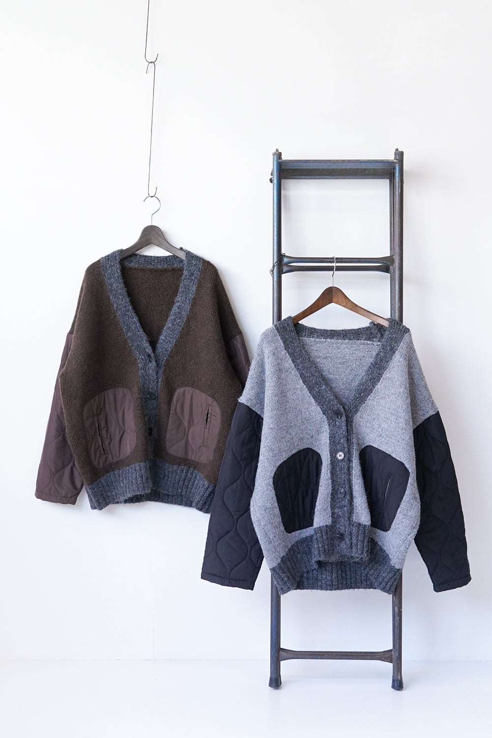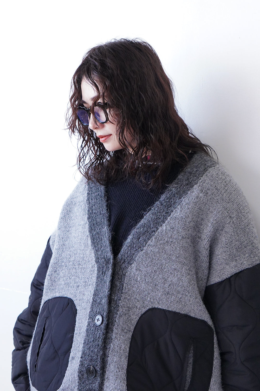 キルトとニットがドッキングした珍しいデザインのカーディガン。配色使いやくり抜きポケットなどデザインポイントが詰まった1枚。たっぷりの身幅とお尻まで隠れる丈感が体系カバーにも◎首元は深めのVネックですっきりと大人らしい印象に。
